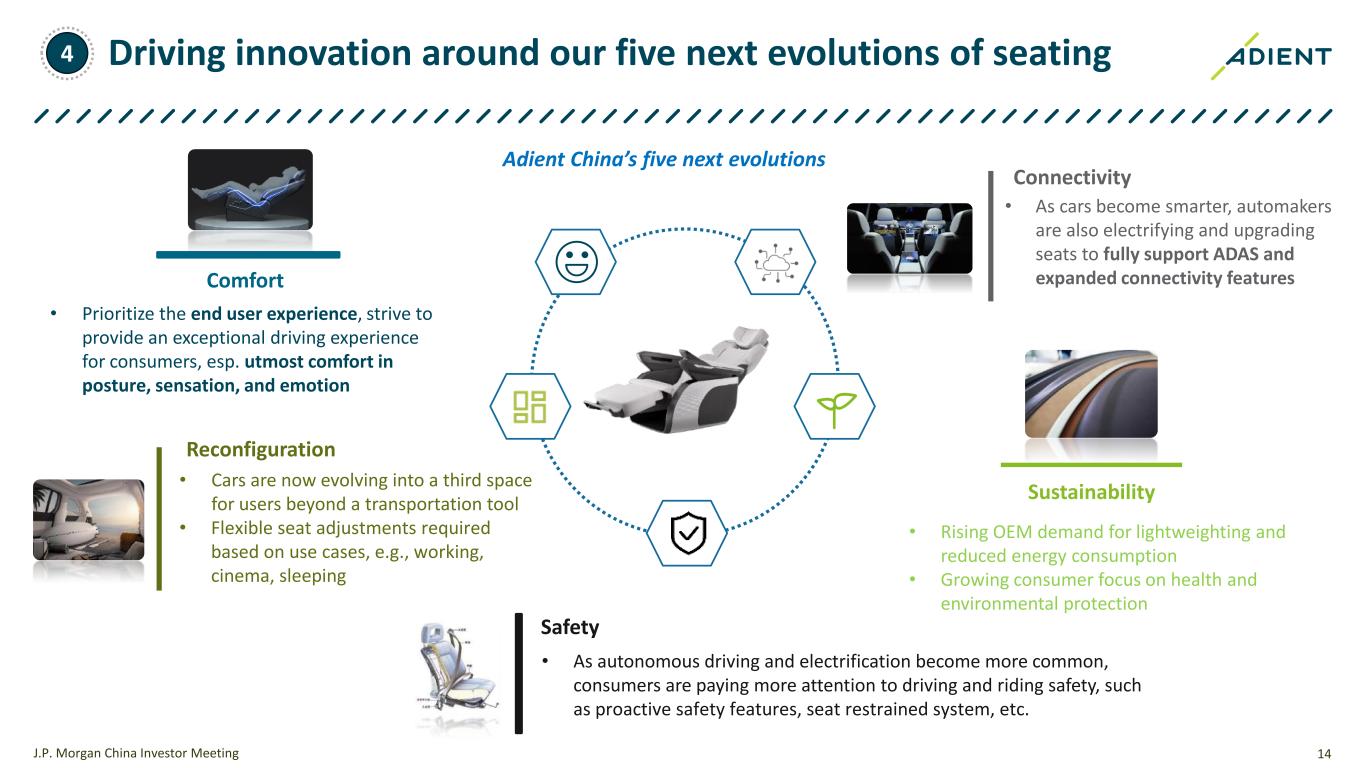 We are upgrading our world-class, fully capable Technical Centers Adient Chongqing Tech Center Expansion and Test Kit Add J.P. Morgan China Investor Meeting > New facilities: sled test lab, exhibition hall, ID studio room, prototype shop, benchmarking room > A highly collaborative, flexible, digitalized, and innovative work environment for our engineering and technical staff in China will be created to lead the product innovation in electrification and smartification of automotive seating industry, and strengthen the synergy with global technical centers MAST Lab (Yuzui Plant) Sled Test Center (Yuzui Plant) Show Room (HMP) 4 13 Currently under construction (since Dec 2023) Future look (opening expected in 6 months) …