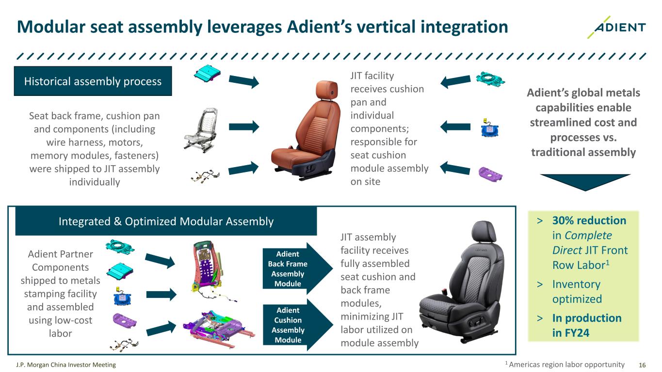 15 Recently set up JV with a local comfort system supplier to industrialize innovative mechanical massage system J.P. Morgan China Investor Meeting 5 > Mechanical massage is a first-ever innovative product in the market that Adient China and Jinbo has jointly developed: > Much stronger effects of relieving occupant fatigue than traditional pneumatic massage solutions > Multiple modes and strengths available > Small size and compatible with heating, ventilation, etc. > Mass production will be ready in FY2024 > In April 2024, Adient and Jinbo formed a joint venture to further strengthen our successful co-development partnership in China, and better capture the growing seating content and China specific market needs > This Adient led JV will focus on industrializing innovated mechanical massage system and other innovative products, which allows us to better serve our customers globally through a more vertically integrated supply chain and maximized synergies by leveraging the capabilities and advantages of both sides • Adient recently established a JV partnership with a local comfort system supplier Jinbo in China to drive content growth, product innovation, and enhance in-house capabilities in comfort system