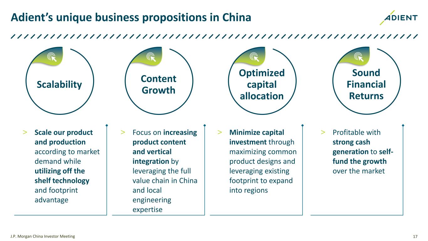 Modular seat assembly leverages Adient’s vertical integration 16 JIT facility receives cushion pan and individual components; responsible for seat cushion module assembly on site JIT assembly facility receives fully assembled seat cushion and back frame modules, minimizing JIT labor utilized on module assembly Adient Partner Components shipped to metals stamping facility and assembled using low-cost labor Historical assembly process Integrated & Optimized Modular Assembly Seat back frame, cushion pan and components (including wire harness, motors, memory modules, fasteners) were shipped to JIT assembly individually > 30% reduction in Complete Direct JIT Front Row Labor1 > Inventory optimized > In production in FY24 Adient’s global metals capabilities enable streamlined cost and processes vs. traditional assembly Adient Cushion Assembly Module Adient Back Frame Assembly Module J.P. Morgan China Investor Meeting 1 Americas region labor opportunity
