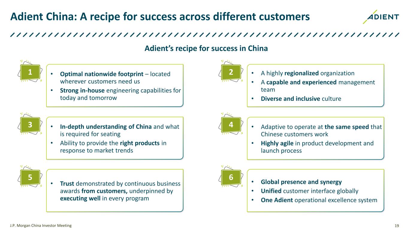 19 Adient China: A recipe for success across different customers J.P. Morgan China Investor Meeting Adient’s recipe for success in China 1 • Global presence and synergy • Unified customer interface globally • One Adient operational excellence system 3 • A highly regionalized organization • A capable and experienced management team • Diverse and inclusive culture 5 • Adaptive to operate at the same speed that Chinese customers work • Highly agile in product development and launch process 2• Optimal nationwide footprint – located wherever customers need us • Strong in-house engineering capabilities for today and tomorrow 4• In-depth understanding of China and what is required for seating • Ability to provide the right products in response to market trends 6 • Trust demonstrated by continuous business awards from customers, underpinned by executing well in every program
