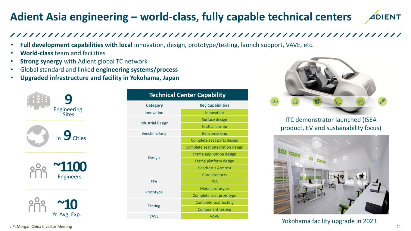 Volkswagen Magotan seats Hongqi H9 seats GAC Trumpchi M8 seats Mercedes-Benz GLA-Class seats Volkswagen ID.6 Crozz seats Mercedes-Benz GLB-Class seats Volkswagen ID.4 Crozz seats Toyota Harrier seats Volkswagen Tayron X seats Adient continues to take the lead of J.D. Power China seat quality ranking and received 9 awards in 2023 20 = 9 awards for 3 WOFE/JVs across 7 segments 6 x x 1 x 2 Adient China received 9 awards in J.D. Power 2023 China Initial Quality Study Compact Premium SUV Midsize/Large BEV SUV Midsize Upper Car Large MPV Large SUV Midsize Premium Car Midsize Upper SUV J.P. Morgan China Investor Meeting