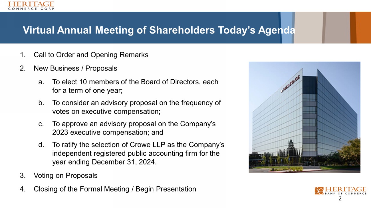 Virtual Annual Meeting of Shareholders Today’s Agenda 1. Call to Order and Opening Remarks 2. New Business / Proposals a. To elect 10 members of the Board of Directors, each for a term of one year; b. To consider an advisory proposal on the frequency of votes on executive compensation; c. To approve an advisory proposal on the Company’s 2023 executive compensation; and d. To ratify the selection of Crowe LLP as the Company’s independent registered public accounting firm for the year ending December 31, 2024. 3. Voting on Proposals 4. Closing of the Formal Meeting / Begin Presentation 2
