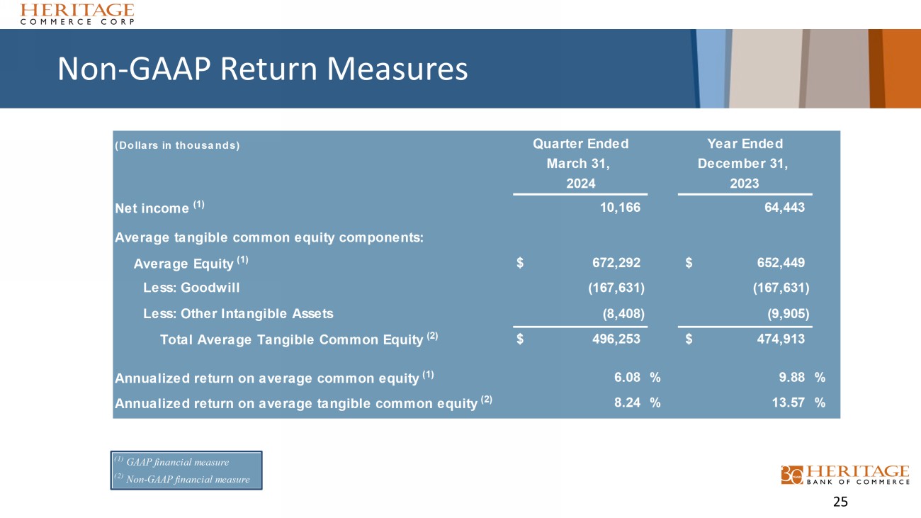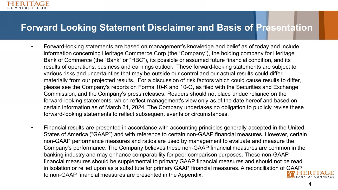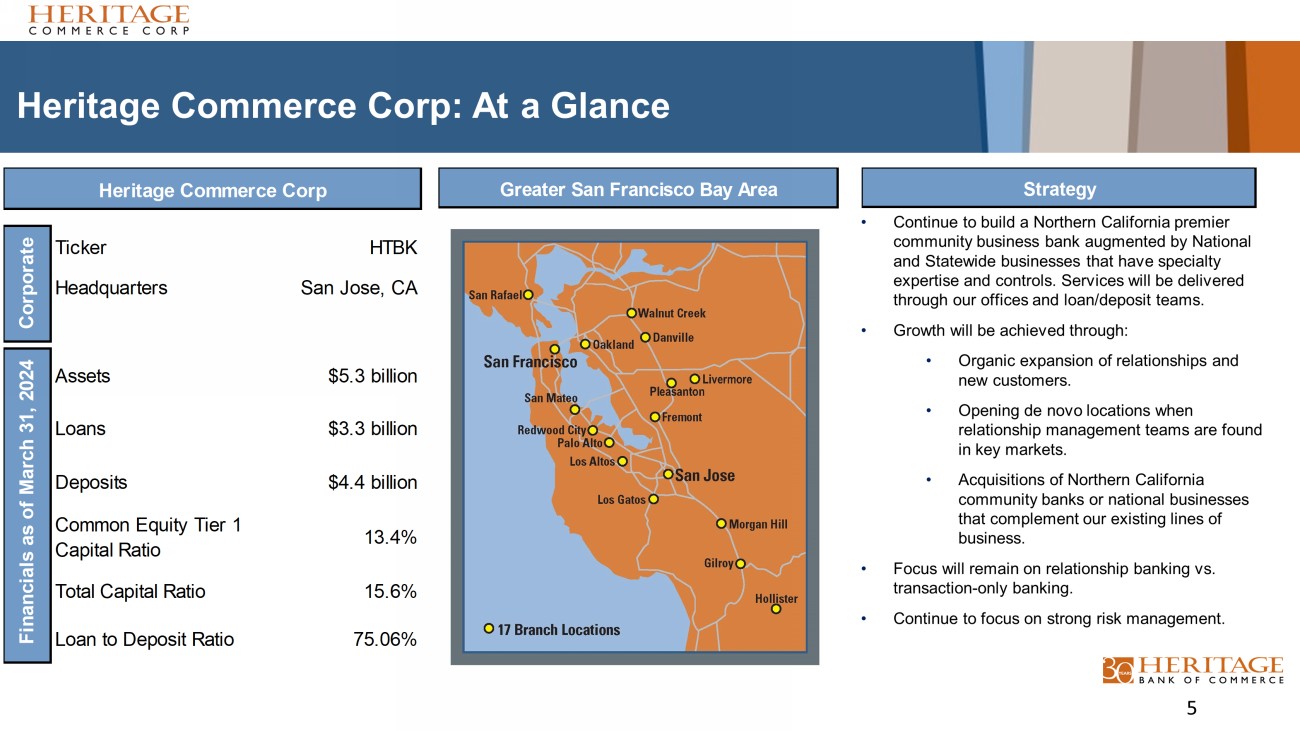 Forward Looking Statement Disclaimer and Basis of Presentation 4 • Forward - looking statements are based on management’s knowledge and belief as of today and include information concerning Heritage Commerce Corp (the “Company”), the holding company for Heritage Bank of Commerce (the “Bank” or “HBC”), its possible or assumed future financial condition, and its results of operations, business and earnings outlook. These forward - looking statements are subject to various risks and uncertainties that may be outside our control and our actual results could differ materially from our projected results. For a discussion of risk factors which could cause results to differ, please see the Company’s reports on Forms 10 - K and 10 - Q, as filed with the Securities and Exchange Commission, and the Company’s press releases. Readers should not place undue reliance on the forward - looking statements, which reflect management's view only as of the date hereof and based on certain information as of March 31, 2024. The Company undertakes no obligation to publicly revise these forward - looking statements to reflect subsequent events or circumstances. • Financial results are presented in accordance with accounting principles generally accepted in the United States of America (“GAAP”) and with reference to certain non - GAAP financial measures. However, certain non - GAAP performance measures and ratios are used by management to evaluate and measure the Company’s performance. The Company believes these non - GAAP financial measures are common in the banking industry and may enhance comparability for peer comparison purposes. These non - GAAP financial measures should be supplemental to primary GAAP financial measures and should not be read in isolation or relied upon as a substitute for primary GAAP financial measures. A reconciliation of GAAP to non - GAAP financial measures are presented in the Appendix.