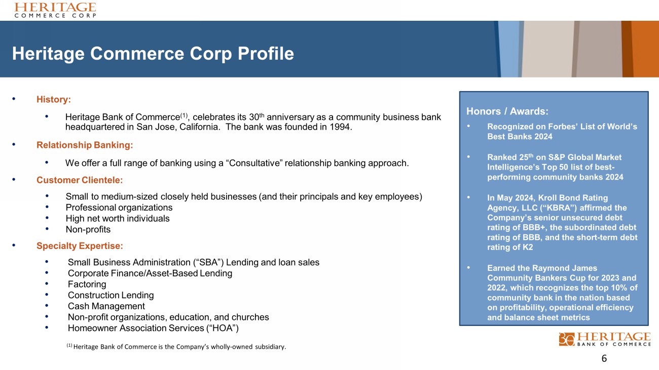 Heritage Commerce Corp: At a Glance • Continue to build a Northern California premier community business bank augmented by National and Statewide businesses that have specialty expertise and controls. Services will be delivered through our offices and loan/deposit teams. • Growth will be achieved through: • Organic expansion of relationships and new customers. • Opening de novo locations when relationship management teams are found in key markets. • Acquisitions of Northern California community banks or national businesses that complement our existing lines of business. • Focus will remain on relationship banking vs. transaction - only banking. • Continue to focus on strong risk management. 5 Heritage Commerce Corp Greater San Francisco Bay Area Ticker HTBK Headquarters San Jose, CA Assets $5.3 billion Loans $3.3 billion Deposits $4.4 billion 13.4% Total Capital Ratio 15.6% Loan to Deposit Ratio 75.06% Corporate Financials as of March 31, 2024 Common Equity Tier 1 Capital Ratio Greater San Francisco Bay Area Strategy Strategy