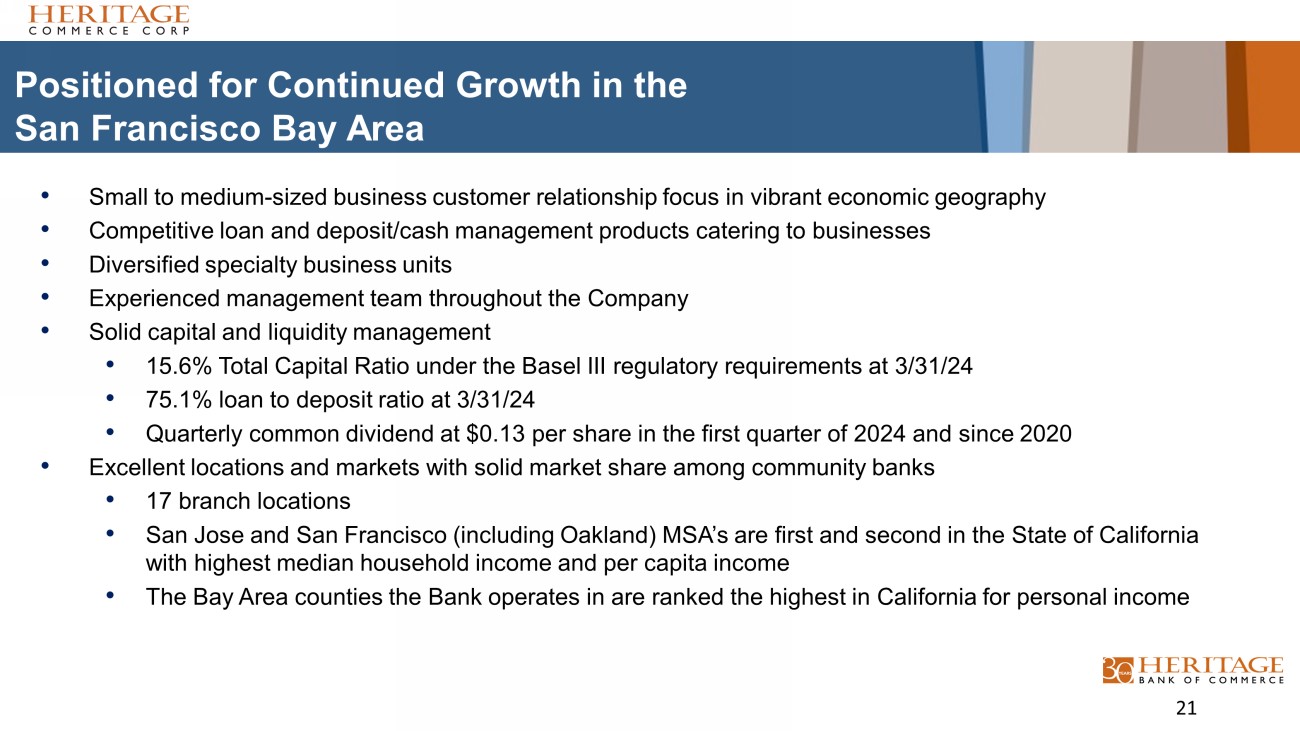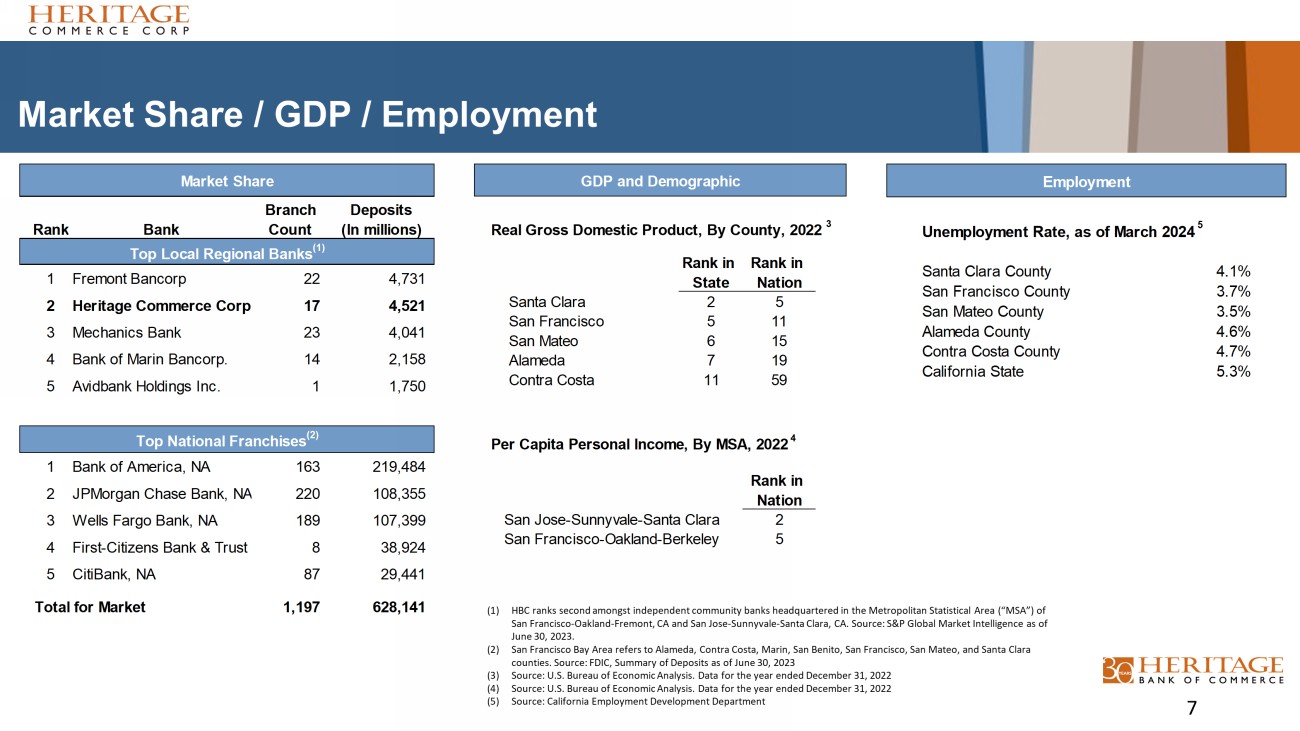 Heritage Commerce Corp Profile • History: • Heritage Bank of Commerce (1) , celebrates its 30 th anniversary as a community business bank headquartered in San Jose, California. The bank was founded in 1994. • Relationship Banking: • We offer a full range of banking using a “Consultative” relationship banking approach. • Customer Clientele: • Small to medium - sized closely held businesses (and their principals and key employees) • Professional organizations • High net worth individuals • Non - profits • Specialty Expertise: • Small Business Administration (“SBA”) Lending and loan sales • Corporate Finance/Asset - Based Lending • Factoring • Construction Lending • Cash Management • Non - profit organizations, education, and churches • Homeowner Association Services (“HOA”) (1) Heritage Bank of Commerce is the Company’s wholly - owned subsidiary. Honors / Awards: • Recognized on Forbes’ List of World’s Best Banks 2024 • Ranked 25 th on S&P Global Market Intelligence’s Top 50 list of best - performing community banks 2024 • In May 2024, Kroll Bond Rating Agency, LLC (“KBRA”) affirmed the Company’s senior unsecured debt rating of BBB+, the subordinated debt rating of BBB, and the short - term debt rating of K2 • Earned the Raymond James Community Bankers Cup for 2023 and 2022, which recognizes the top 10% of community bank in the nation based on profitability, operational efficiency and balance sheet metrics 6