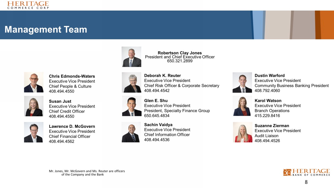 Market Share / GDP / Employment (1) HBC ranks second amongst inde pendent community banks headquartered in t he Metropolitan Statistical Area (“MSA”) of San Francisco - Oakland - Fremont, CA and San J ose - Sunnyvale - Santa Clara, CA. Source: S&P Global Market Intelligence as of June 30, 2023. (2) San Francisco Bay Area refers to Alameda, Contra Costa, Marin, San Benito, San Francisco, San Mateo, and Santa Clara counties. Source: FDIC, Summary of Deposits as of June 30, 2023 (3) Source: U.S. Bureau of Economic Analysis. Data for the year ended December 31, 2022 (4) Source: U.S. Bureau of Economic Analysis. Data for the year ended December 31, 2022 (5) Source: California Employment Development Department 7 Employment Unemployment Rate, as of March 2024 5 Santa Clara County 4.1% San Francisco County 3.7% San Mateo County 3.5% Alameda County 4.6% Contra Costa County 4.7% California State 5.3% GDP and Demographic Real Gross Domestic Product, By County, 2022 3 Rank in State Rank in Nation Santa Clara 2 5 San Francisco 5 11 San Mateo 6 15 Alameda 7 19 Contra Costa 11 59 Per Capita Personal Income, By MSA, 2022 4 Rank in Nation San Jose-Sunnyvale-Santa Clara 2 San Francisco-Oakland-Berkeley 5 Market Share Branch Deposits Rank Bank Count (In millions) 1 Fremont Bancorp 22 4,731 2 Heritage Commerce Corp 17 4,521 3 Mechanics Bank 23 4,041 4 Bank of Marin Bancorp. 14 2,158 5 Avidbank Holdings Inc. 1 1,750 1 Bank of America, NA 163 219,484 2 JPMorgan Chase Bank, NA 220 108,355 3 Wells Fargo Bank, NA 189 107,399 4 First-Citizens Bank & Trust 8 38,924 5 CitiBank, NA 87 29,441 Total for Market 1,197 628,141 Top Local Regional Banks (1) Top National Franchises (2)