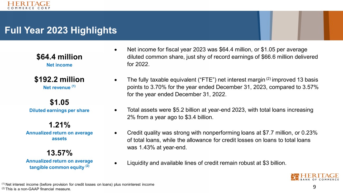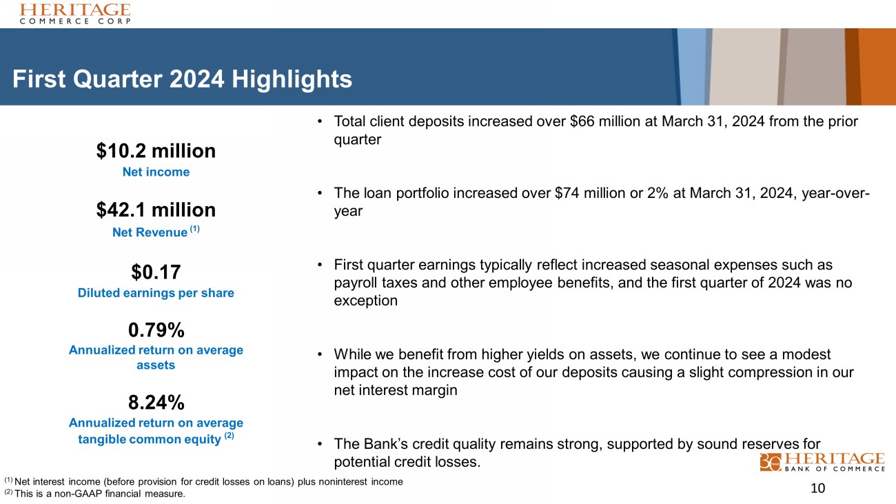 Full Year 2023 Highlights Net income for fiscal year 2023 was $64.4 million, or $1.05 per average diluted common share, just shy of record earnings of $66.6 million delivered for 2022. The fully taxable equivalent (“FTE”) net interest margin (2) improved 13 basis points to 3.70% for the year ended December 31, 2023, compared to 3.57% for the year ended December 31, 2022. Total assets were $5.2 billion at year - end 2023, with total loans increasing 2% from a year ago to $3.4 billion. Credit quality was strong with nonperforming loans at $7.7 million, or 0.23% of total loans, while the allowance for credit losses on loans to total loans was 1.43% at year - end. Liquidity and available lines of credit remain robust at $3 billion. 9 $64.4 million Net income $192.2 million Net revenue (1) $1.05 Diluted earnings per share 1.21% Annualized return on average assets 13.57% Annualized return on average tangible common equity (2) (1) Net interest income (before provision for credit losses on loans) plus noninterest income (2) This is a non - GAAP financial measure.