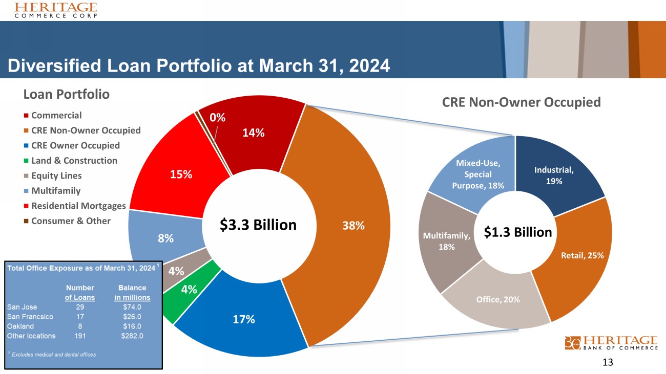 Loan Portfolio Attributes at the First Quarter 2024 • Excluding residential mortgage principal paydowns, loans increased $112.8 million, or 4% from a year ago. • Commercial and industrial line utilization was 28% compared to 31% a year ago. • Approximately 26% of the Company’s loan portfolio consisted of floating rate loans, compared to 31% a year ago. • There were 23 new Commercial Real Estate (CRE) loans originated in the first quarter of 2024 totaling $40 million with a weighted average LTV (1) and DSCR (2) for non - owner occupied of 51% and 1.84 times, respectively. • The weighted average LTV (1) and DSCR (2) for the non - owner occupied office portfolio were 42.6% and 1.83 times, respectively. • The average loan size for all CRE loans was $1.6 million, with the office CRE subsegment also at $1.6 million. • The Company has personal guarantees on 92% of its CRE portfolio. Many of the unguaranteed CRE loans were made to credit - worthy non - profit organizations. 12 (1) LTV is an abbreviation for Loan - to - Value (2) DSCR is an abbreviation for Debt Service Coverage Ratio