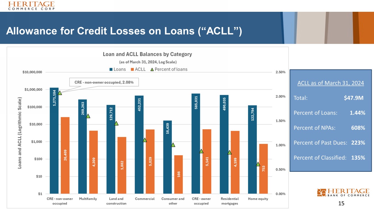 Credit Quality at a Glance at First Quarter 2024 x 13 borrowers in NPAs totaling $7.9 million x No CRE loans included in NPAs x No foreclosed assets on the balance sheet x No Shared National Credits (“SNCs”) or material purchased participations x Classified assets totaled $35.4 million, or 0.67% of total assets *Loans 30 days or more past due. 0.64% Delinquencies* / Loans 0.15% Nonperforming Assets ("NPAs") / Total Assets 0.03% Net Charge - offs / Average Loans 14 $0 $5,000 $10,000 $15,000 $20,000 $25,000 2018 2019 2020 2021 2022 2023 2024Q1 Delinquencies Real Estate Loans Const Develop Loans Consumer Loans Commercial Loans $ in thousands $0 $5,000 $10,000 $15,000 2018 2019 2020 2021 2022 2023 2024Q1 Nonperforming Assets Real Estate Loans Const Develop Loans Consumer Loans Commercial Loans $ in thousands