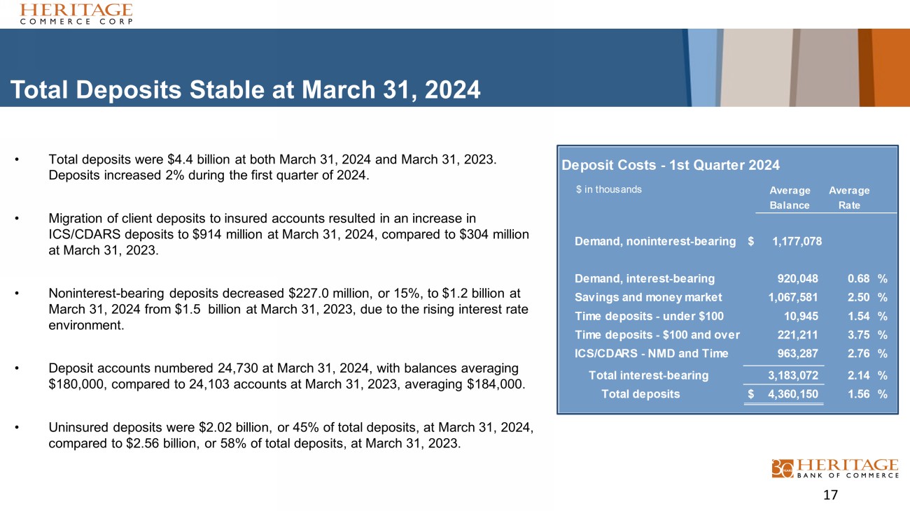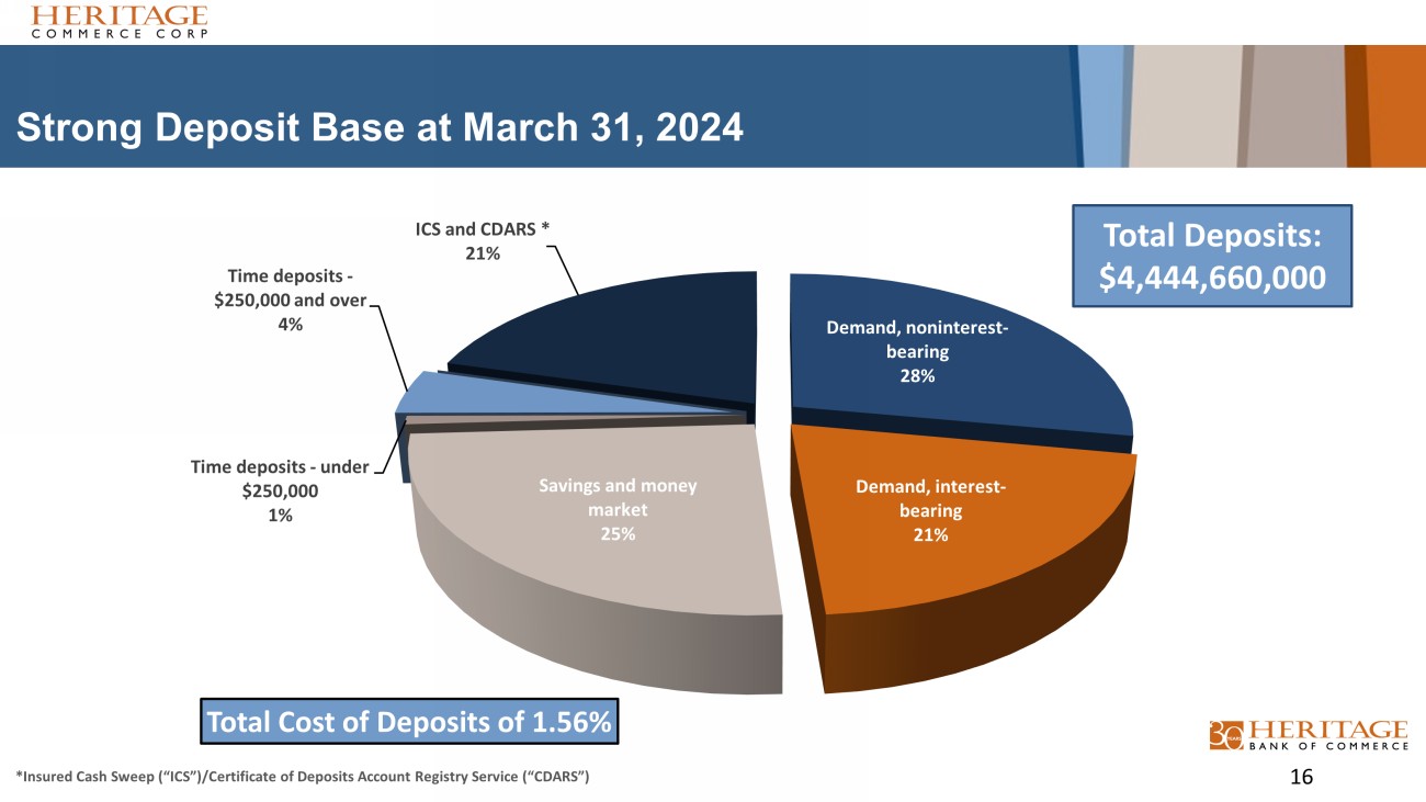 Strong Deposit Base at March 31, 2024 Demand, noninterest - bearing 28% Demand, interest - bearing 21% Savings and money market 25% Time deposits - under $250,000 1% Time deposits - $250,000 and over 4% ICS and CDARS * 21% Total Cost of Deposits of 1.56% *Insured Cash Sweep (“ICS”)/Certificate of Deposits Account Registry Service (“CDARS”) Total Deposits: $4,444,660,000 16