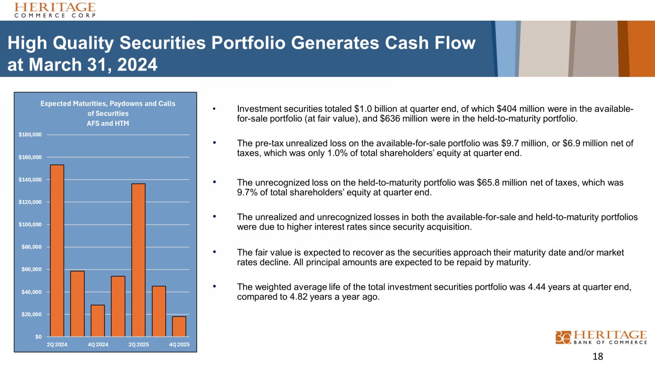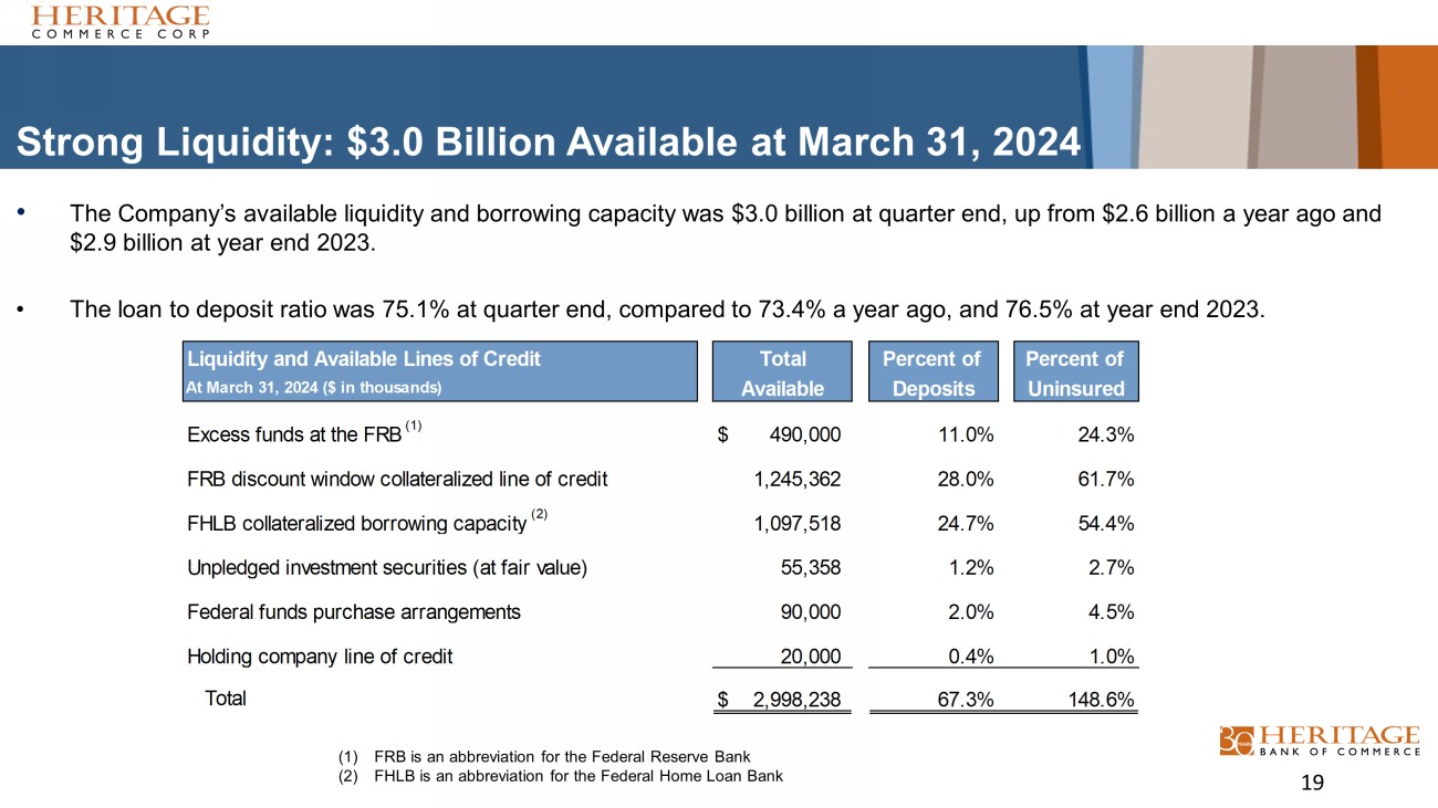 High Quality Securities Portfolio Generates Cash Flow at March 31, 2024 • Investment securities totaled $1.0 billion at quarter end, of which $404 million were in the available - for - sale portfolio (at fair value), and $636 million were in the held - to - maturity portfolio. • The pre - tax unrealized loss on the available - for - sale portfolio was $9.7 million, or $6.9 million net of taxes, which was only 1.0% of total shareholders’ equity at quarter end. • The unrecognized loss on the held - to - maturity portfolio was $65.8 million net of taxes, which was 9.7% of total shareholders’ equity at quarter end. • The unrealized and unrecognized losses in both the available - for - sale and held - to - maturity portfolios were due to higher interest rates since security acquisition. • The fair value is expected to recover as the securities approach their maturity date and/or market rates decline. All principal amounts are expected to be repaid by maturity. • The weighted average life of the total investment securities portfolio was 4.44 years at quarter end, compared to 4.82 years a year ago. 18 $ in thousands