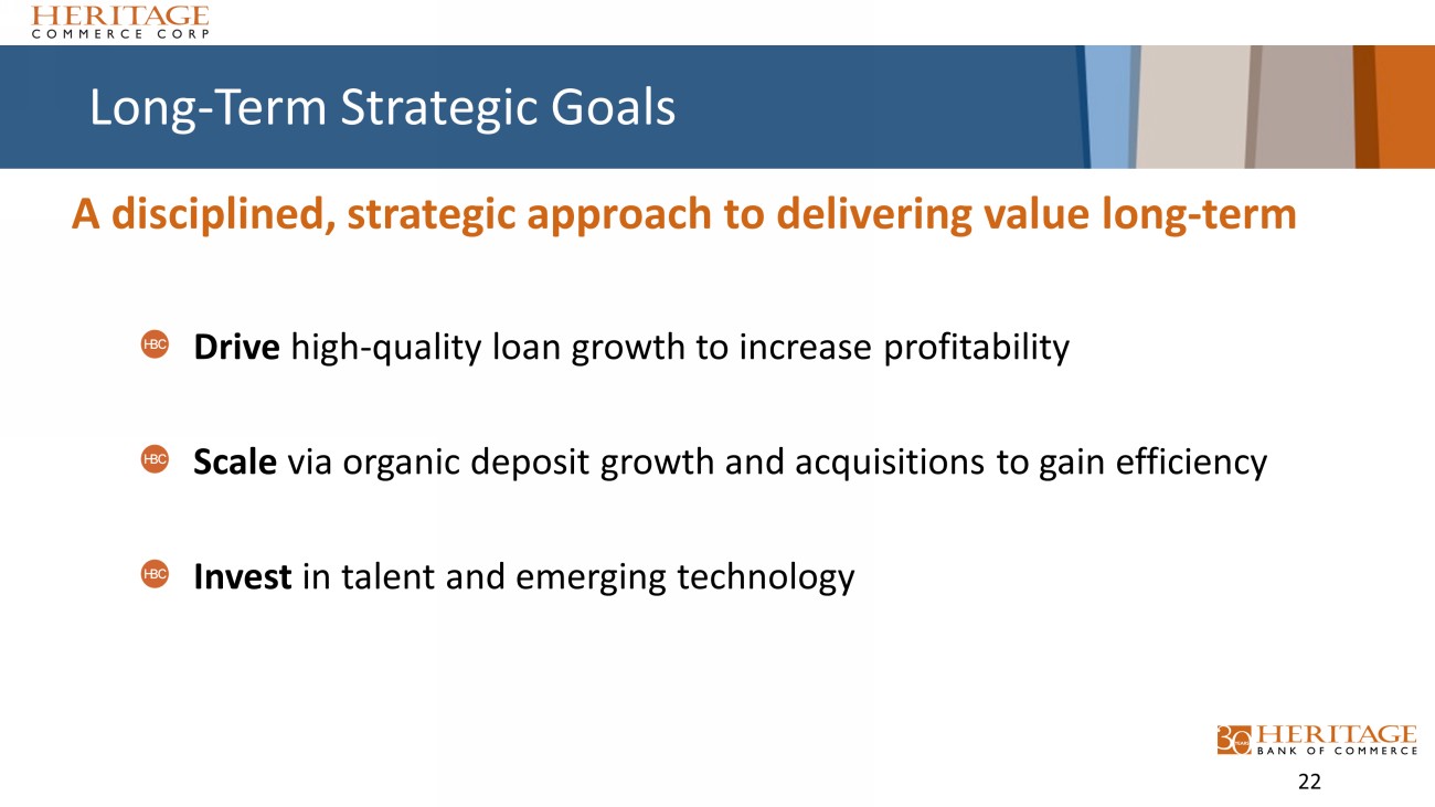 Long - Term Strategic Goals Drive high - quality loan growth to increase profitability Scale via organic deposit growth and acquisitions to gain efficiency Invest in talent and emerging technology A disciplined, strategic approach to delivering value long - term 22