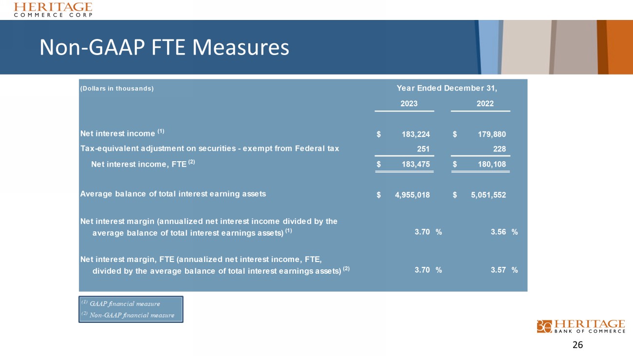 Non - GAAP FTE Measures 26 (Dollars in thousands) Year Ended December 31, 2023 2022 Net interest income (1) $ 183,224 $ 179,880 Tax-equivalent adjustment on securities - exempt from Federal tax 251 228 Net interest income, FTE (2) $ 183,475 $ 180,108 Average balance of total interest earning assets $ 4,955,018 $ 5,051,552 Net interest margin (annualized net interest income divided by the average balance of total interest earnings assets) (1) 3.70 % 3.56 % Net interest margin, FTE (annualized net interest income, FTE, divided by the average balance of total interest earnings assets) (2) 3.70 % 3.57 %