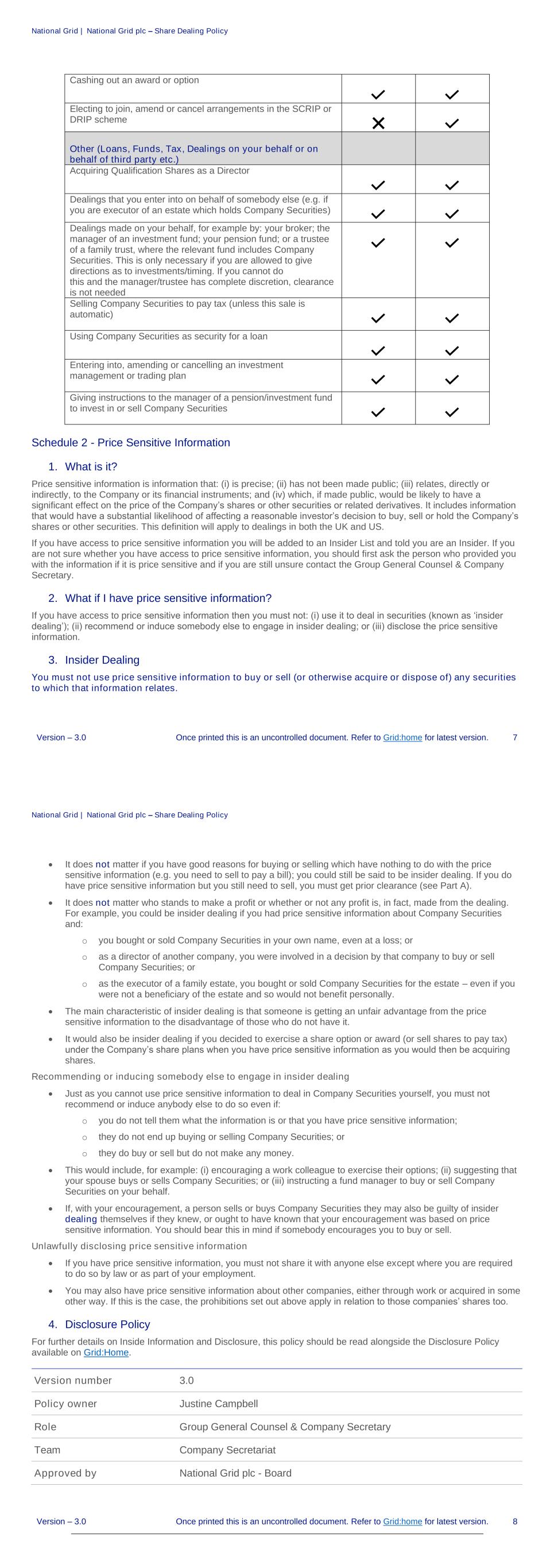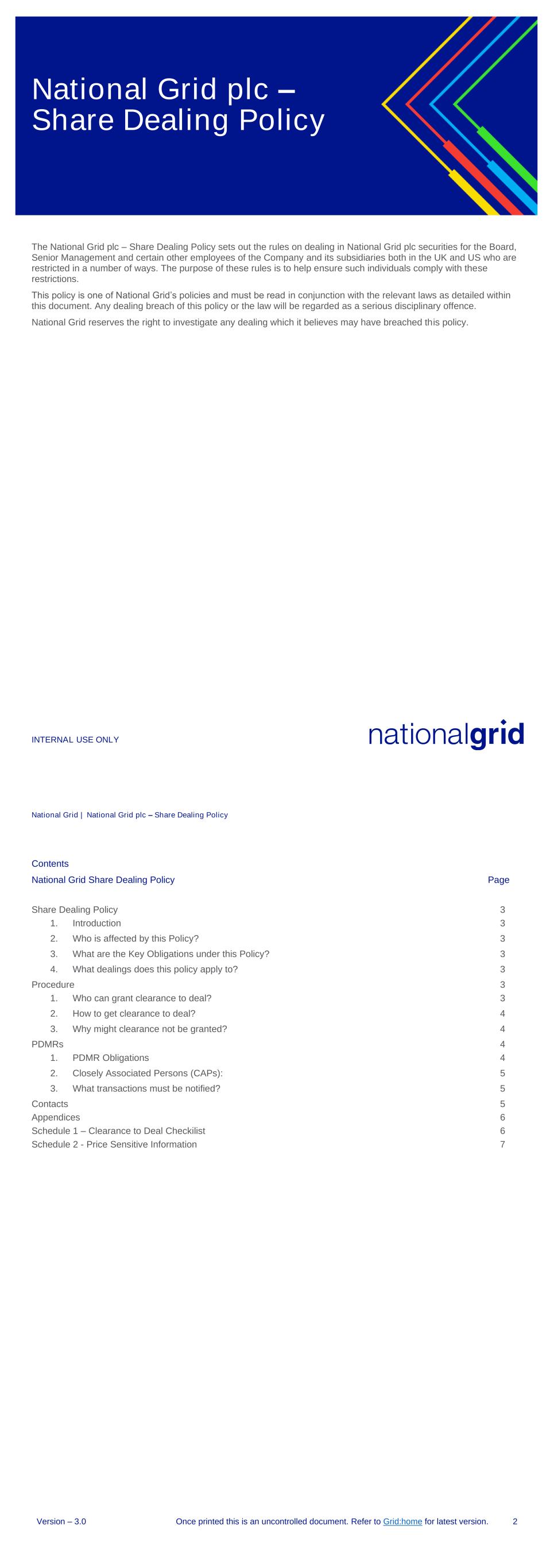 National Grid | National Grid plc – Share Dealing Policy Version – 3.0 Once printed this is an uncontrolled document. Refer to Grid:home for latest version. 9 Date approved 26 July 2021 Review date 01 May 2023 Amendments Version Date Change details 2 7-Oct-21 PDMRs updated 3 3-Nov-22 Key Contacts updated