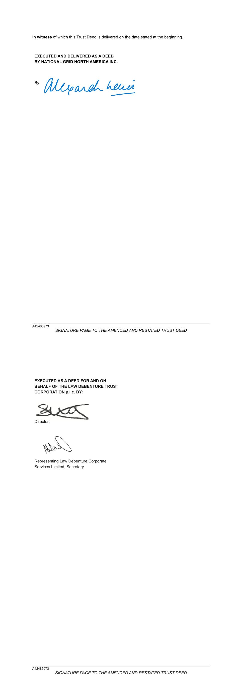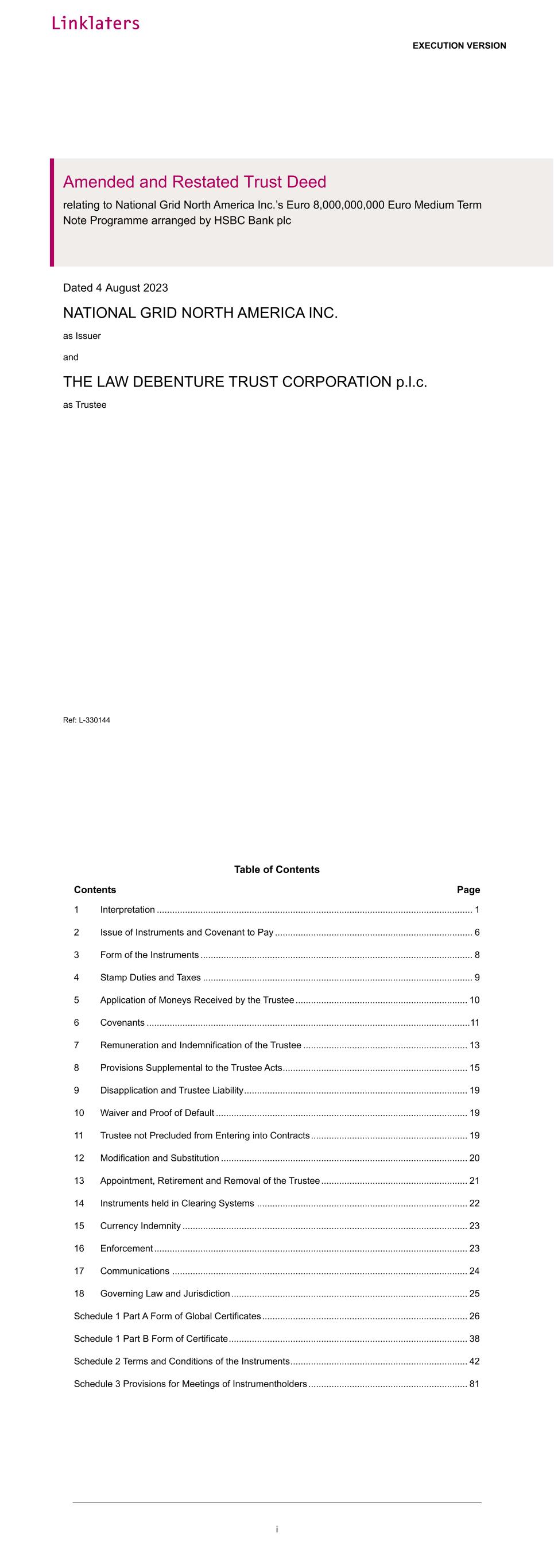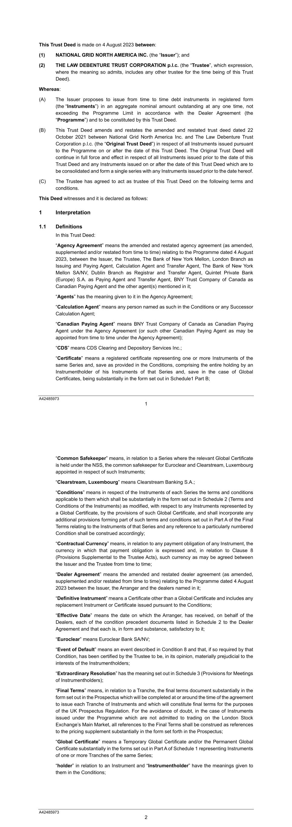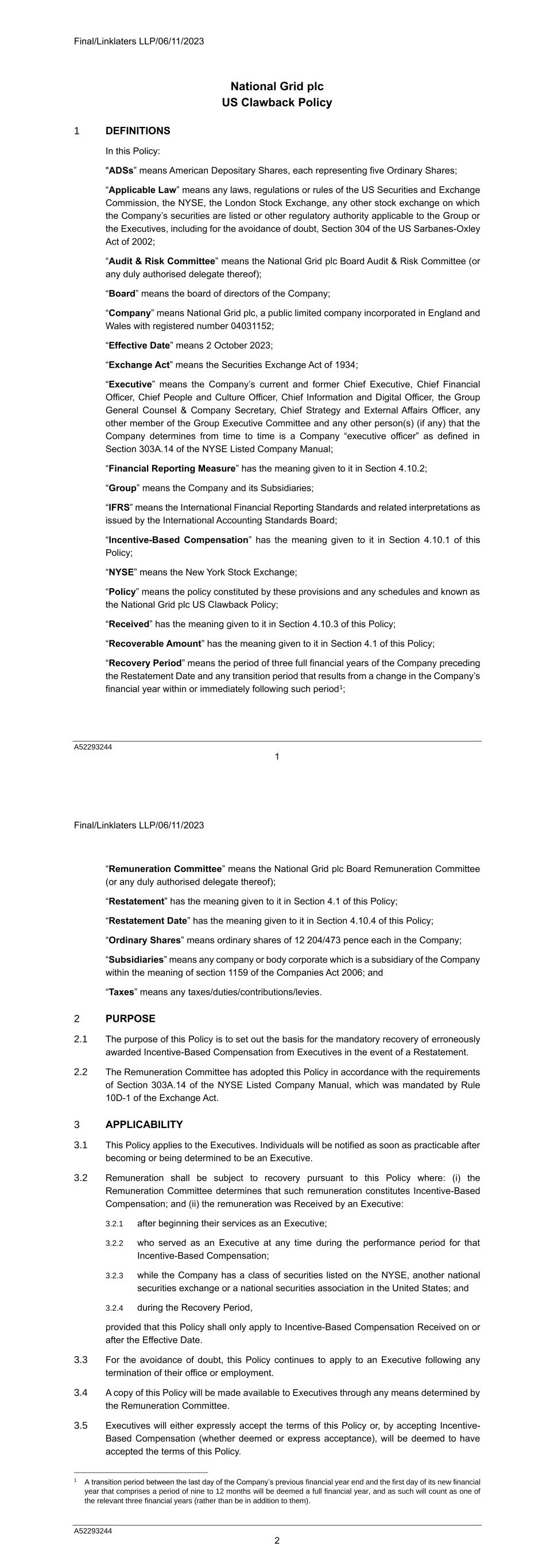 Final/Linklaters LLP/06/11/2023 A52293244 1 National Grid plc US Clawback Policy 1 DEFINITIONS In this Policy: "ADSs” means American Depositary Shares, each representing five Ordinary Shares; “Applicable Law” means any laws, regulations or rules of the US Securities and Exchange Commission, the NYSE, the London Stock Exchange, any other stock exchange on which the Company’s securities are listed or other regulatory authority applicable to the Group or the Executives, including for the avoidance of doubt, Section 304 of the US Sarbanes-Oxley Act of 2002; “Audit & Risk Committee” means the National Grid plc Board Audit & Risk Committee (or any duly authorised delegate thereof); “Board” means the board of directors of the Company; “Company” means National Grid plc, a public limited company incorporated in England and Wales with registered number 04031152; “Effective Date” means 2 October 2023; “Exchange Act” means the Securities Exchange Act of 1934; “Executive” means the Company’s current and former Chief Executive, Chief Financial Officer, Chief People and Culture Officer, Chief Information and Digital Officer, the Group General Counsel & Company Secretary, Chief Strategy and External Affairs Officer, any other member of the Group Executive Committee and any other person(s) (if any) that the Company determines from time to time is a Company “executive officer” as defined in Section 303A.14 of the NYSE Listed Company Manual; “Financial Reporting Measure” has the meaning given to it in Section 4.10.2; “Group” means the Company and its Subsidiaries; “IFRS” means the International Financial Reporting Standards and related interpretations as issued by the International Accounting Standards Board; “Incentive-Based Compensation” has the meaning given to it in Section 4.10.1 of this Policy; “NYSE” means the New York Stock Exchange; “Policy” means the policy constituted by these provisions and any schedules and known as the National Grid plc US Clawback Policy; “Received” has the meaning given to it in Section 4.10.3 of this Policy; “Recoverable Amount” has the meaning given to it in Section 4.1 of this Policy; “Recovery Period” means the period of three full financial years of the Company preceding the Restatement Date and any transition period that results from a change in the Company’s financial year within or immediately following such period1; Final/Linklaters LLP/06/11/2023 A52293244 2 “Remuneration Committee” means the National Grid plc Board Remuneration Committee (or any duly authorised delegate thereof); “Restatement” has the meaning given to it in Section 4.1 of this Policy; “Restatement Date” has the meaning given to it in Section 4.10.4 of this Policy; “Ordinary Shares” means ordinary shares of 12 204/473 pence each in the Company; “Subsidiaries” means any company or body corporate which is a subsidiary of the Company within the meaning of section 1159 of the Companies Act 2006; and “Taxes” means any taxes/duties/contributions/levies. 2 PURPOSE 2.1 The purpose of this Policy is to set out the basis for the mandatory recovery of erroneously awarded Incentive-Based Compensation from Executives in the event of a Restatement. 2.2 The Remuneration Committee has adopted this Policy in accordance with the requirements of Section 303A.14 of the NYSE Listed Company Manual, which was mandated by Rule 10D-1 of the Exchange Act. 3 APPLICABILITY 3.1 This Policy applies to the Executives. Individuals will be notified as soon as practicable after becoming or being determined to be an Executive. 3.2 Remuneration shall be subject to recovery pursuant to this Policy where: (i) the Remuneration Committee determines that such remuneration constitutes Incentive-Based Compensation; and (ii) the remuneration was Received by an Executive: 3.2.1 after beginning their services as an Executive; 3.2.2 who served as an Executive at any time during the performance period for that Incentive-Based Compensation; 3.2.3 while the Company has a class of securities listed on the NYSE, another national securities exchange or a national securities association in the United States; and 3.2.4 during the Recovery Period, provided that this Policy shall only apply to Incentive-Based Compensation Received on or after the Effective Date. 3.3 For the avoidance of doubt, this Policy continues to apply to an Executive following any termination of their office or employment. 3.4 A copy of this Policy will be made available to Executives through any means determined by the Remuneration Committee. 3.5 Executives will either expressly accept the terms of this Policy or, by accepting Incentive- Based Compensation (whether deemed or express acceptance), will be deemed to have accepted the terms of this Policy. 1 A transition period between the last day of the Company’s previous financial year end and the first day of its new financial year that comprises a period of nine to 12 months will be deemed a full financial year, and as such will count as one of the relevant three financial years (rather than be in addition to them).