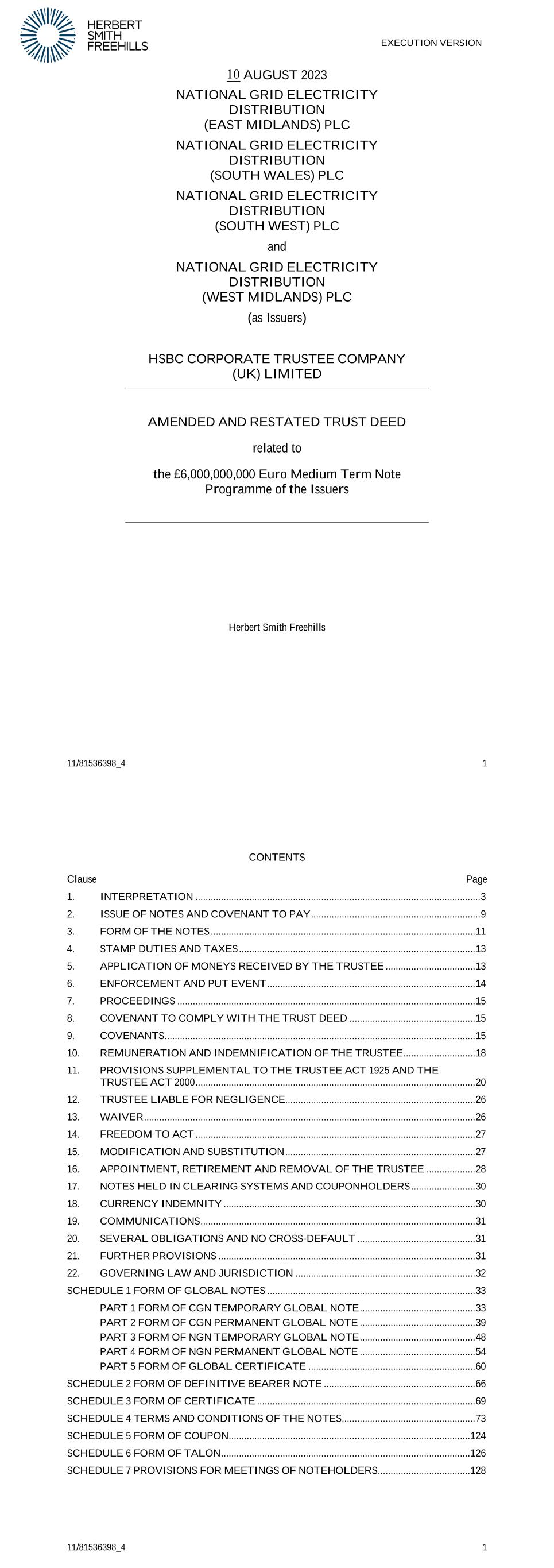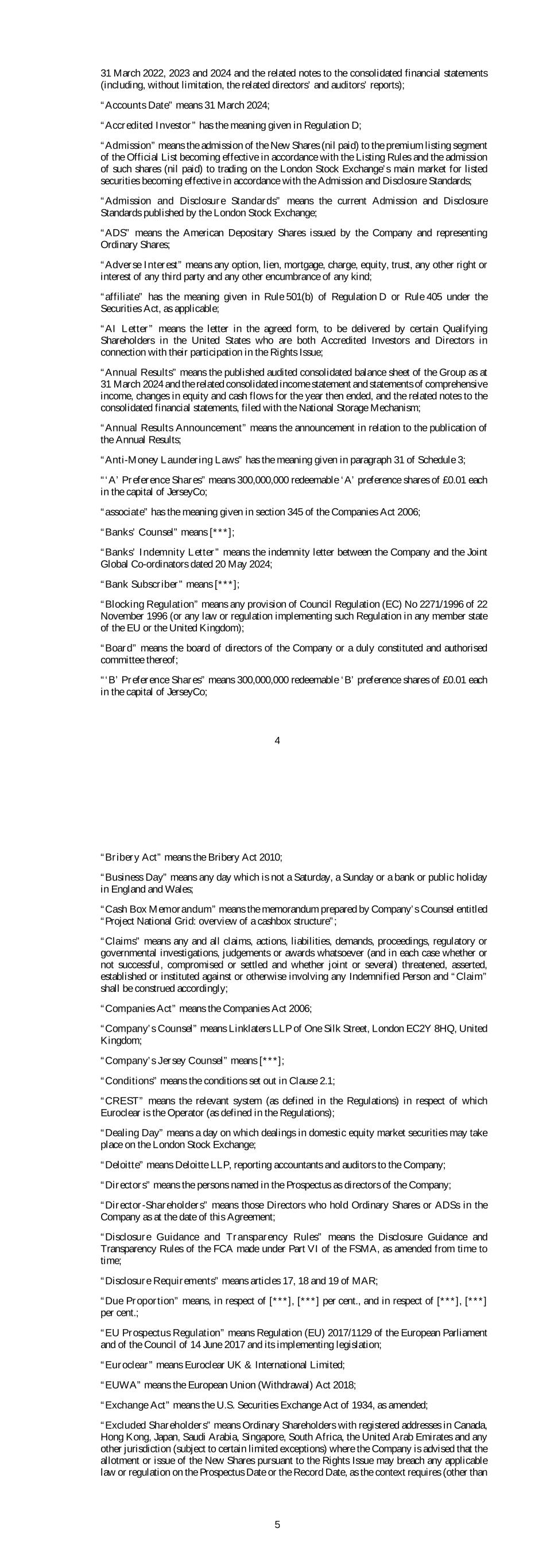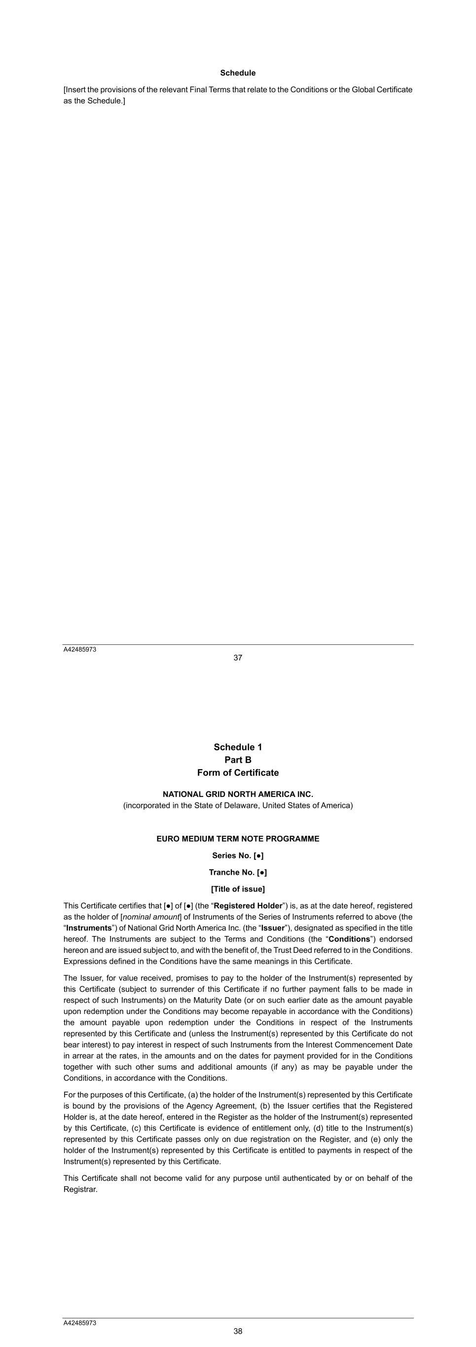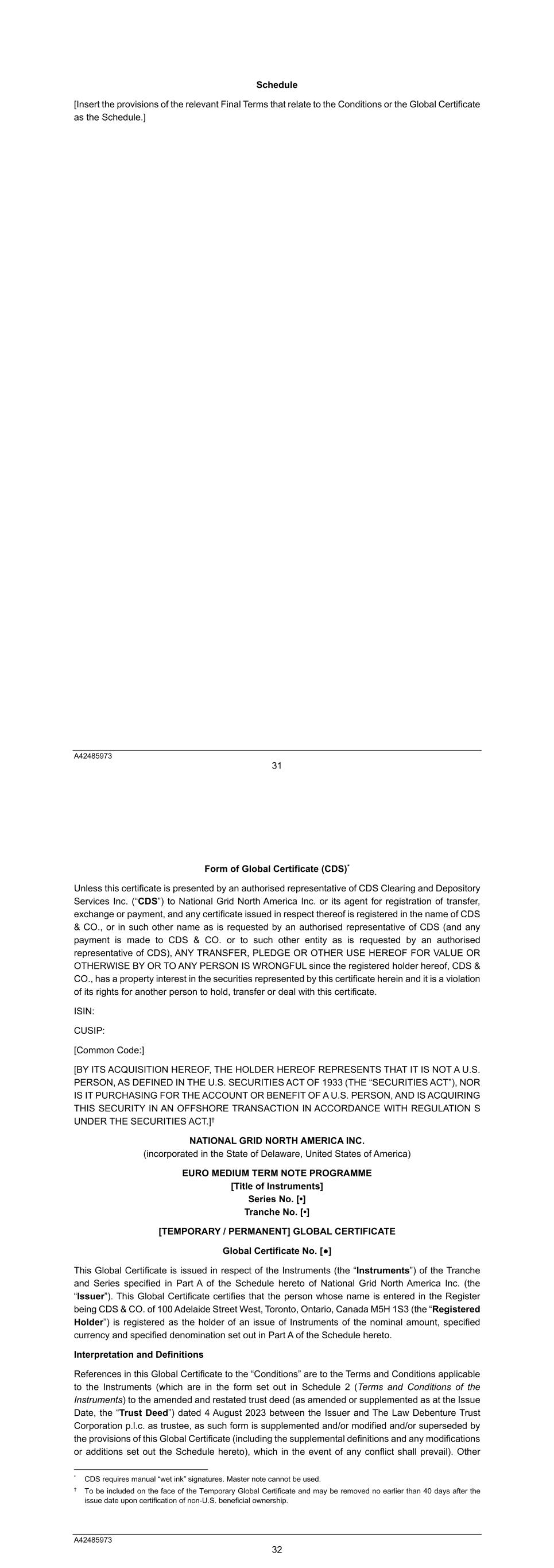 Final/Linklaters LLP/06/11/2023 A52293244 1 National Grid plc US Clawback Policy 1 DEFINITIONS In this Policy: "ADSs” means American Depositary Shares, each representing five Ordinary Shares; “Applicable Law” means any laws, regulations or rules of the US Securities and Exchange Commission, the NYSE, the London Stock Exchange, any other stock exchange on which the Company’s securities are listed or other regulatory authority applicable to the Group or the Executives, including for the avoidance of doubt, Section 304 of the US Sarbanes-Oxley Act of 2002; “Audit & Risk Committee” means the National Grid plc Board Audit & Risk Committee (or any duly authorised delegate thereof); “Board” means the board of directors of the Company; “Company” means National Grid plc, a public limited company incorporated in England and Wales with registered number 04031152; “Effective Date” means 2 October 2023; “Exchange Act” means the Securities Exchange Act of 1934; “Executive” means the Company’s current and former Chief Executive, Chief Financial Officer, Chief People and Culture Officer, Chief Information and Digital Officer, the Group General Counsel & Company Secretary, Chief Strategy and External Affairs Officer, any other member of the Group Executive Committee and any other person(s) (if any) that the Company determines from time to time is a Company “executive officer” as defined in Section 303A.14 of the NYSE Listed Company Manual; “Financial Reporting Measure” has the meaning given to it in Section 4.10.2; “Group” means the Company and its Subsidiaries; “IFRS” means the International Financial Reporting Standards and related interpretations as issued by the International Accounting Standards Board; “Incentive-Based Compensation” has the meaning given to it in Section 4.10.1 of this Policy; “NYSE” means the New York Stock Exchange; “Policy” means the policy constituted by these provisions and any schedules and known as the National Grid plc US Clawback Policy; “Received” has the meaning given to it in Section 4.10.3 of this Policy; “Recoverable Amount” has the meaning given to it in Section 4.1 of this Policy; “Recovery Period” means the period of three full financial years of the Company preceding the Restatement Date and any transition period that results from a change in the Company’s financial year within or immediately following such period1; Final/Linklaters LLP/06/11/2023 A52293244 2 “Remuneration Committee” means the National Grid plc Board Remuneration Committee (or any duly authorised delegate thereof); “Restatement” has the meaning given to it in Section 4.1 of this Policy; “Restatement Date” has the meaning given to it in Section 4.10.4 of this Policy; “Ordinary Shares” means ordinary shares of 12 204/473 pence each in the Company; “Subsidiaries” means any company or body corporate which is a subsidiary of the Company within the meaning of section 1159 of the Companies Act 2006; and “Taxes” means any taxes/duties/contributions/levies. 2 PURPOSE 2.1 The purpose of this Policy is to set out the basis for the mandatory recovery of erroneously awarded Incentive-Based Compensation from Executives in the event of a Restatement. 2.2 The Remuneration Committee has adopted this Policy in accordance with the requirements of Section 303A.14 of the NYSE Listed Company Manual, which was mandated by Rule 10D-1 of the Exchange Act. 3 APPLICABILITY 3.1 This Policy applies to the Executives. Individuals will be notified as soon as practicable after becoming or being determined to be an Executive. 3.2 Remuneration shall be subject to recovery pursuant to this Policy where: (i) the Remuneration Committee determines that such remuneration constitutes Incentive-Based Compensation; and (ii) the remuneration was Received by an Executive: 3.2.1 after beginning their services as an Executive; 3.2.2 who served as an Executive at any time during the performance period for that Incentive-Based Compensation; 3.2.3 while the Company has a class of securities listed on the NYSE, another national securities exchange or a national securities association in the United States; and 3.2.4 during the Recovery Period, provided that this Policy shall only apply to Incentive-Based Compensation Received on or after the Effective Date. 3.3 For the avoidance of doubt, this Policy continues to apply to an Executive following any termination of their office or employment. 3.4 A copy of this Policy will be made available to Executives through any means determined by the Remuneration Committee. 3.5 Executives will either expressly accept the terms of this Policy or, by accepting Incentive- Based Compensation (whether deemed or express acceptance), will be deemed to have accepted the terms of this Policy. 1 A transition period between the last day of the Company’s previous financial year end and the first day of its new financial year that comprises a period of nine to 12 months will be deemed a full financial year, and as such will count as one of the relevant three financial years (rather than be in addition to them).