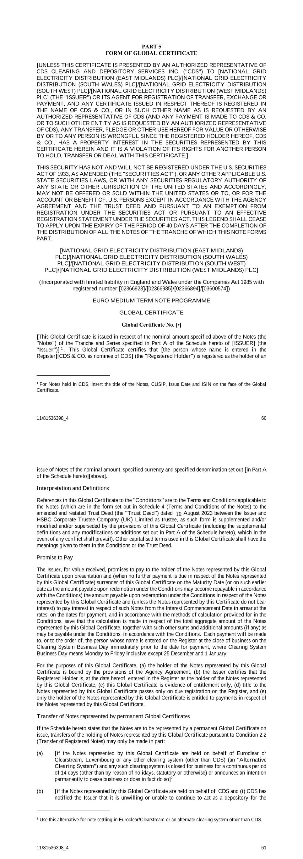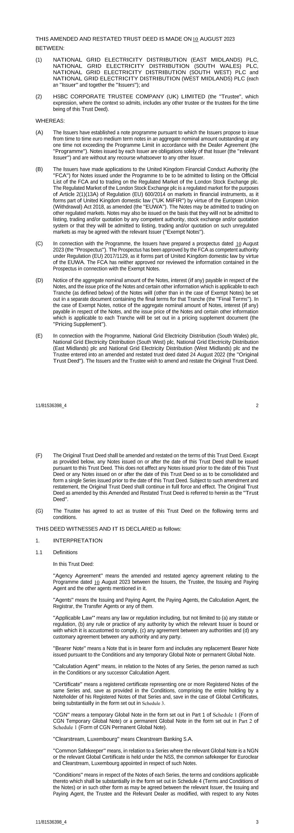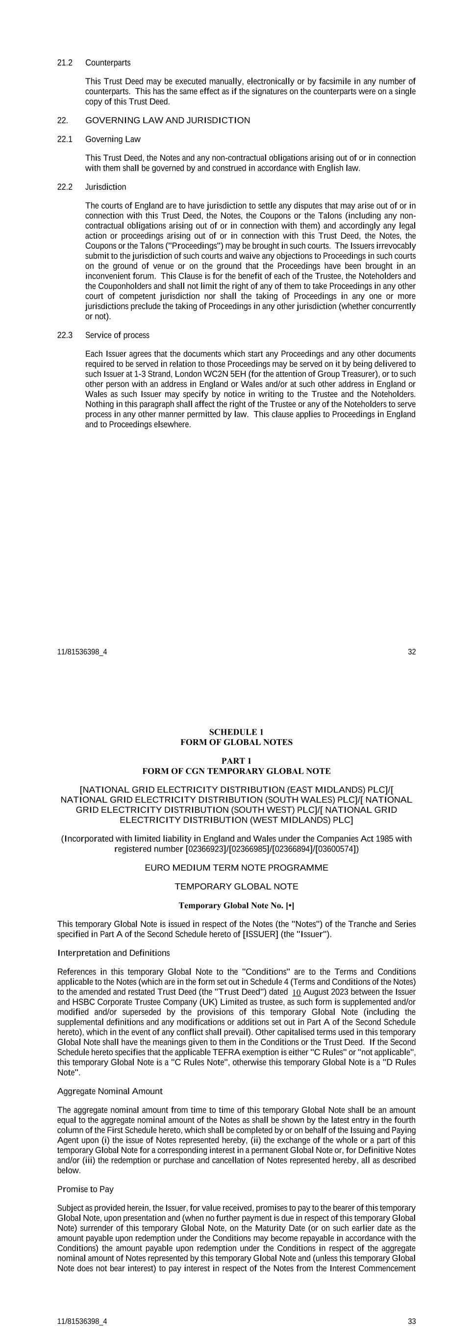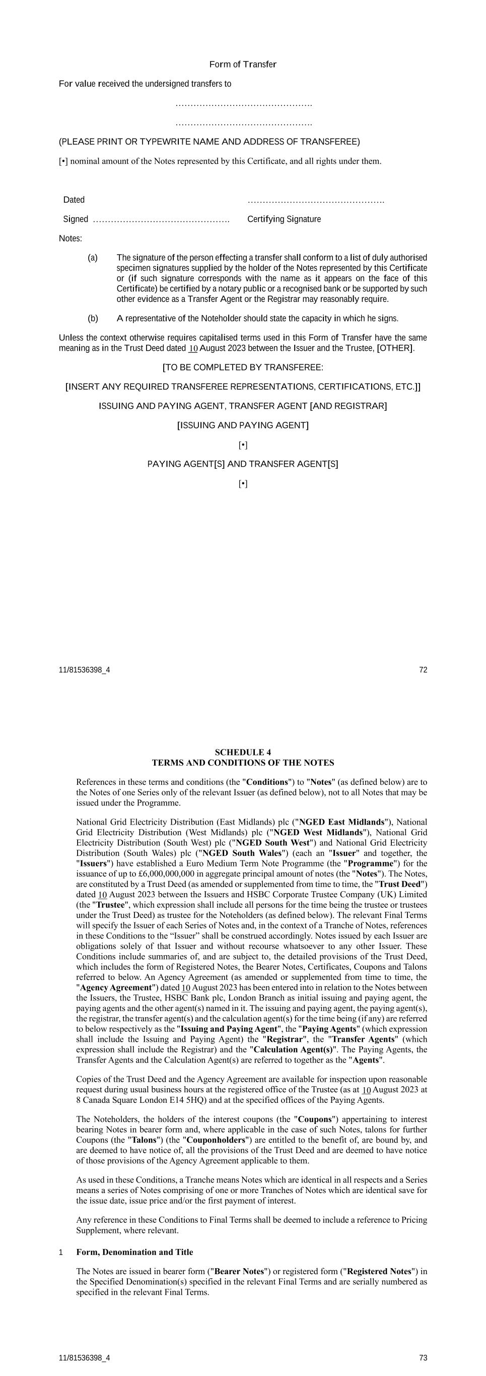Final/Linklaters LLP/06/11/2023 A52293244 1 National Grid plc US Clawback Policy 1 DEFINITIONS In this Policy: "ADSs” means American Depositary Shares, each representing five Ordinary Shares; “Applicable Law” means any laws, regulations or rules of the US Securities and Exchange Commission, the NYSE, the London Stock Exchange, any other stock exchange on which the Company’s securities are listed or other regulatory authority applicable to the Group or the Executives, including for the avoidance of doubt, Section 304 of the US Sarbanes-Oxley Act of 2002; “Audit & Risk Committee” means the National Grid plc Board Audit & Risk Committee (or any duly authorised delegate thereof); “Board” means the board of directors of the Company; “Company” means National Grid plc, a public limited company incorporated in England and Wales with registered number 04031152; “Effective Date” means 2 October 2023; “Exchange Act” means the Securities Exchange Act of 1934; “Executive” means the Company’s current and former Chief Executive, Chief Financial Officer, Chief People and Culture Officer, Chief Information and Digital Officer, the Group General Counsel & Company Secretary, Chief Strategy and External Affairs Officer, any other member of the Group Executive Committee and any other person(s) (if any) that the Company determines from time to time is a Company “executive officer” as defined in Section 303A.14 of the NYSE Listed Company Manual; “Financial Reporting Measure” has the meaning given to it in Section 4.10.2; “Group” means the Company and its Subsidiaries; “IFRS” means the International Financial Reporting Standards and related interpretations as issued by the International Accounting Standards Board; “Incentive-Based Compensation” has the meaning given to it in Section 4.10.1 of this Policy; “NYSE” means the New York Stock Exchange; “Policy” means the policy constituted by these provisions and any schedules and known as the National Grid plc US Clawback Policy; “Received” has the meaning given to it in Section 4.10.3 of this Policy; “Recoverable Amount” has the meaning given to it in Section 4.1 of this Policy; “Recovery Period” means the period of three full financial years of the Company preceding the Restatement Date and any transition period that results from a change in the Company’s financial year within or immediately following such period1; Final/Linklaters LLP/06/11/2023 A52293244 2 “Remuneration Committee” means the National Grid plc Board Remuneration Committee (or any duly authorised delegate thereof); “Restatement” has the meaning given to it in Section 4.1 of this Policy; “Restatement Date” has the meaning given to it in Section 4.10.4 of this Policy; “Ordinary Shares” means ordinary shares of 12 204/473 pence each in the Company; “Subsidiaries” means any company or body corporate which is a subsidiary of the Company within the meaning of section 1159 of the Companies Act 2006; and “Taxes” means any taxes/duties/contributions/levies. 2 PURPOSE 2.1 The purpose of this Policy is to set out the basis for the mandatory recovery of erroneously awarded Incentive-Based Compensation from Executives in the event of a Restatement. 2.2 The Remuneration Committee has adopted this Policy in accordance with the requirements of Section 303A.14 of the NYSE Listed Company Manual, which was mandated by Rule 10D-1 of the Exchange Act. 3 APPLICABILITY 3.1 This Policy applies to the Executives. Individuals will be notified as soon as practicable after becoming or being determined to be an Executive. 3.2 Remuneration shall be subject to recovery pursuant to this Policy where: (i) the Remuneration Committee determines that such remuneration constitutes Incentive-Based Compensation; and (ii) the remuneration was Received by an Executive: 3.2.1 after beginning their services as an Executive; 3.2.2 who served as an Executive at any time during the performance period for that Incentive-Based Compensation; 3.2.3 while the Company has a class of securities listed on the NYSE, another national securities exchange or a national securities association in the United States; and 3.2.4 during the Recovery Period, provided that this Policy shall only apply to Incentive-Based Compensation Received on or after the Effective Date. 3.3 For the avoidance of doubt, this Policy continues to apply to an Executive following any termination of their office or employment. 3.4 A copy of this Policy will be made available to Executives through any means determined by the Remuneration Committee. 3.5 Executives will either expressly accept the terms of this Policy or, by accepting Incentive- Based Compensation (whether deemed or express acceptance), will be deemed to have accepted the terms of this Policy. 1 A transition period between the last day of the Company’s previous financial year end and the first day of its new financial year that comprises a period of nine to 12 months will be deemed a full financial year, and as such will count as one of the relevant three financial years (rather than be in addition to them).