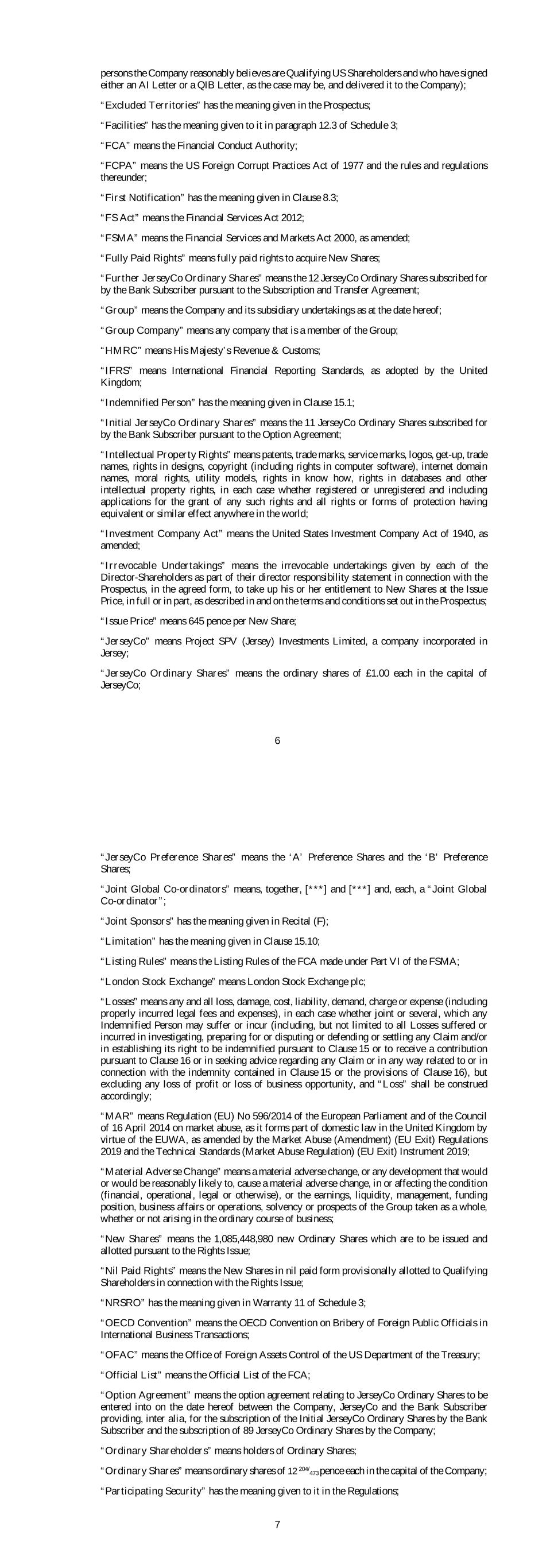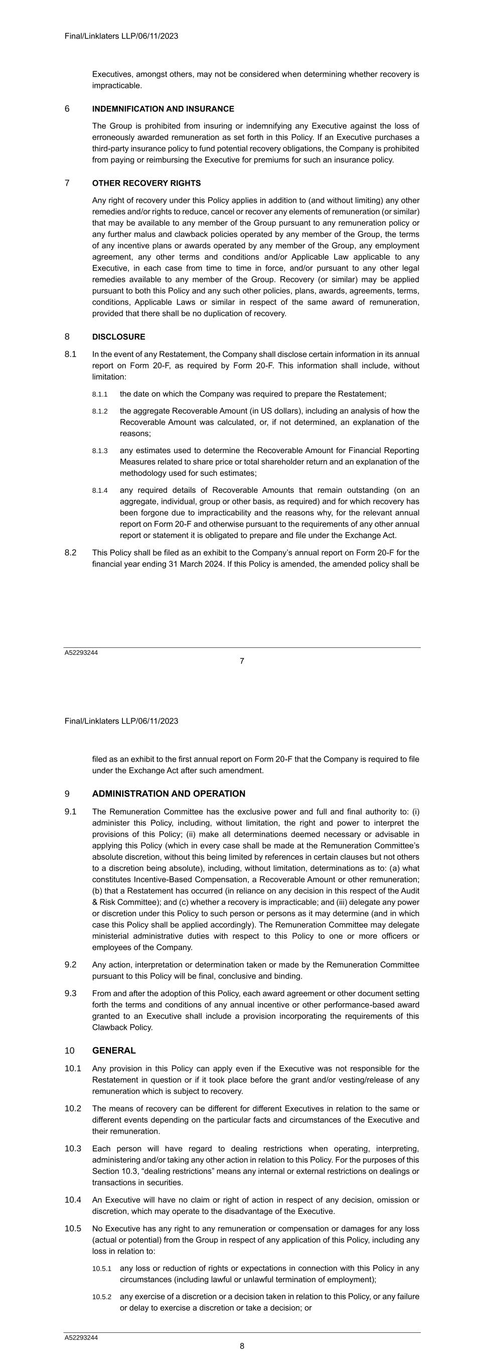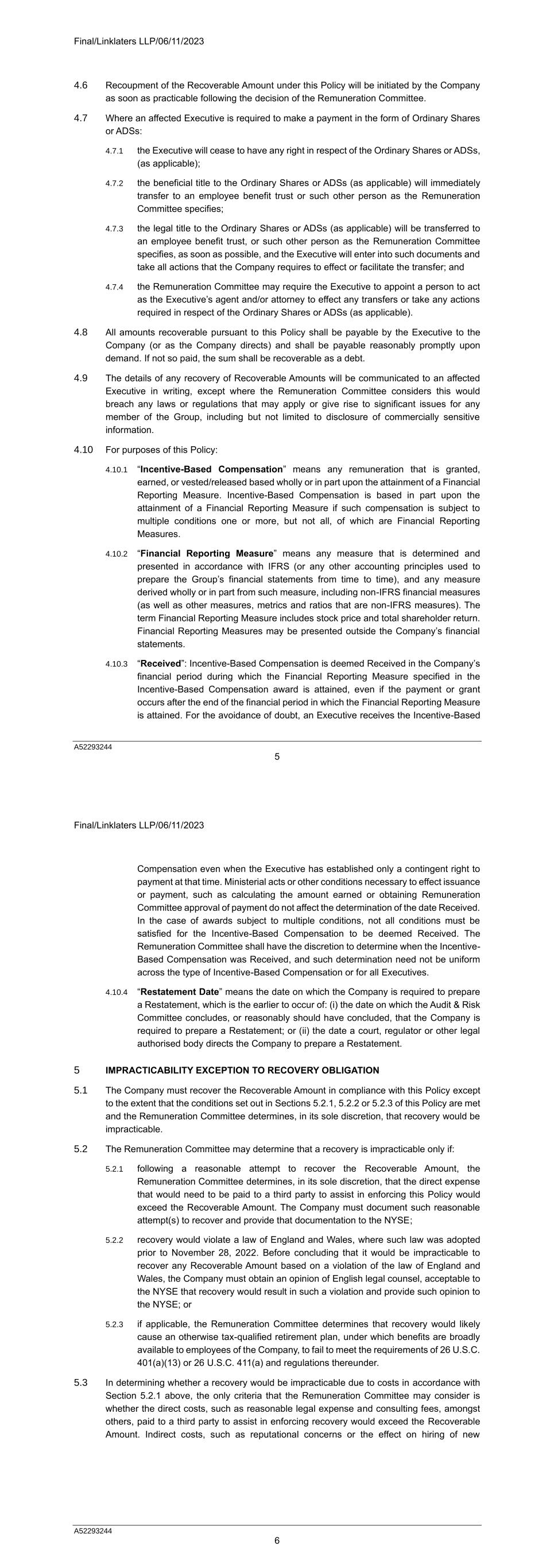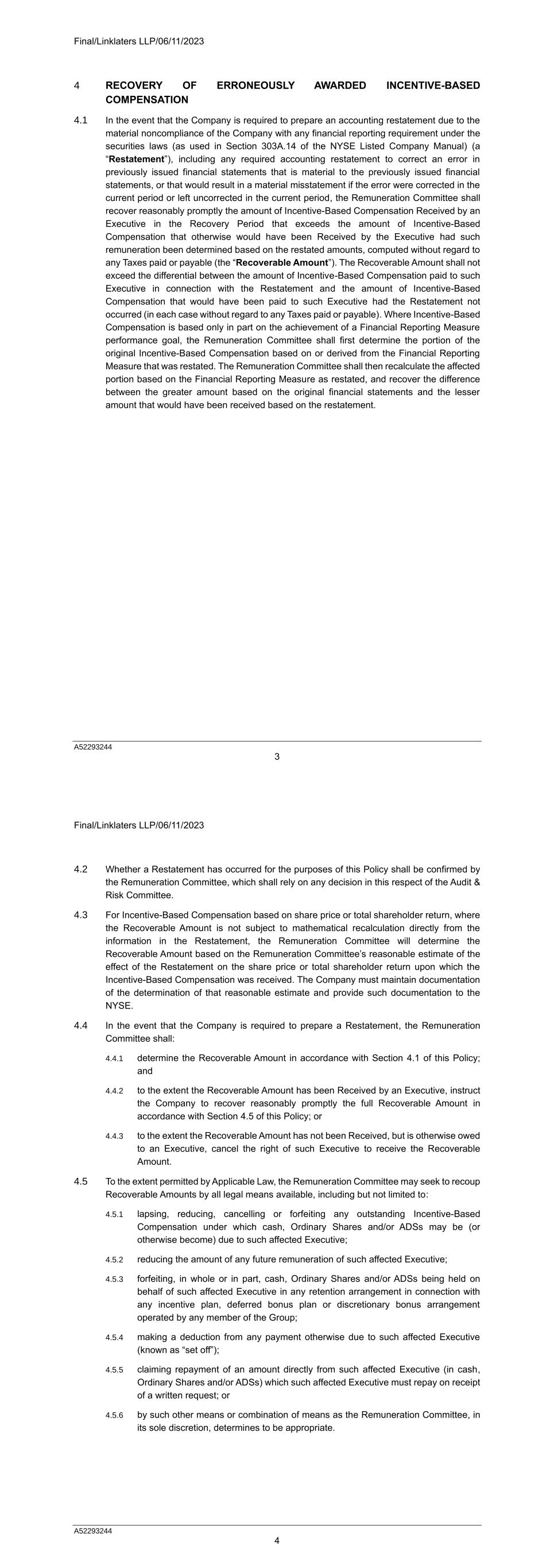 Final/Linklaters LLP/06/11/2023 A52293244 3 4 RECOVERY OF ERRONEOUSLY AWARDED INCENTIVE-BASED COMPENSATION 4.1 In the event that the Company is required to prepare an accounting restatement due to the material noncompliance of the Company with any financial reporting requirement under the securities laws (as used in Section 303A.14 of the NYSE Listed Company Manual) (a “Restatement”), including any required accounting restatement to correct an error in previously issued financial statements that is material to the previously issued financial statements, or that would result in a material misstatement if the error were corrected in the current period or left uncorrected in the current period, the Remuneration Committee shall recover reasonably promptly the amount of Incentive-Based Compensation Received by an Executive in the Recovery Period that exceeds the amount of Incentive-Based Compensation that otherwise would have been Received by the Executive had such remuneration been determined based on the restated amounts, computed without regard to any Taxes paid or payable (the “Recoverable Amount”). The Recoverable Amount shall not exceed the differential between the amount of Incentive-Based Compensation paid to such Executive in connection with the Restatement and the amount of Incentive-Based Compensation that would have been paid to such Executive had the Restatement not occurred (in each case without regard to any Taxes paid or payable). Where Incentive-Based Compensation is based only in part on the achievement of a Financial Reporting Measure performance goal, the Remuneration Committee shall first determine the portion of the original Incentive-Based Compensation based on or derived from the Financial Reporting Measure that was restated. The Remuneration Committee shall then recalculate the affected portion based on the Financial Reporting Measure as restated, and recover the difference between the greater amount based on the original financial statements and the lesser amount that would have been received based on the restatement. Final/Linklaters LLP/06/11/2023 A52293244 4 4.2 Whether a Restatement has occurred for the purposes of this Policy shall be confirmed by the Remuneration Committee, which shall rely on any decision in this respect of the Audit & Risk Committee. 4.3 For Incentive-Based Compensation based on share price or total shareholder return, where the Recoverable Amount is not subject to mathematical recalculation directly from the information in the Restatement, the Remuneration Committee will determine the Recoverable Amount based on the Remuneration Committee’s reasonable estimate of the effect of the Restatement on the share price or total shareholder return upon which the Incentive-Based Compensation was received. The Company must maintain documentation of the determination of that reasonable estimate and provide such documentation to the NYSE. 4.4 In the event that the Company is required to prepare a Restatement, the Remuneration Committee shall: 4.4.1 determine the Recoverable Amount in accordance with Section 4.1 of this Policy; and 4.4.2 to the extent the Recoverable Amount has been Received by an Executive, instruct the Company to recover reasonably promptly the full Recoverable Amount in accordance with Section 4.5 of this Policy; or 4.4.3 to the extent the Recoverable Amount has not been Received, but is otherwise owed to an Executive, cancel the right of such Executive to receive the Recoverable Amount. 4.5 To the extent permitted by Applicable Law, the Remuneration Committee may seek to recoup Recoverable Amounts by all legal means available, including but not limited to: 4.5.1 lapsing, reducing, cancelling or forfeiting any outstanding Incentive-Based Compensation under which cash, Ordinary Shares and/or ADSs may be (or otherwise become) due to such affected Executive; 4.5.2 reducing the amount of any future remuneration of such affected Executive; 4.5.3 forfeiting, in whole or in part, cash, Ordinary Shares and/or ADSs being held on behalf of such affected Executive in any retention arrangement in connection with any incentive plan, deferred bonus plan or discretionary bonus arrangement operated by any member of the Group; 4.5.4 making a deduction from any payment otherwise due to such affected Executive (known as “set off”); 4.5.5 claiming repayment of an amount directly from such affected Executive (in cash, Ordinary Shares and/or ADSs) which such affected Executive must repay on receipt of a written request; or 4.5.6 by such other means or combination of means as the Remuneration Committee, in its sole discretion, determines to be appropriate.