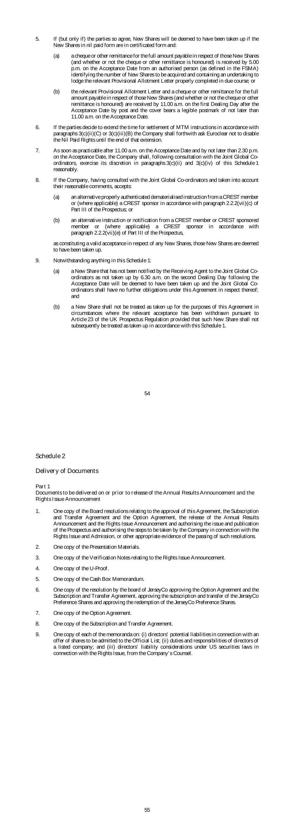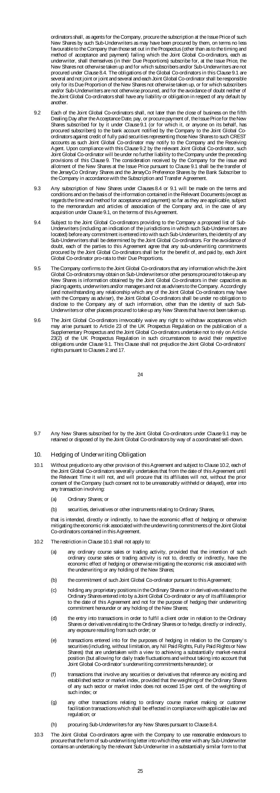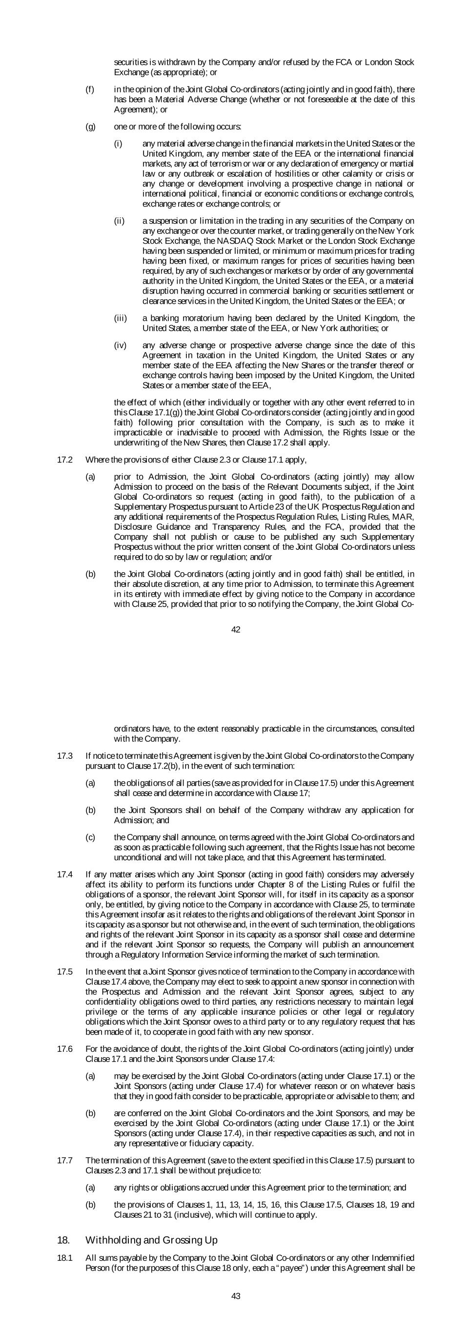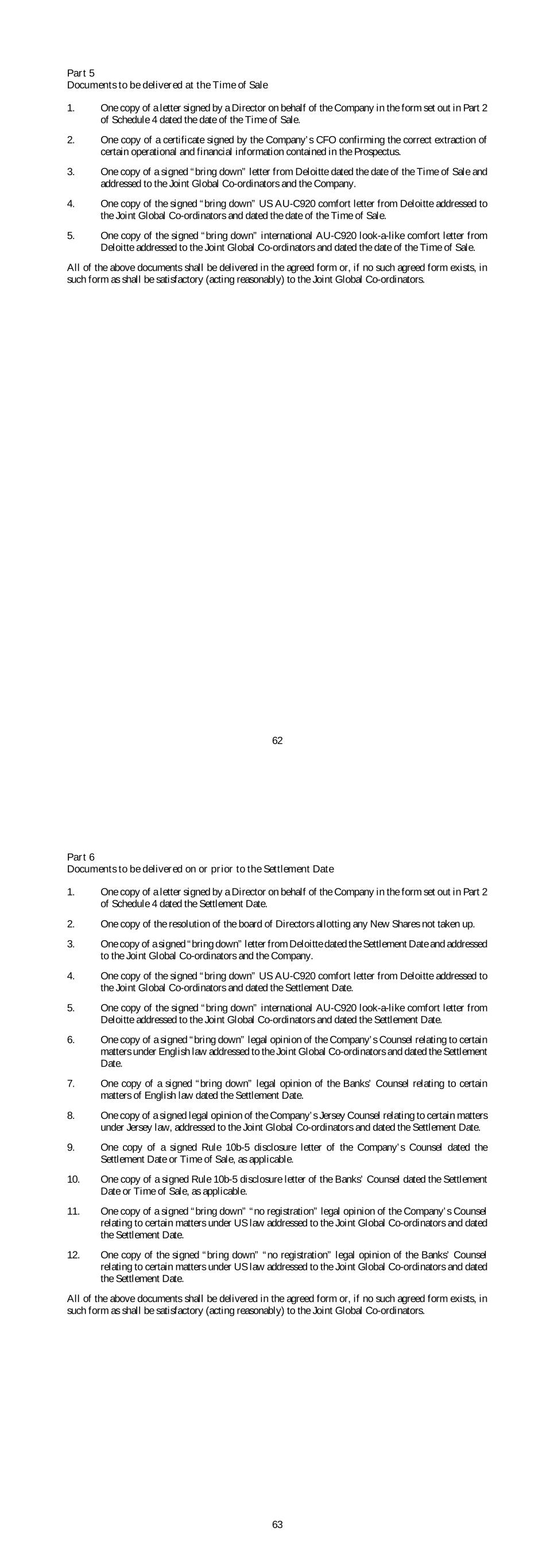 Final/Linklaters LLP/06/11/2023 A52293244 3 4 RECOVERY OF ERRONEOUSLY AWARDED INCENTIVE-BASED COMPENSATION 4.1 In the event that the Company is required to prepare an accounting restatement due to the material noncompliance of the Company with any financial reporting requirement under the securities laws (as used in Section 303A.14 of the NYSE Listed Company Manual) (a “Restatement”), including any required accounting restatement to correct an error in previously issued financial statements that is material to the previously issued financial statements, or that would result in a material misstatement if the error were corrected in the current period or left uncorrected in the current period, the Remuneration Committee shall recover reasonably promptly the amount of Incentive-Based Compensation Received by an Executive in the Recovery Period that exceeds the amount of Incentive-Based Compensation that otherwise would have been Received by the Executive had such remuneration been determined based on the restated amounts, computed without regard to any Taxes paid or payable (the “Recoverable Amount”). The Recoverable Amount shall not exceed the differential between the amount of Incentive-Based Compensation paid to such Executive in connection with the Restatement and the amount of Incentive-Based Compensation that would have been paid to such Executive had the Restatement not occurred (in each case without regard to any Taxes paid or payable). Where Incentive-Based Compensation is based only in part on the achievement of a Financial Reporting Measure performance goal, the Remuneration Committee shall first determine the portion of the original Incentive-Based Compensation based on or derived from the Financial Reporting Measure that was restated. The Remuneration Committee shall then recalculate the affected portion based on the Financial Reporting Measure as restated, and recover the difference between the greater amount based on the original financial statements and the lesser amount that would have been received based on the restatement. Final/Linklaters LLP/06/11/2023 A52293244 4 4.2 Whether a Restatement has occurred for the purposes of this Policy shall be confirmed by the Remuneration Committee, which shall rely on any decision in this respect of the Audit & Risk Committee. 4.3 For Incentive-Based Compensation based on share price or total shareholder return, where the Recoverable Amount is not subject to mathematical recalculation directly from the information in the Restatement, the Remuneration Committee will determine the Recoverable Amount based on the Remuneration Committee’s reasonable estimate of the effect of the Restatement on the share price or total shareholder return upon which the Incentive-Based Compensation was received. The Company must maintain documentation of the determination of that reasonable estimate and provide such documentation to the NYSE. 4.4 In the event that the Company is required to prepare a Restatement, the Remuneration Committee shall: 4.4.1 determine the Recoverable Amount in accordance with Section 4.1 of this Policy; and 4.4.2 to the extent the Recoverable Amount has been Received by an Executive, instruct the Company to recover reasonably promptly the full Recoverable Amount in accordance with Section 4.5 of this Policy; or 4.4.3 to the extent the Recoverable Amount has not been Received, but is otherwise owed to an Executive, cancel the right of such Executive to receive the Recoverable Amount. 4.5 To the extent permitted by Applicable Law, the Remuneration Committee may seek to recoup Recoverable Amounts by all legal means available, including but not limited to: 4.5.1 lapsing, reducing, cancelling or forfeiting any outstanding Incentive-Based Compensation under which cash, Ordinary Shares and/or ADSs may be (or otherwise become) due to such affected Executive; 4.5.2 reducing the amount of any future remuneration of such affected Executive; 4.5.3 forfeiting, in whole or in part, cash, Ordinary Shares and/or ADSs being held on behalf of such affected Executive in any retention arrangement in connection with any incentive plan, deferred bonus plan or discretionary bonus arrangement operated by any member of the Group; 4.5.4 making a deduction from any payment otherwise due to such affected Executive (known as “set off”); 4.5.5 claiming repayment of an amount directly from such affected Executive (in cash, Ordinary Shares and/or ADSs) which such affected Executive must repay on receipt of a written request; or 4.5.6 by such other means or combination of means as the Remuneration Committee, in its sole discretion, determines to be appropriate.
