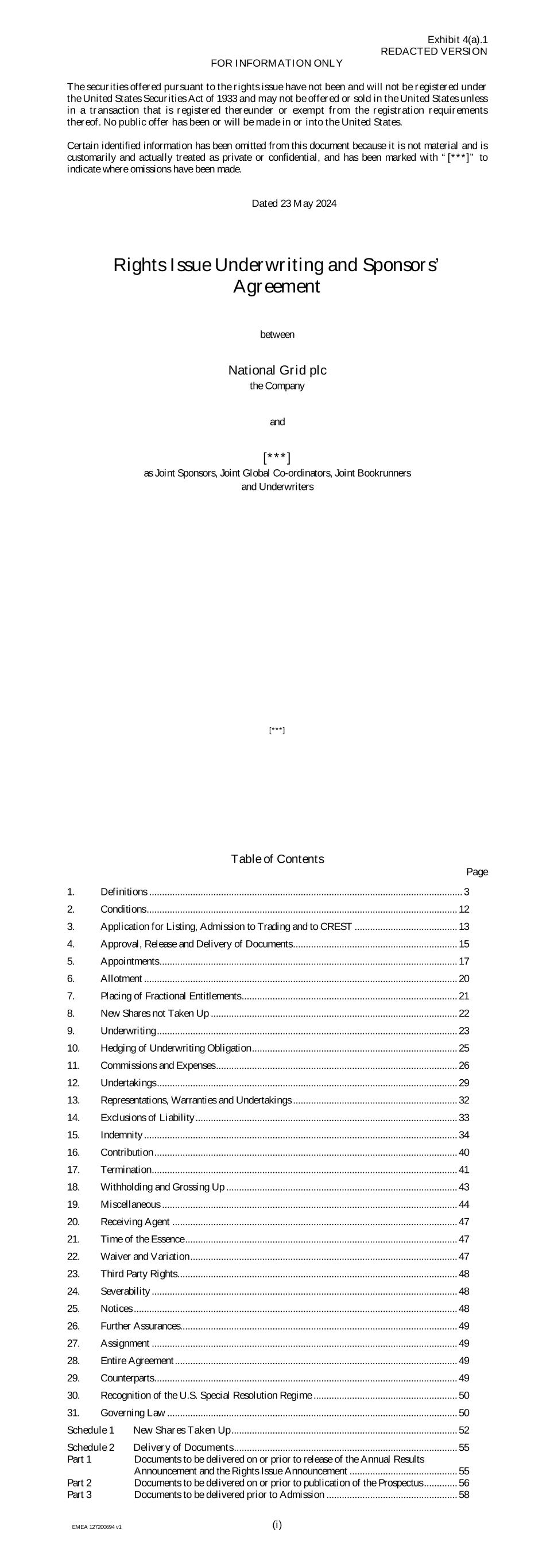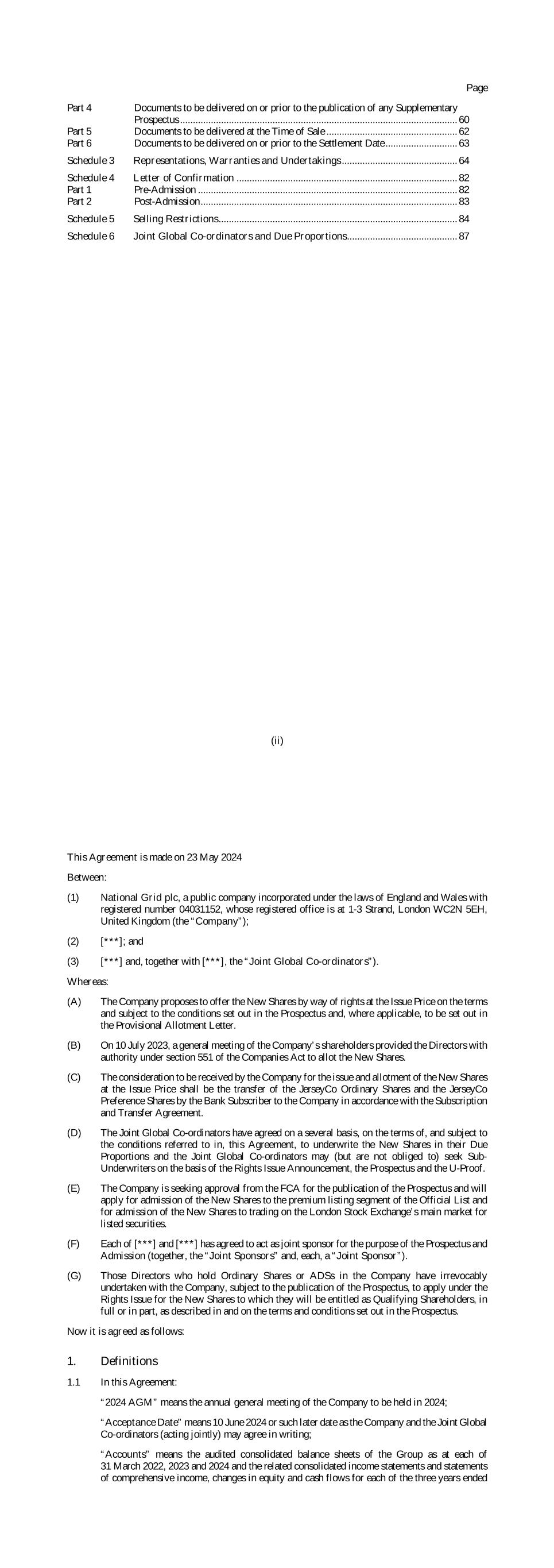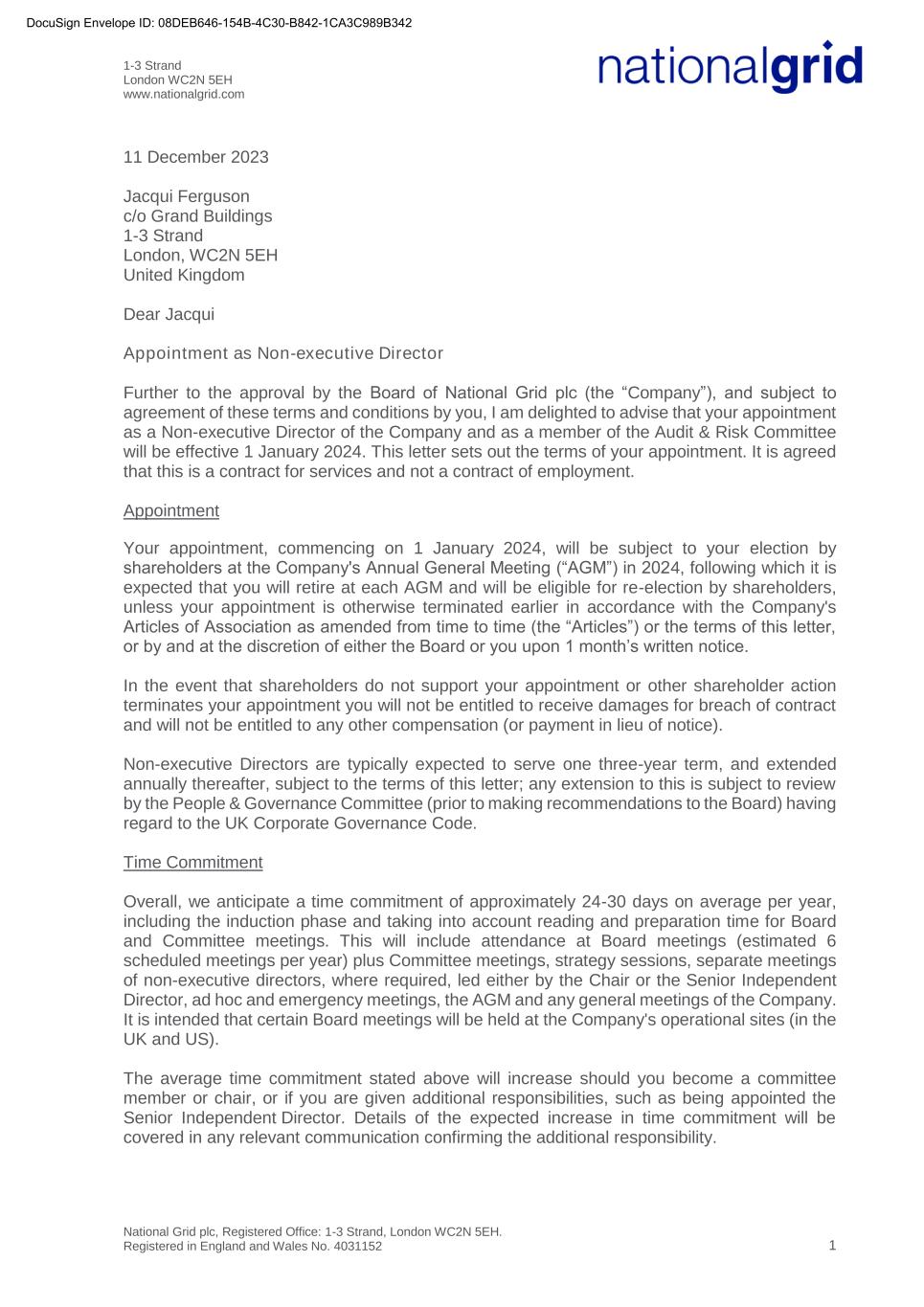 1-3 Strand London WC2N 5EH www.nationalgrid.com National Grid plc, Registered Office: 1-3 Strand, London WC2N 5EH. Registered in England and Wales No. 4031152 1 11 December 2023 Jacqui Ferguson c/o Grand Buildings 1-3 Strand London, WC2N 5EH United Kingdom Dear Jacqui Appointment as Non-executive Director Further to the approval by the Board of National Grid plc (the “Company”), and subject to agreement of these terms and conditions by you, I am delighted to advise that your appointment as a Non-executive Director of the Company and as a member of the Audit & Risk Committee will be effective 1 January 2024. This letter sets out the terms of your appointment. It is agreed that this is a contract for services and not a contract of employment. Appointment Your appointment, commencing on 1 January 2024, will be subject to your election by shareholders at the Company's Annual General Meeting (“AGM”) in 2024, following which it is expected that you will retire at each AGM and will be eligible for re-election by shareholders, unless your appointment is otherwise terminated earlier in accordance with the Company's Articles of Association as amended from time to time (the “Articles”) or the terms of this letter, or by and at the discretion of either the Board or you upon 1 month’s written notice. In the event that shareholders do not support your appointment or other shareholder action terminates your appointment you will not be entitled to receive damages for breach of contract and will not be entitled to any other compensation (or payment in lieu of notice). Non-executive Directors are typically expected to serve one three-year term, and extended annually thereafter, subject to the terms of this letter; any extension to this is subject to review by the People & Governance Committee (prior to making recommendations to the Board) having regard to the UK Corporate Governance Code. Time Commitment Overall, we anticipate a time commitment of approximately 24-30 days on average per year, including the induction phase and taking into account reading and preparation time for Board and Committee meetings. This will include attendance at Board meetings (estimated 6 scheduled meetings per year) plus Committee meetings, strategy sessions, separate meetings of non-executive directors, where required, led either by the Chair or the Senior Independent Director, ad hoc and emergency meetings, the AGM and any general meetings of the Company. It is intended that certain Board meetings will be held at the Company's operational sites (in the UK and US). The average time commitment stated above will increase should you become a committee member or chair, or if you are given additional responsibilities, such as being appointed the Senior Independent Director. Details of the expected increase in time commitment will be covered in any relevant communication confirming the additional responsibility. DocuSign Envelope ID: C6F89CE1-569A-49F5-9631-5BB7CD9DEE5D08DEB646 154B C30 B842-1CA3 989B342