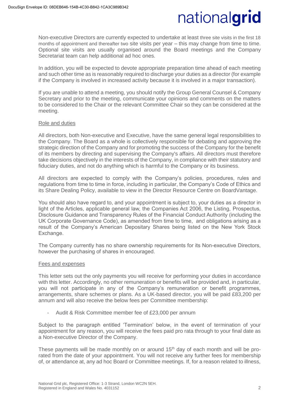 National Grid plc, Registered Office: 1-3 Strand, London WC2N 5EH. Registered in England and Wales No. 4031152 2 Non-executive Directors are currently expected to undertake at least three site visits in the first 18 months of appointment and thereafter two site visits per year – this may change from time to time. Optional site visits are usually organised around the Board meetings and the Company Secretariat team can help additional ad hoc ones. In addition, you will be expected to devote appropriate preparation time ahead of each meeting and such other time as is reasonably required to discharge your duties as a director (for example if the Company is involved in increased activity because it is involved in a major transaction). If you are unable to attend a meeting, you should notify the Group General Counsel & Company Secretary and prior to the meeting, communicate your opinions and comments on the matters to be considered to the Chair or the relevant Committee Chair so they can be considered at the meeting. Role and duties All directors, both Non-executive and Executive, have the same general legal responsibilities to the Company. The Board as a whole is collectively responsible for debating and approving the strategic direction of the Company and for promoting the success of the Company for the benefit of its members by directing and supervising the Company's affairs. All directors must therefore take decisions objectively in the interests of the Company, in compliance with their statutory and fiduciary duties, and not do anything which is harmful to the Company or its business. All directors are expected to comply with the Company’s policies, procedures, rules and regulations from time to time in force, including in particular, the Company’s Code of Ethics and its Share Dealing Policy, available to view in the Director Resource Centre on BoardVantage. You should also have regard to, and your appointment is subject to, your duties as a director in light of the Articles, applicable general law, the Companies Act 2006, the Listing, Prospectus, Disclosure Guidance and Transparency Rules of the Financial Conduct Authority (including the UK Corporate Governance Code), as amended from time to time, and obligations arising as a result of the Company’s American Depositary Shares being listed on the New York Stock Exchange. The Company currently has no share ownership requirements for its Non-executive Directors, however the purchasing of shares in encouraged. Fees and expenses This letter sets out the only payments you will receive for performing your duties in accordance with this letter. Accordingly, no other remuneration or benefits will be provided and, in particular, you will not participate in any of the Company’s remuneration or benefit programmes, arrangements, share schemes or plans. As a UK-based director, you will be paid £83,200 per annum and will also receive the below fees per Committee membership: - Audit & Risk Committee member fee of £23,000 per annum Subject to the paragraph entitled ‘Termination’ below, in the event of termination of your appointment for any reason, you will receive the fees paid pro rata through to your final date as a Non-executive Director of the Company. These payments will be made monthly on or around 15th day of each month and will be pro- rated from the date of your appointment. You will not receive any further fees for membership of, or attendance at, any ad hoc Board or Committee meetings. If, for a reason related to illness, DocuSign Envelope ID: C6F89CE1-569A-49F5-9631-5BB7CD9DEE5D08DEB646 154B C30 B842-1CA3 989B342