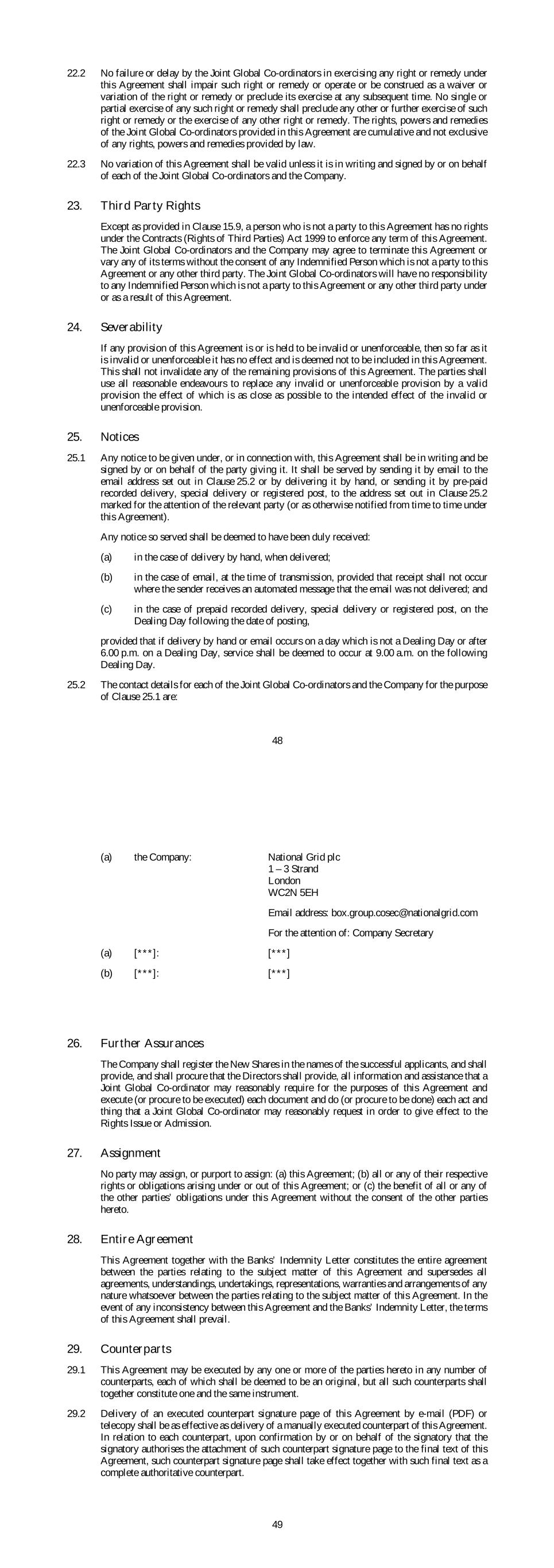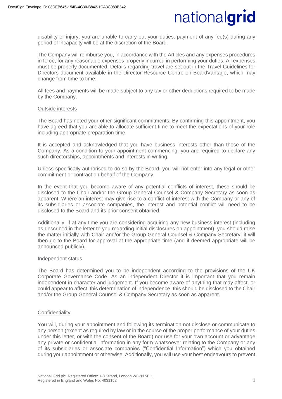 National Grid plc, Registered Office: 1-3 Strand, London WC2N 5EH. Registered in England and Wales No. 4031152 3 disability or injury, you are unable to carry out your duties, payment of any fee(s) during any period of incapacity will be at the discretion of the Board. The Company will reimburse you, in accordance with the Articles and any expenses procedures in force, for any reasonable expenses properly incurred in performing your duties. All expenses must be properly documented. Details regarding travel are set out in the Travel Guidelines for Directors document available in the Director Resource Centre on BoardVantage, which may change from time to time. All fees and payments will be made subject to any tax or other deductions required to be made by the Company. Outside interests The Board has noted your other significant commitments. By confirming this appointment, you have agreed that you are able to allocate sufficient time to meet the expectations of your role including appropriate preparation time. It is accepted and acknowledged that you have business interests other than those of the Company. As a condition to your appointment commencing, you are required to declare any such directorships, appointments and interests in writing. Unless specifically authorised to do so by the Board, you will not enter into any legal or other commitment or contract on behalf of the Company. In the event that you become aware of any potential conflicts of interest, these should be disclosed to the Chair and/or the Group General Counsel & Company Secretary as soon as apparent. Where an interest may give rise to a conflict of interest with the Company or any of its subsidiaries or associate companies, the interest and potential conflict will need to be disclosed to the Board and its prior consent obtained. Additionally, if at any time you are considering acquiring any new business interest (including as described in the letter to you regarding initial disclosures on appointment), you should raise the matter initially with Chair and/or the Group General Counsel & Company Secretary; it will then go to the Board for approval at the appropriate time (and if deemed appropriate will be announced publicly). Independent status The Board has determined you to be independent according to the provisions of the UK Corporate Governance Code. As an independent Director it is important that you remain independent in character and judgement. If you become aware of anything that may affect, or could appear to affect, this determination of independence, this should be disclosed to the Chair and/or the Group General Counsel & Company Secretary as soon as apparent. Confidentiality You will, during your appointment and following its termination not disclose or communicate to any person (except as required by law or in the course of the proper performance of your duties under this letter, or with the consent of the Board) nor use for your own account or advantage any private or confidential information in any form whatsoever relating to the Company or any of its subsidiaries or associate companies (“Confidential Information”) which you obtained during your appointment or otherwise. Additionally, you will use your best endeavours to prevent DocuSign Envelope ID: C6F89CE1-569A-49F5-9631-5BB7CD9DEE5D08DEB646 154B C30 B842-1CA3 989B342