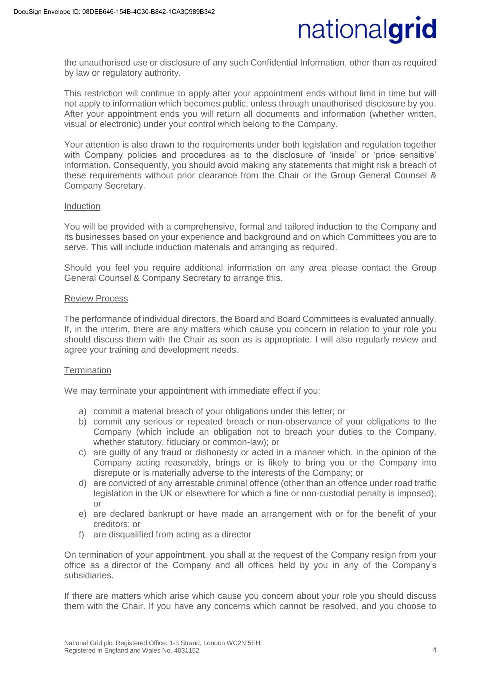 National Grid plc, Registered Office: 1-3 Strand, London WC2N 5EH. Registered in England and Wales No. 4031152 4 the unauthorised use or disclosure of any such Confidential Information, other than as required by law or regulatory authority. This restriction will continue to apply after your appointment ends without limit in time but will not apply to information which becomes public, unless through unauthorised disclosure by you. After your appointment ends you will return all documents and information (whether written, visual or electronic) under your control which belong to the Company. Your attention is also drawn to the requirements under both legislation and regulation together with Company policies and procedures as to the disclosure of ‘inside’ or ‘price sensitive’ information. Consequently, you should avoid making any statements that might risk a breach of these requirements without prior clearance from the Chair or the Group General Counsel & Company Secretary. Induction You will be provided with a comprehensive, formal and tailored induction to the Company and its businesses based on your experience and background and on which Committees you are to serve. This will include induction materials and arranging as required. Should you feel you require additional information on any area please contact the Group General Counsel & Company Secretary to arrange this. Review Process The performance of individual directors, the Board and Board Committees is evaluated annually. If, in the interim, there are any matters which cause you concern in relation to your role you should discuss them with the Chair as soon as is appropriate. I will also regularly review and agree your training and development needs. Termination We may terminate your appointment with immediate effect if you: a) commit a material breach of your obligations under this letter; or b) commit any serious or repeated breach or non-observance of your obligations to the Company (which include an obligation not to breach your duties to the Company, whether statutory, fiduciary or common-law); or c) are guilty of any fraud or dishonesty or acted in a manner which, in the opinion of the Company acting reasonably, brings or is likely to bring you or the Company into disrepute or is materially adverse to the interests of the Company; or d) are convicted of any arrestable criminal offence (other than an offence under road traffic legislation in the UK or elsewhere for which a fine or non-custodial penalty is imposed); or e) are declared bankrupt or have made an arrangement with or for the benefit of your creditors; or f) are disqualified from acting as a director On termination of your appointment, you shall at the request of the Company resign from your office as a director of the Company and all offices held by you in any of the Company’s subsidiaries. If there are matters which arise which cause you concern about your role you should discuss them with the Chair. If you have any concerns which cannot be resolved, and you choose to DocuSign Envelope ID: C6F89CE1-569A-49F5-9631-5BB7CD9DEE5D08DEB646 154B C30 B842-1CA3 989B342