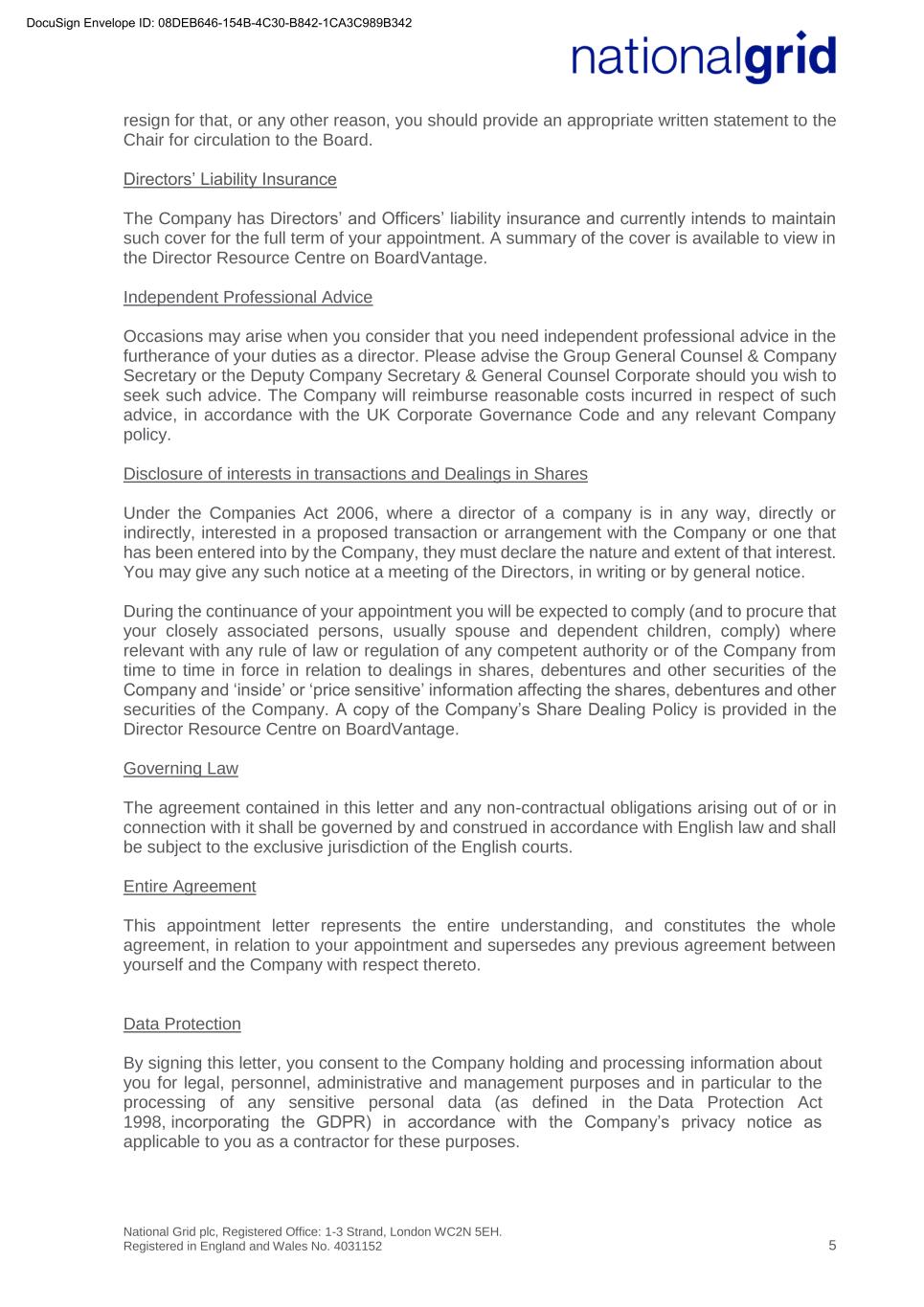 National Grid plc, Registered Office: 1-3 Strand, London WC2N 5EH. Registered in England and Wales No. 4031152 5 resign for that, or any other reason, you should provide an appropriate written statement to the Chair for circulation to the Board. Directors’ Liability Insurance The Company has Directors’ and Officers’ liability insurance and currently intends to maintain such cover for the full term of your appointment. A summary of the cover is available to view in the Director Resource Centre on BoardVantage. Independent Professional Advice Occasions may arise when you consider that you need independent professional advice in the furtherance of your duties as a director. Please advise the Group General Counsel & Company Secretary or the Deputy Company Secretary & General Counsel Corporate should you wish to seek such advice. The Company will reimburse reasonable costs incurred in respect of such advice, in accordance with the UK Corporate Governance Code and any relevant Company policy. Disclosure of interests in transactions and Dealings in Shares Under the Companies Act 2006, where a director of a company is in any way, directly or indirectly, interested in a proposed transaction or arrangement with the Company or one that has been entered into by the Company, they must declare the nature and extent of that interest. You may give any such notice at a meeting of the Directors, in writing or by general notice. During the continuance of your appointment you will be expected to comply (and to procure that your closely associated persons, usually spouse and dependent children, comply) where relevant with any rule of law or regulation of any competent authority or of the Company from time to time in force in relation to dealings in shares, debentures and other securities of the Company and ‘inside’ or ‘price sensitive’ information affecting the shares, debentures and other securities of the Company. A copy of the Company’s Share Dealing Policy is provided in the Director Resource Centre on BoardVantage. Governing Law The agreement contained in this letter and any non-contractual obligations arising out of or in connection with it shall be governed by and construed in accordance with English law and shall be subject to the exclusive jurisdiction of the English courts. Entire Agreement This appointment letter represents the entire understanding, and constitutes the whole agreement, in relation to your appointment and supersedes any previous agreement between yourself and the Company with respect thereto. Data Protection By signing this letter, you consent to the Company holding and processing information about you for legal, personnel, administrative and management purposes and in particular to the processing of any sensitive personal data (as defined in the Data Protection Act 1998, incorporating the GDPR) in accordance with the Company’s privacy notice as applicable to you as a contractor for these purposes. DocuSign Envelope ID: C6F89CE1-569A-49F5-9631-5BB7CD9DEE5D08DEB646 154B C30 B842-1CA3 989B342