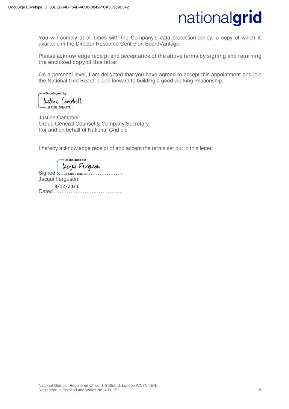 National Grid plc, Registered Office: 1-3 Strand, London WC2N 5EH. Registered in England and Wales No. 4031152 6 You will comply at all times with the Company’s data protection policy, a copy of which is available in the Director Resource Centre on BoardVantage. Please acknowledge receipt and acceptance of the above terms by signing and returning the enclosed copy of this letter. On a personal level, I am delighted that you have agreed to accept this appointment and join the National Grid Board, I look forward to building a good working relationship. Justine Campbell Group General Counsel & Company Secretary For and on behalf of National Grid plc I hereby acknowledge receipt of and accept the terms set out in this letter. Signed ………………………………. Jacqui Ferguson Dated ……………………………….. DocuSign Envelope ID: C6F89CE1-569A-49F5-9631-5BB7CD9DEE5D 8/12/2023 08DEB646 154B C30 B842-1CA3 989B342