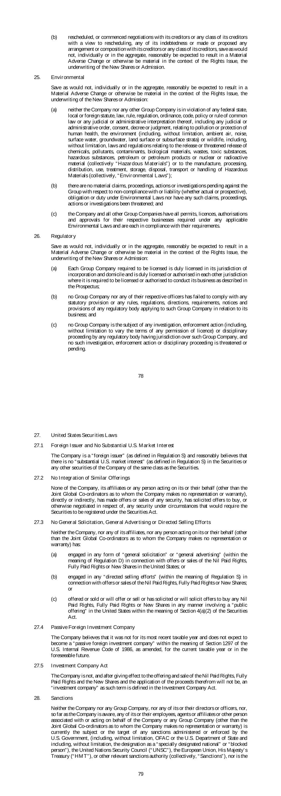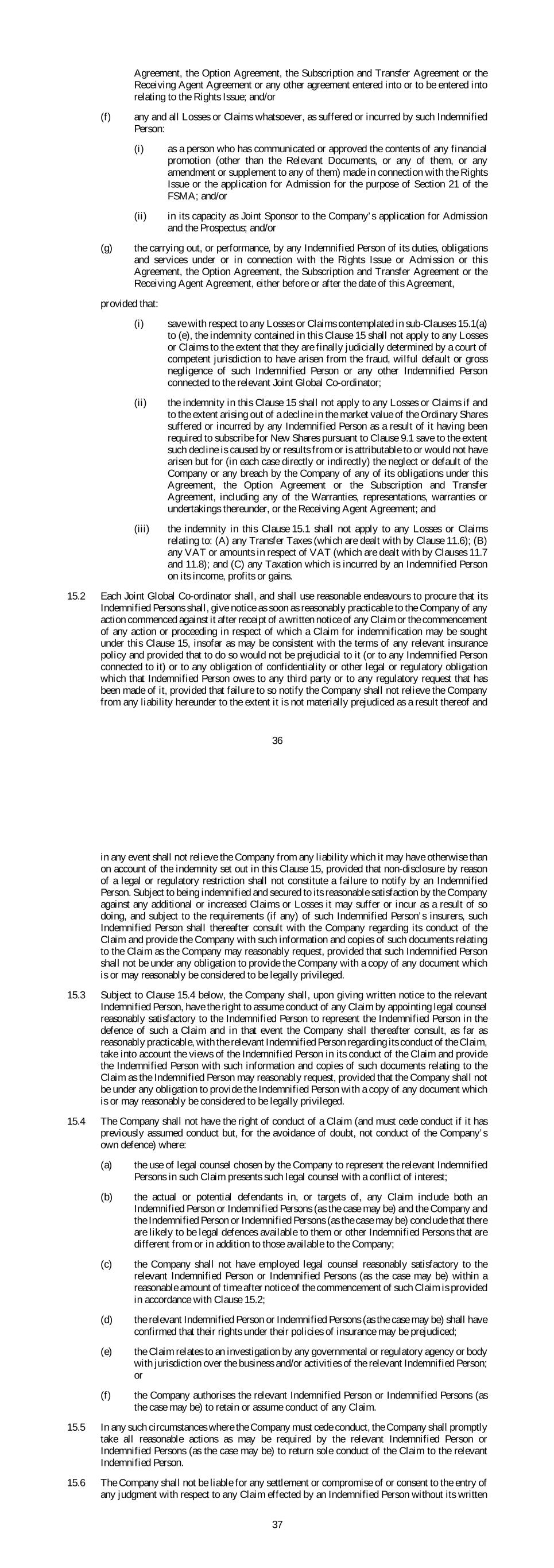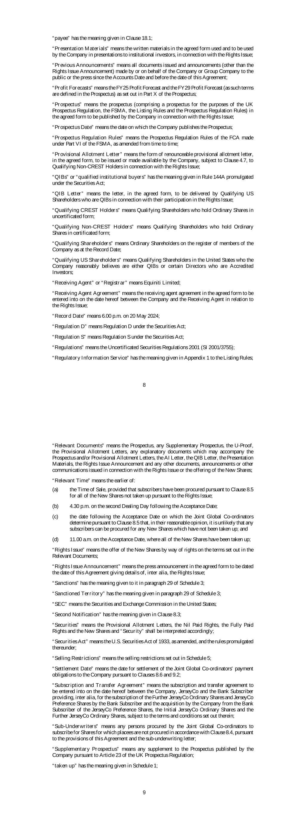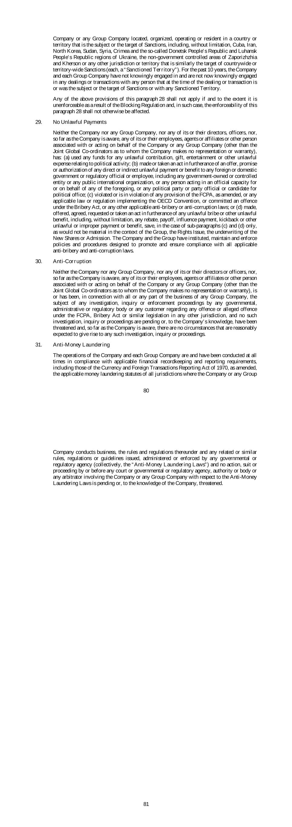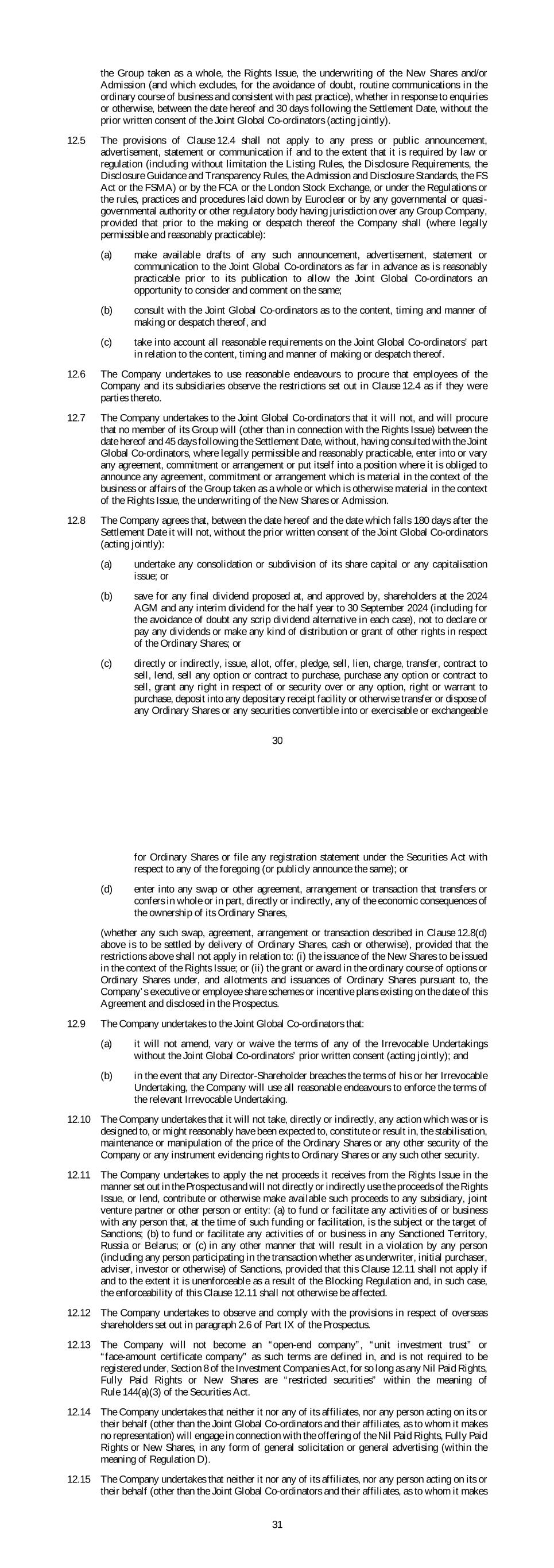 Final/Linklaters LLP/06/11/2023 A52293244 7 Executives, amongst others, may not be considered when determining whether recovery is impracticable. 6 INDEMNIFICATION AND INSURANCE The Group is prohibited from insuring or indemnifying any Executive against the loss of erroneously awarded remuneration as set forth in this Policy. If an Executive purchases a third-party insurance policy to fund potential recovery obligations, the Company is prohibited from paying or reimbursing the Executive for premiums for such an insurance policy. 7 OTHER RECOVERY RIGHTS Any right of recovery under this Policy applies in addition to (and without limiting) any other remedies and/or rights to reduce, cancel or recover any elements of remuneration (or similar) that may be available to any member of the Group pursuant to any remuneration policy or any further malus and clawback policies operated by any member of the Group, the terms of any incentive plans or awards operated by any member of the Group, any employment agreement, any other terms and conditions and/or Applicable Law applicable to any Executive, in each case from time to time in force, and/or pursuant to any other legal remedies available to any member of the Group. Recovery (or similar) may be applied pursuant to both this Policy and any such other policies, plans, awards, agreements, terms, conditions, Applicable Laws or similar in respect of the same award of remuneration, provided that there shall be no duplication of recovery. 8 DISCLOSURE 8.1 In the event of any Restatement, the Company shall disclose certain information in its annual report on Form 20-F, as required by Form 20-F. This information shall include, without limitation: 8.1.1 the date on which the Company was required to prepare the Restatement; 8.1.2 the aggregate Recoverable Amount (in US dollars), including an analysis of how the Recoverable Amount was calculated, or, if not determined, an explanation of the reasons; 8.1.3 any estimates used to determine the Recoverable Amount for Financial Reporting Measures related to share price or total shareholder return and an explanation of the methodology used for such estimates; 8.1.4 any required details of Recoverable Amounts that remain outstanding (on an aggregate, individual, group or other basis, as required) and for which recovery has been forgone due to impracticability and the reasons why, for the relevant annual report on Form 20-F and otherwise pursuant to the requirements of any other annual report or statement it is obligated to prepare and file under the Exchange Act. 8.2 This Policy shall be filed as an exhibit to the Company’s annual report on Form 20-F for the financial year ending 31 March 2024. If this Policy is amended, the amended policy shall be Final/Linklaters LLP/06/11/2023 A52293244 8 filed as an exhibit to the first annual report on Form 20-F that the Company is required to file under the Exchange Act after such amendment. 9 ADMINISTRATION AND OPERATION 9.1 The Remuneration Committee has the exclusive power and full and final authority to: (i) administer this Policy, including, without limitation, the right and power to interpret the provisions of this Policy; (ii) make all determinations deemed necessary or advisable in applying this Policy (which in every case shall be made at the Remuneration Committee’s absolute discretion, without this being limited by references in certain clauses but not others to a discretion being absolute), including, without limitation, determinations as to: (a) what constitutes Incentive-Based Compensation, a Recoverable Amount or other remuneration; (b) that a Restatement has occurred (in reliance on any decision in this respect of the Audit & Risk Committee); and (c) whether a recovery is impracticable; and (iii) delegate any power or discretion under this Policy to such person or persons as it may determine (and in which case this Policy shall be applied accordingly). The Remuneration Committee may delegate ministerial administrative duties with respect to this Policy to one or more officers or employees of the Company. 9.2 Any action, interpretation or determination taken or made by the Remuneration Committee pursuant to this Policy will be final, conclusive and binding. 9.3 From and after the adoption of this Policy, each award agreement or other document setting forth the terms and conditions of any annual incentive or other performance-based award granted to an Executive shall include a provision incorporating the requirements of this Clawback Policy. 10 GENERAL 10.1 Any provision in this Policy can apply even if the Executive was not responsible for the Restatement in question or if it took place before the grant and/or vesting/release of any remuneration which is subject to recovery. 10.2 The means of recovery can be different for different Executives in relation to the same or different events depending on the particular facts and circumstances of the Executive and their remuneration. 10.3 Each person will have regard to dealing restrictions when operating, interpreting, administering and/or taking any other action in relation to this Policy. For the purposes of this Section 10.3, “dealing restrictions” means any internal or external restrictions on dealings or transactions in securities. 10.4 An Executive will have no claim or right of action in respect of any decision, omission or discretion, which may operate to the disadvantage of the Executive. 10.5 No Executive has any right to any remuneration or compensation or damages for any loss (actual or potential) from the Group in respect of any application of this Policy, including any loss in relation to: 10.5.1 any loss or reduction of rights or expectations in connection with this Policy in any circumstances (including lawful or unlawful termination of employment); 10.5.2 any exercise of a discretion or a decision taken in relation to this Policy, or any failure or delay to exercise a discretion or take a decis