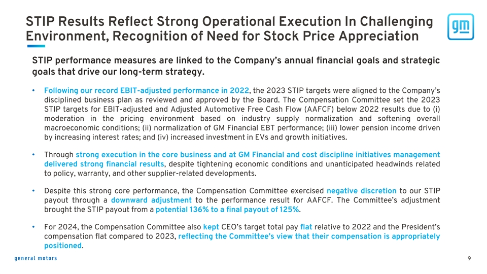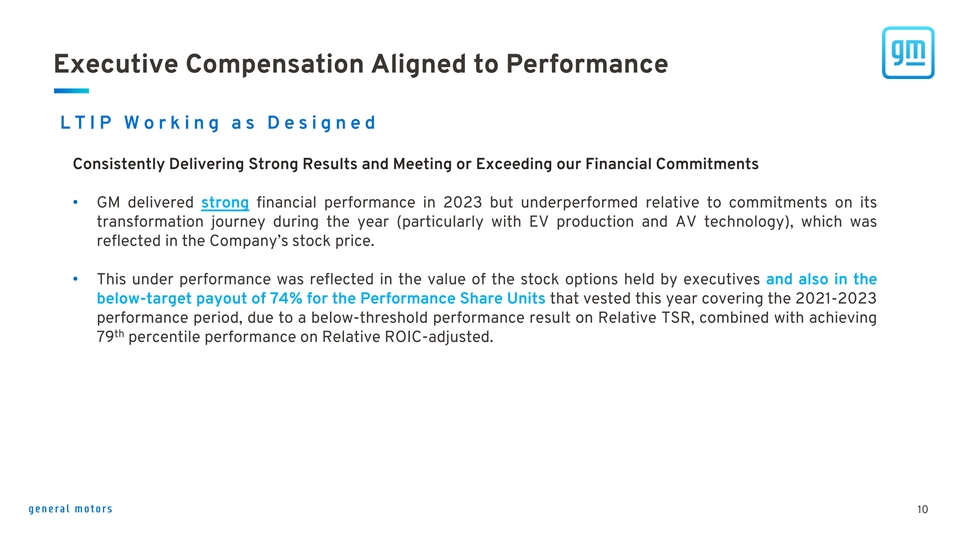 STIP Results Reflect Strong Operational Execution In Challenging Environment, Recognition of Need for Stock Price Appreciation STIP performance measures are linked to the Company’s annual financial goals and strategic goals that drive our long-term strategy. • Following our record EBIT-adjusted performance in 2022, the 2023 STIP targets were aligned to the Company’s disciplined business plan as reviewed and approved by the Board. The Compensation Committee set the 2023 STIP targets for EBIT-adjusted and Adjusted Automotive Free Cash Flow (AAFCF) below 2022 results due to (i) moderation in the pricing environment based on industry supply normalization and softening overall macroeconomic conditions; (ii) normalization of GM Financial EBT performance; (iii) lower pension income driven by increasing interest rates; and (iv) increased investment in EVs and growth initiatives. • Through strong execution in the core business and at GM Financial and cost discipline initiatives management delivered strong financial results, despite tightening economic conditions and unanticipated headwinds related to policy, warranty, and other supplier-related developments. • Despite this strong core performance, the Compensation Committee exercised negative discretion to our STIP payout through a downward adjustment to the performance result for AAFCF. The Committee’s adjustment brought the STIP payout from a potential 136% to a final payout of 125%. • For 2024, the Compensation Committee also kept CEO’s target total pay flat relative to 2022 and the President’s compensation flat compared to 2023, reflecting the Committee’s view that their compensation is appropriately positioned. 9