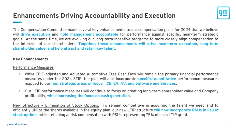 Executive Compensation Aligned to Performance L T I P W o r k i n g a s D e s i g n e d Consistently Delivering Strong Results and Meeting or Exceeding our Financial Commitments • GM delivered strong financial performance in 2023 but underperformed relative to commitments on its transformation journey during the year (particularly with EV production and AV technology), which was reflected in the Company’s stock price. • This under performance was reflected in the value of the stock options held by executives and also in the below-target payout of 74% for the Performance Share Units that vested this year covering the 2021-2023 performance period, due to a below-threshold performance result on Relative TSR, combined with achieving th 79 percentile performance on Relative ROIC-adjusted. 10
