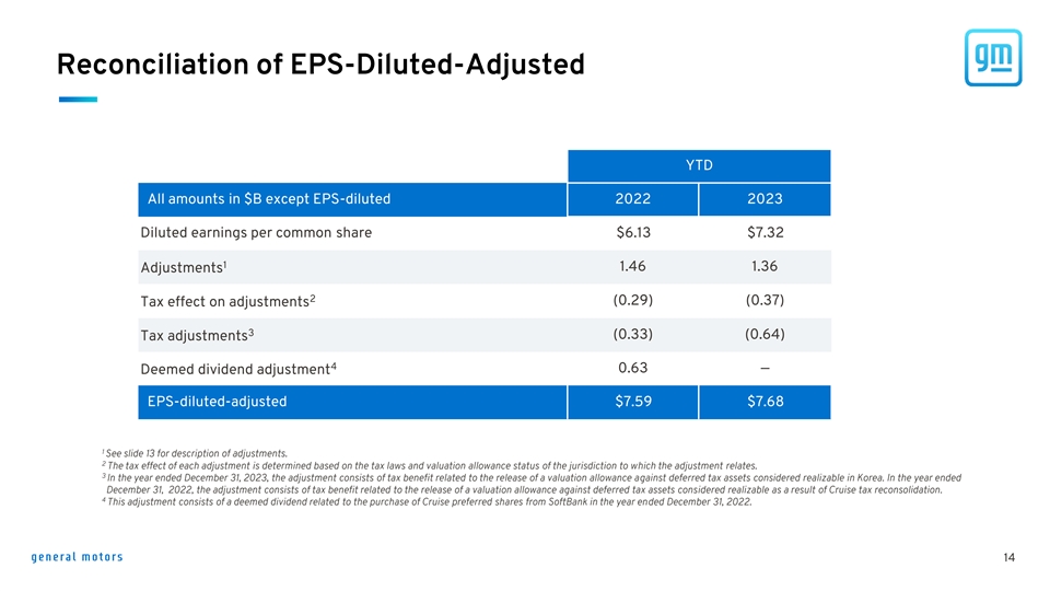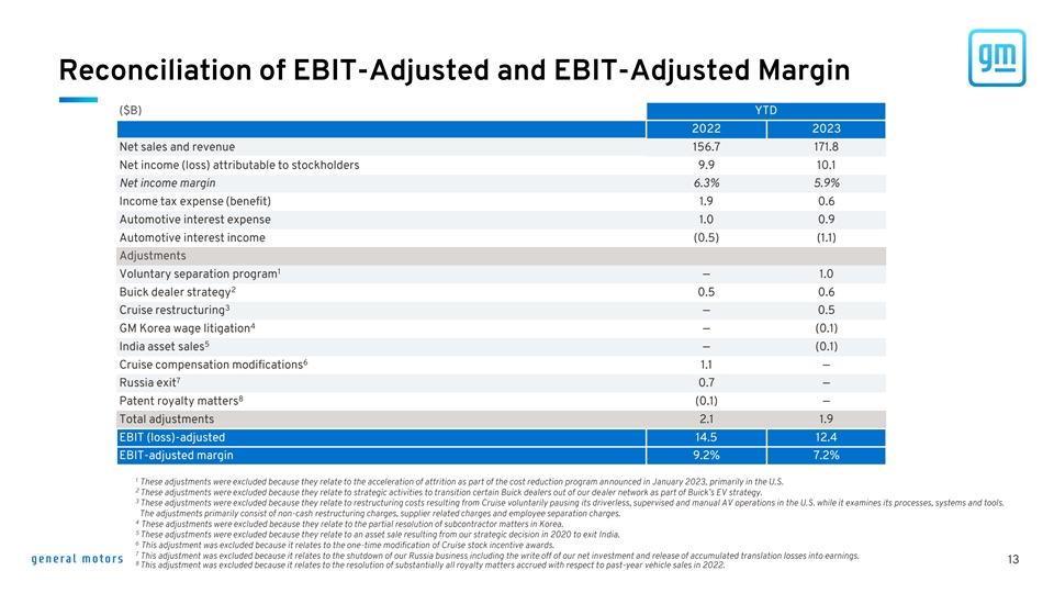 Reconciliation of EBIT-Adjusted and EBIT-Adjusted Margin ($B) YTD 2022 2023 Net sales and revenue 156.7 171.8 Net income (loss) attributable to stockholders 9.9 10.1 Net income margin 6.3% 5.9% Income tax expense (benefit) 1.9 0.6 Automotive interest expense 1.0 0.9 Automotive interest income (0.5) (1.1) Adjustments 1 Voluntary separation program— 1.0 2 Buick dealer strategy 0.5 0.6 3 Cruise restructuring— 0.5 4 GM Korea wage litigation— (0.1) 5 India asset sales— (0.1) 6 Cruise compensation modifications 1.1— 7 Russia exit 0.7— 8 Patent royalty matters (0.1)— Total adjustments 2.1 1.9 EBIT (loss)-adjusted 14.5 12.4 EBIT-adjusted margin 9.2% 7.2% 1 These adjustments were excluded because they relate to the acceleration of attrition as part of the cost reduction program announced in January 2023, primarily in the U.S. 2 These adjustments were excluded because they relate to strategic activities to transition certain Buick dealers out of our dealer network as part of Buick’s EV strategy. 3 These adjustments were excluded because they relate to restructuring costs resulting from Cruise voluntarily pausing its driverless, supervised and manual AV operations in the U.S. while it examines its processes, systems and tools. The adjustments primarily consist of non-cash restructuring charges, supplier related charges and employee separation charges. 4 These adjustments were excluded because they relate to the partial resolution of subcontractor matters in Korea. 5 These adjustments were excluded because they relate to an asset sale resulting from our strategic decision in 2020 to exit India. 6 This adjustment was excluded because it relates to the one-time modification of Cruise stock incentive awards. 7 This adjustment was excluded because it relates to the shutdown of our Russia business including the write off of our net investment and release of accumulated translation losses into earnings. 13 8 This adjustment was excluded because it relates to the resolution of substantially all royalty matters accrued with respect to past-year vehicle sales in 2022.