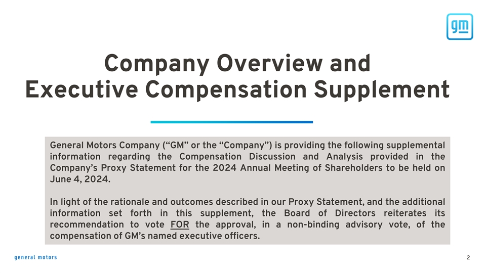 Company Overview and Executive Compensation Supplement General Motors Company (“GM” or the “Company”) is providing the following supplemental information regarding the Compensation Discussion and Analysis provided in the Company’s Proxy Statement for the 2024 Annual Meeting of Shareholders to be held on June 4, 2024. In light of the rationale and outcomes described in our Proxy Statement, and the additional information set forth in this supplement, the Board of Directors reiterates its recommendation to vote FOR the approval, in a non-binding advisory vote, of the compensation of GM’s named executive officers. 2