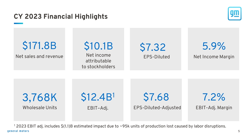 CY 2023 Financial Highlights $171.8B $10.1B 5.9% $7.32 Net income Net sales and revenue EPS-Diluted Net Income Margin attributable to stockholders 1 $12.4B $7.68 7.2% 3,768K Wholesale Units EPS-Diluted-Adjusted EBIT-Adj. Margin EBIT–Adj. 1 2023 EBIT adj. includes $(1.1)B estimated impact due to ~95k units of production lost caused by labor disruptions. 5
