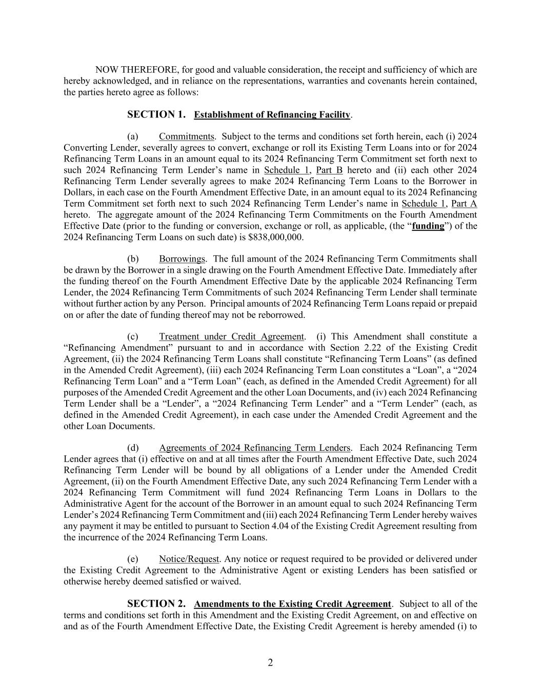 2 NOW THEREFORE, for good and valuable consideration, the receipt and sufficiency of which are hereby acknowledged, and in reliance on the representations, warranties and covenants herein contained, the parties hereto agree as follows: SECTION 1. Establishment of Refinancing Facility. (a) Commitments. Subject to the terms and conditions set forth herein, each (i) 2024 Converting Lender, severally agrees to convert, exchange or roll its Existing Term Loans into or for 2024 Refinancing Term Loans in an amount equal to its 2024 Refinancing Term Commitment set forth next to such 2024 Refinancing Term Lender’s name in Schedule 1, Part B hereto and (ii) each other 2024 Refinancing Term Lender severally agrees to make 2024 Refinancing Term Loans to the Borrower in Dollars, in each case on the Fourth Amendment Effective Date, in an amount equal to its 2024 Refinancing Term Commitment set forth next to such 2024 Refinancing Term Lender’s name in Schedule 1, Part A hereto. The aggregate amount of the 2024 Refinancing Term Commitments on the Fourth Amendment Effective Date (prior to the funding or conversion, exchange or roll, as applicable, (the “funding”) of the 2024 Refinancing Term Loans on such date) is $838,000,000. (b) Borrowings. The full amount of the 2024 Refinancing Term Commitments shall be drawn by the Borrower in a single drawing on the Fourth Amendment Effective Date. Immediately after the funding thereof on the Fourth Amendment Effective Date by the applicable 2024 Refinancing Term Lender, the 2024 Refinancing Term Commitments of such 2024 Refinancing Term Lender shall terminate without further action by any Person. Principal amounts of 2024 Refinancing Term Loans repaid or prepaid on or after the date of funding thereof may not be reborrowed. (c) Treatment under Credit Agreement. (i) This Amendment shall constitute a “Refinancing Amendment” pursuant to and in accordance with Section 2.22 of the Existing Credit Agreement, (ii) the 2024 Refinancing Term Loans shall constitute “Refinancing Term Loans” (as defined in the Amended Credit Agreement), (iii) each 2024 Refinancing Term Loan constitutes a “Loan”, a “2024 Refinancing Term Loan” and a “Term Loan” (each, as defined in the Amended Credit Agreement) for all purposes of the Amended Credit Agreement and the other Loan Documents, and (iv) each 2024 Refinancing Term Lender shall be a “Lender”, a “2024 Refinancing Term Lender” and a “Term Lender” (each, as defined in the Amended Credit Agreement), in each case under the Amended Credit Agreement and the other Loan Documents. (d) Agreements of 2024 Refinancing Term Lenders. Each 2024 Refinancing Term Lender agrees that (i) effective on and at all times after the Fourth Amendment Effective Date, such 2024 Refinancing Term Lender will be bound by all obligations of a Lender under the Amended Credit Agreement, (ii) on the Fourth Amendment Effective Date, any such 2024 Refinancing Term Lender with a 2024 Refinancing Term Commitment will fund 2024 Refinancing Term Loans in Dollars to the Administrative Agent for the account of the Borrower in an amount equal to such 2024 Refinancing Term Lender’s 2024 Refinancing Term Commitment and (iii) each 2024 Refinancing Term Lender hereby waives any payment it may be entitled to pursuant to Section 4.04 of the Existing Credit Agreement resulting from the incurrence of the 2024 Refinancing Term Loans. (e) Notice/Request. Any notice or request required to be provided or delivered under the Existing Credit Agreement to the Administrative Agent or existing Lenders has been satisfied or otherwise hereby deemed satisfied or waived. SECTION 2. Amendments to the Existing Credit Agreement. Subject to all of the terms and conditions set forth in this Amendment and the Existing Credit Agreement, on and effective on and as of the Fourth Amendment Effective Date, the Existing Credit Agreement is hereby amended (i) to