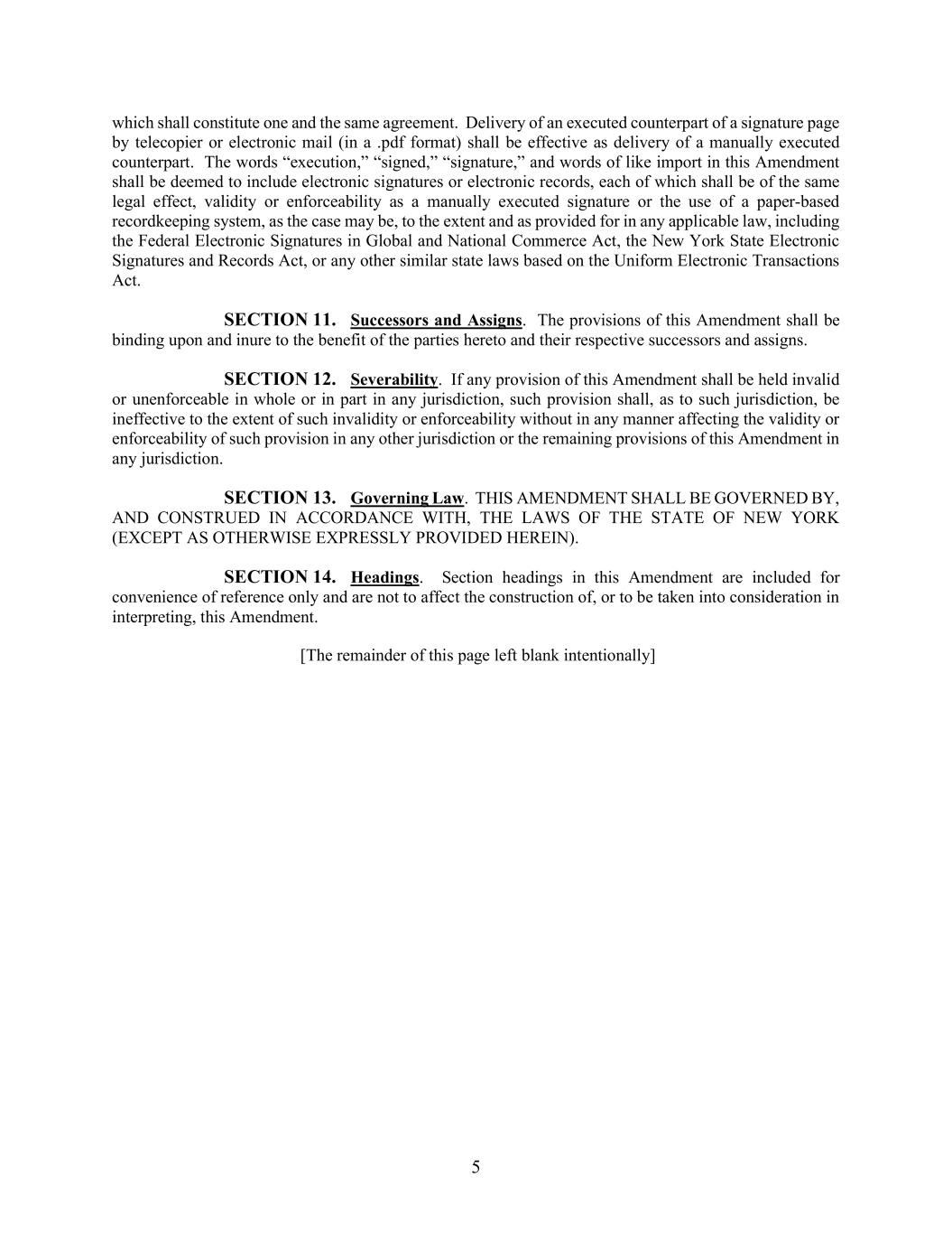 5 which shall constitute one and the same agreement. Delivery of an executed counterpart of a signature page by telecopier or electronic mail (in a .pdf format) shall be effective as delivery of a manually executed counterpart. The words “execution,” “signed,” “signature,” and words of like import in this Amendment shall be deemed to include electronic signatures or electronic records, each of which shall be of the same legal effect, validity or enforceability as a manually executed signature or the use of a paper-based recordkeeping system, as the case may be, to the extent and as provided for in any applicable law, including the Federal Electronic Signatures in Global and National Commerce Act, the New York State Electronic Signatures and Records Act, or any other similar state laws based on the Uniform Electronic Transactions Act. SECTION 11. Successors and Assigns. The provisions of this Amendment shall be binding upon and inure to the benefit of the parties hereto and their respective successors and assigns. SECTION 12. Severability. If any provision of this Amendment shall be held invalid or unenforceable in whole or in part in any jurisdiction, such provision shall, as to such jurisdiction, be ineffective to the extent of such invalidity or enforceability without in any manner affecting the validity or enforceability of such provision in any other jurisdiction or the remaining provisions of this Amendment in any jurisdiction. SECTION 13. Governing Law. THIS AMENDMENT SHALL BE GOVERNED BY, AND CONSTRUED IN ACCORDANCE WITH, THE LAWS OF THE STATE OF NEW YORK (EXCEPT AS OTHERWISE EXPRESSLY PROVIDED HEREIN). SECTION 14. Headings. Section headings in this Amendment are included for convenience of reference only and are not to affect the construction of, or to be taken into consideration in interpreting, this Amendment. [The remainder of this page left blank intentionally]
