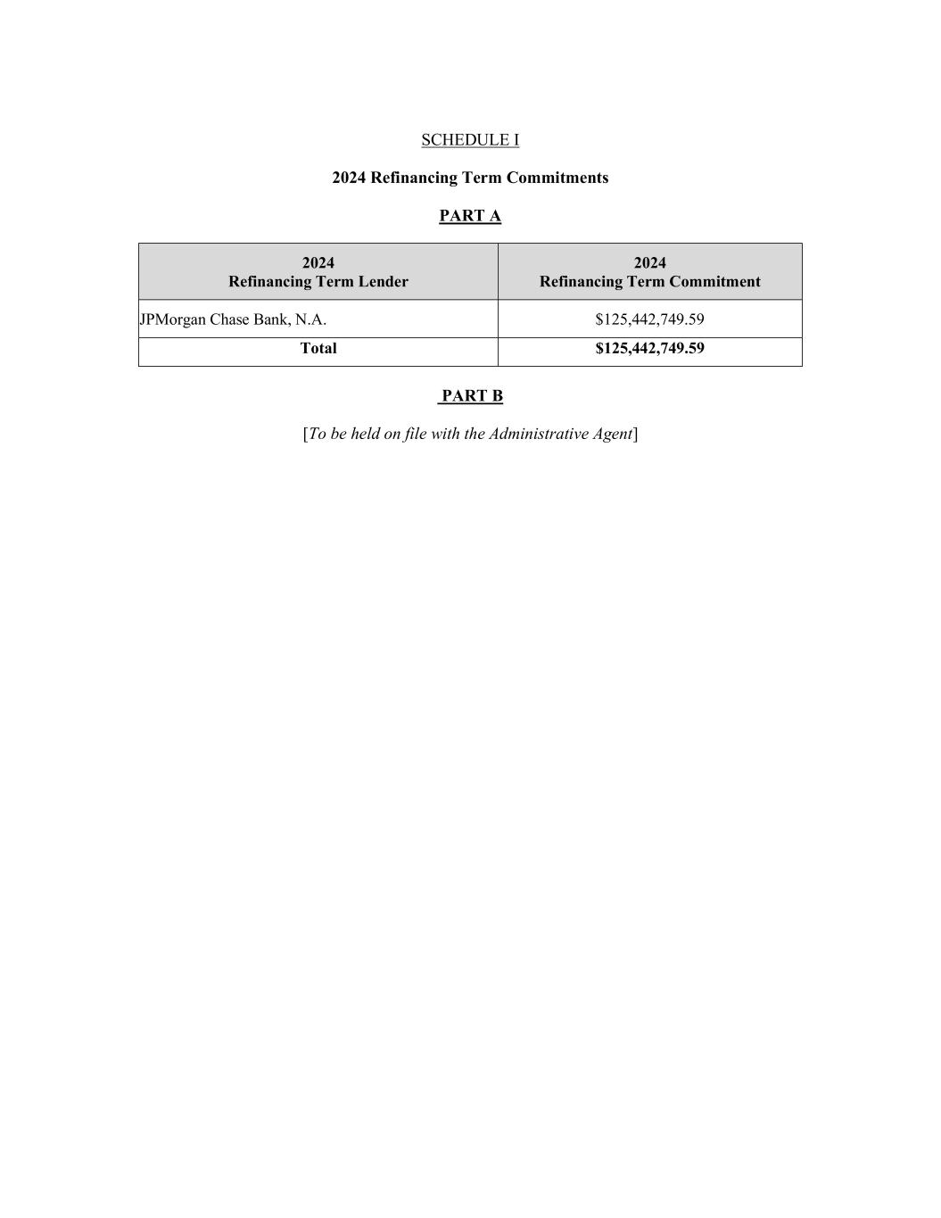 SCHEDULE I 2024 Refinancing Term Commitments PART A 2024 Refinancing Term Lender 2024 Refinancing Term Commitment JPMorgan Chase Bank, N.A. $125,442,749.59 Total $125,442,749.59 PART B [To be held on file with the Administrative Agent]
