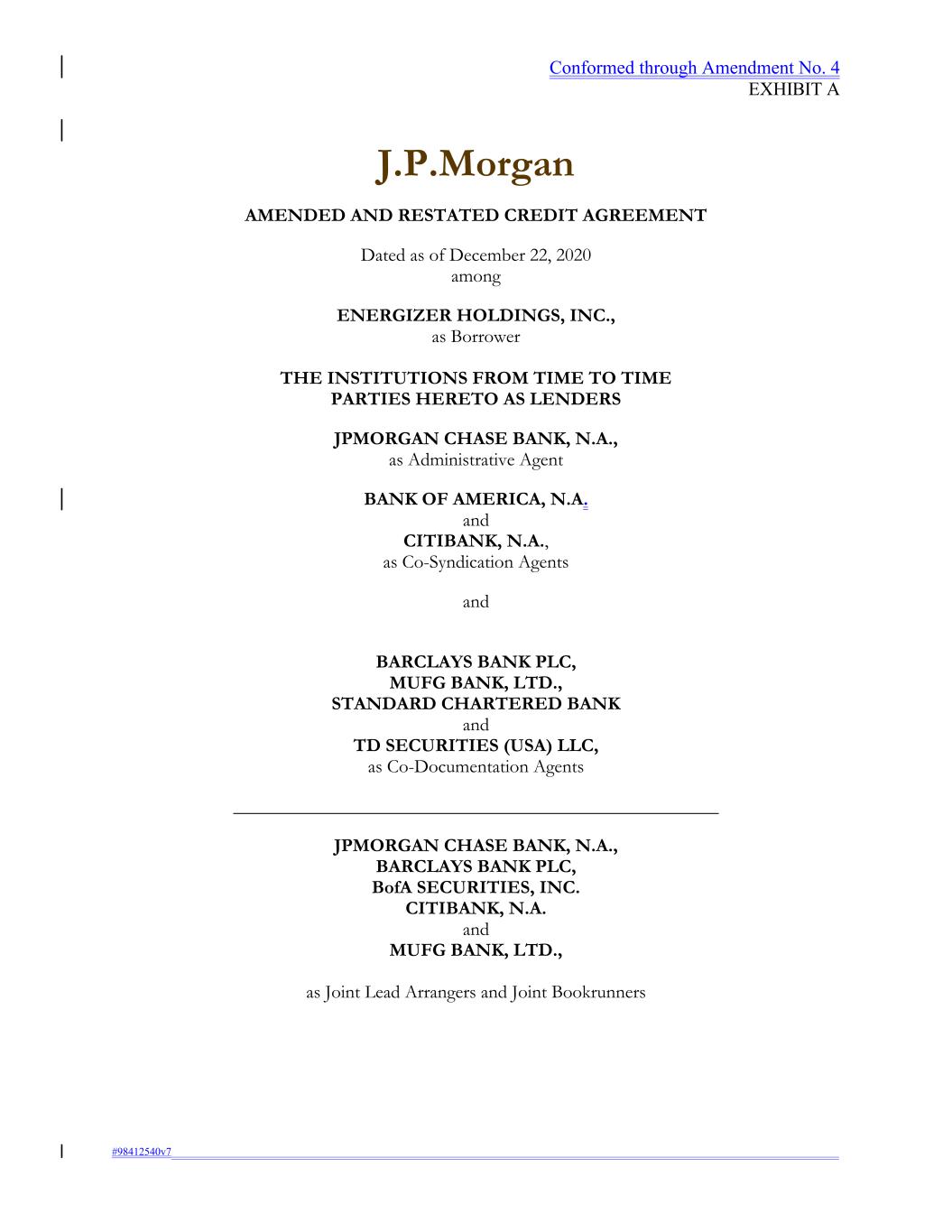 Conformed through Amendment No. 4 EXHIBIT A J.P.Morgan AMENDED AND RESTATED CREDIT AGREEMENT Dated as of December 22, 2020 among ENERGIZER HOLDINGS, INC., as Borrower THE INSTITUTIONS FROM TIME TO TIME PARTIES HERETO AS LENDERS JPMORGAN CHASE BANK, N.A., as Administrative Agent BANK OF AMERICA, N.A. and CITIBANK, N.A., as Co-Syndication Agents and BARCLAYS BANK PLC, MUFG BANK, LTD., STANDARD CHARTERED BANK and TD SECURITIES (USA) LLC, as Co-Documentation Agents ____________________________________________________ JPMORGAN CHASE BANK, N.A., BARCLAYS BANK PLC, BofA SECURITIES, INC. CITIBANK, N.A. and MUFG BANK, LTD., as Joint Lead Arrangers and Joint Bookrunners #98412540v7