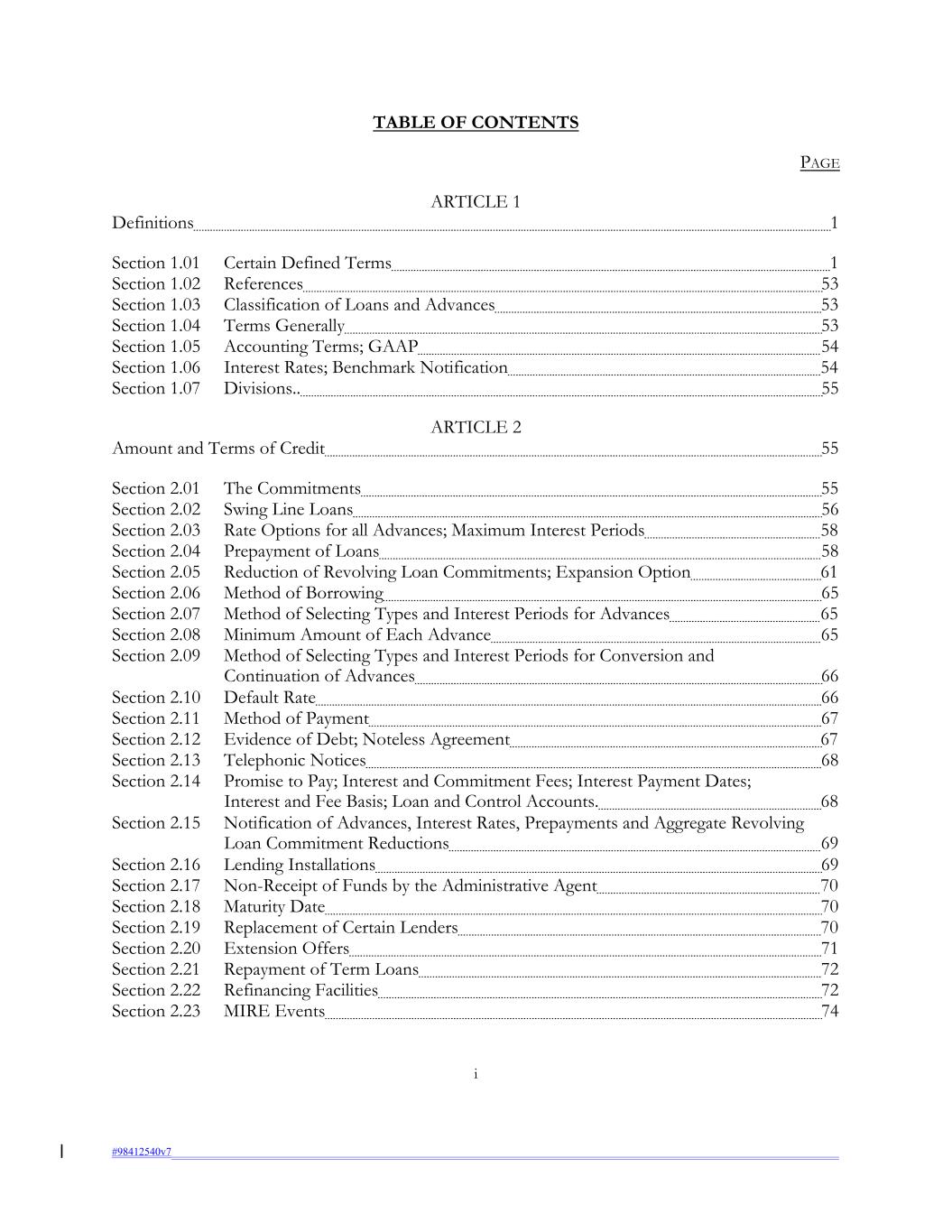 TABLE OF CONTENTS PAGE ARTICLE 1 Definitions 1 Section 1.01 Certain Defined Terms 1 Section 1.02 References 53 Section 1.03 Classification of Loans and Advances 53 Section 1.04 Terms Generally 53 Section 1.05 Accounting Terms; GAAP 54 Section 1.06 Interest Rates; Benchmark Notification 54 Section 1.07 Divisions.. 55 ARTICLE 2 Amount and Terms of Credit 55 Section 2.01 The Commitments 55 Section 2.02 Swing Line Loans 56 Section 2.03 Rate Options for all Advances; Maximum Interest Periods 58 Section 2.04 Prepayment of Loans 58 Section 2.05 Reduction of Revolving Loan Commitments; Expansion Option 61 Section 2.06 Method of Borrowing 65 Section 2.07 Method of Selecting Types and Interest Periods for Advances 65 Section 2.08 Minimum Amount of Each Advance 65 Section 2.09 Method of Selecting Types and Interest Periods for Conversion and Continuation of Advances 66 Section 2.10 Default Rate 66 Section 2.11 Method of Payment 67 Section 2.12 Evidence of Debt; Noteless Agreement 67 Section 2.13 Telephonic Notices 68 Section 2.14 Promise to Pay; Interest and Commitment Fees; Interest Payment Dates; Interest and Fee Basis; Loan and Control Accounts. 68 Section 2.15 Notification of Advances, Interest Rates, Prepayments and Aggregate Revolving Loan Commitment Reductions 69 Section 2.16 Lending Installations 69 Section 2.17 Non-Receipt of Funds by the Administrative Agent 70 Section 2.18 Maturity Date 70 Section 2.19 Replacement of Certain Lenders 70 Section 2.20 Extension Offers 71 Section 2.21 Repayment of Term Loans 72 Section 2.22 Refinancing Facilities 72 Section 2.23 MIRE Events 74 i #98412540v7