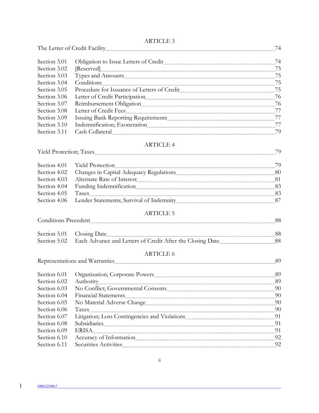 ARTICLE 3 The Letter of Credit Facility 74 Section 3.01 Obligation to Issue Letters of Credit 74 Section 3.02 [Reserved] 75 Section 3.03 Types and Amounts 75 Section 3.04 Conditions 75 Section 3.05 Procedure for Issuance of Letters of Credit 75 Section 3.06 Letter of Credit Participation 76 Section 3.07 Reimbursement Obligation 76 Section 3.08 Letter of Credit Fees 77 Section 3.09 Issuing Bank Reporting Requirements 77 Section 3.10 Indemnification; Exoneration 77 Section 3.11 Cash Collateral 79 ARTICLE 4 Yield Protection; Taxes 79 Section 4.01 Yield Protection 79 Section 4.02 Changes in Capital Adequacy Regulations 80 Section 4.03 Alternate Rate of Interest 81 Section 4.04 Funding Indemnification 83 Section 4.05 Taxes 83 Section 4.06 Lender Statements; Survival of Indemnity 87 ARTICLE 5 Conditions Precedent 88 Section 5.01 Closing Date 88 Section 5.02 Each Advance and Letters of Credit After the Closing Date 88 ARTICLE 6 Representations and Warranties 89 Section 6.01 Organization; Corporate Powers 89 Section 6.02 Authority 89 Section 6.03 No Conflict; Governmental Consents 90 Section 6.04 Financial Statements 90 Section 6.05 No Material Adverse Change 90 Section 6.06 Taxes 90 Section 6.07 Litigation; Loss Contingencies and Violations 91 Section 6.08 Subsidiaries 91 Section 6.09 ERISA. 91 Section 6.10 Accuracy of Information 92 Section 6.11 Securities Activities 92 ii #98412540v7