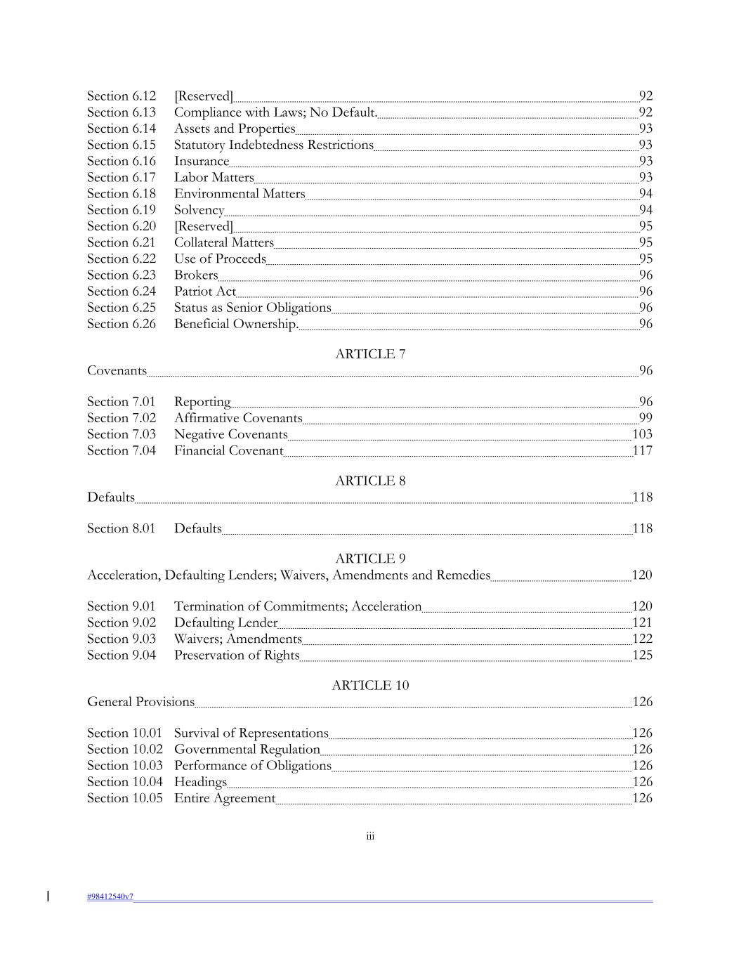 Section 6.12 [Reserved] 92 Section 6.13 Compliance with Laws; No Default. 92 Section 6.14 Assets and Properties 93 Section 6.15 Statutory Indebtedness Restrictions 93 Section 6.16 Insurance 93 Section 6.17 Labor Matters 93 Section 6.18 Environmental Matters 94 Section 6.19 Solvency 94 Section 6.20 [Reserved] 95 Section 6.21 Collateral Matters 95 Section 6.22 Use of Proceeds 95 Section 6.23 Brokers 96 Section 6.24 Patriot Act 96 Section 6.25 Status as Senior Obligations 96 Section 6.26 Beneficial Ownership. 96 ARTICLE 7 Covenants 96 Section 7.01 Reporting 96 Section 7.02 Affirmative Covenants 99 Section 7.03 Negative Covenants 103 Section 7.04 Financial Covenant 117 ARTICLE 8 Defaults 118 Section 8.01 Defaults 118 ARTICLE 9 Acceleration, Defaulting Lenders; Waivers, Amendments and Remedies 120 Section 9.01 Termination of Commitments; Acceleration 120 Section 9.02 Defaulting Lender 121 Section 9.03 Waivers; Amendments 122 Section 9.04 Preservation of Rights 125 ARTICLE 10 General Provisions 126 Section 10.01 Survival of Representations 126 Section 10.02 Governmental Regulation 126 Section 10.03 Performance of Obligations 126 Section 10.04 Headings 126 Section 10.05 Entire Agreement 126 iii #98412540v7