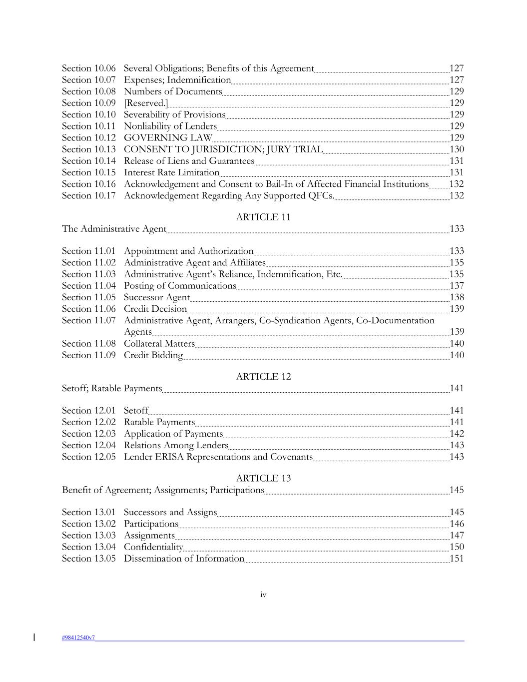 Section 10.06 Several Obligations; Benefits of this Agreement 127 Section 10.07 Expenses; Indemnification 127 Section 10.08 Numbers of Documents 129 Section 10.09 [Reserved.] 129 Section 10.10 Severability of Provisions 129 Section 10.11 Nonliability of Lenders 129 Section 10.12 GOVERNING LAW 129 Section 10.13 CONSENT TO JURISDICTION; JURY TRIAL 130 Section 10.14 Release of Liens and Guarantees 131 Section 10.15 Interest Rate Limitation 131 Section 10.16 Acknowledgement and Consent to Bail-In of Affected Financial Institutions 132 Section 10.17 Acknowledgement Regarding Any Supported QFCs. 132 ARTICLE 11 The Administrative Agent 133 Section 11.01 Appointment and Authorization 133 Section 11.02 Administrative Agent and Affiliates 135 Section 11.03 Administrative Agent’s Reliance, Indemnification, Etc. 135 Section 11.04 Posting of Communications 137 Section 11.05 Successor Agent 138 Section 11.06 Credit Decision 139 Section 11.07 Administrative Agent, Arrangers, Co-Syndication Agents, Co-Documentation Agents 139 Section 11.08 Collateral Matters 140 Section 11.09 Credit Bidding 140 ARTICLE 12 Setoff; Ratable Payments 141 Section 12.01 Setoff 141 Section 12.02 Ratable Payments 141 Section 12.03 Application of Payments 142 Section 12.04 Relations Among Lenders 143 Section 12.05 Lender ERISA Representations and Covenants 143 ARTICLE 13 Benefit of Agreement; Assignments; Participations 145 Section 13.01 Successors and Assigns 145 Section 13.02 Participations 146 Section 13.03 Assignments 147 Section 13.04 Confidentiality 150 Section 13.05 Dissemination of Information 151 iv #98412540v7