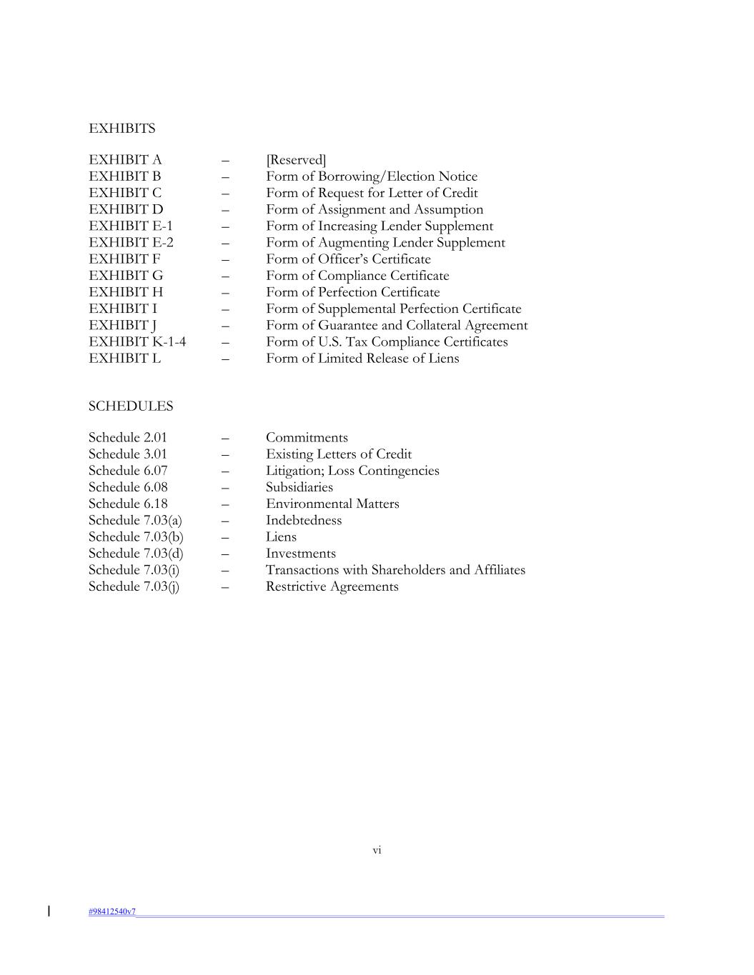 EXHIBITS EXHIBIT A – [Reserved] EXHIBIT B – Form of Borrowing/Election Notice EXHIBIT C – Form of Request for Letter of Credit EXHIBIT D – Form of Assignment and Assumption EXHIBIT E-1 – Form of Increasing Lender Supplement EXHIBIT E-2 – Form of Augmenting Lender Supplement EXHIBIT F – Form of Officer’s Certificate EXHIBIT G – Form of Compliance Certificate EXHIBIT H – Form of Perfection Certificate EXHIBIT I – Form of Supplemental Perfection Certificate EXHIBIT J – Form of Guarantee and Collateral Agreement EXHIBIT K-1-4 – Form of U.S. Tax Compliance Certificates EXHIBIT L – Form of Limited Release of Liens SCHEDULES Schedule 2.01 – Commitments Schedule 3.01 – Existing Letters of Credit Schedule 6.07 – Litigation; Loss Contingencies Schedule 6.08 – Subsidiaries Schedule 6.18 – Environmental Matters Schedule 7.03(a) – Indebtedness Schedule 7.03(b) – Liens Schedule 7.03(d) – Investments Schedule 7.03(i) – Transactions with Shareholders and Affiliates Schedule 7.03(j) – Restrictive Agreements vi #98412540v7