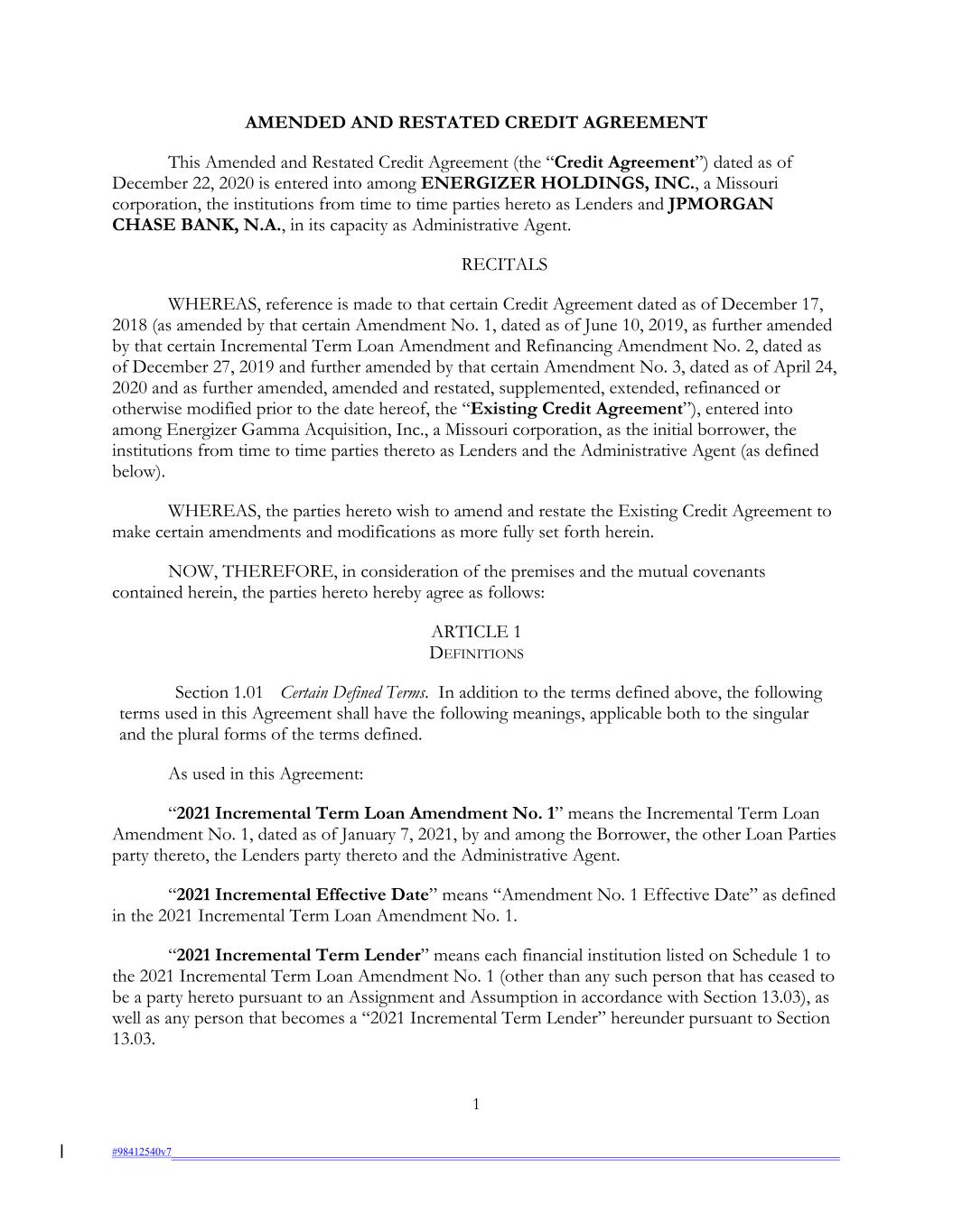 AMENDED AND RESTATED CREDIT AGREEMENT This Amended and Restated Credit Agreement (the “Credit Agreement”) dated as of December 22, 2020 is entered into among ENERGIZER HOLDINGS, INC., a Missouri corporation, the institutions from time to time parties hereto as Lenders and JPMORGAN CHASE BANK, N.A., in its capacity as Administrative Agent. RECITALS WHEREAS, reference is made to that certain Credit Agreement dated as of December 17, 2018 (as amended by that certain Amendment No. 1, dated as of June 10, 2019, as further amended by that certain Incremental Term Loan Amendment and Refinancing Amendment No. 2, dated as of December 27, 2019 and further amended by that certain Amendment No. 3, dated as of April 24, 2020 and as further amended, amended and restated, supplemented, extended, refinanced or otherwise modified prior to the date hereof, the “Existing Credit Agreement”), entered into among Energizer Gamma Acquisition, Inc., a Missouri corporation, as the initial borrower, the institutions from time to time parties thereto as Lenders and the Administrative Agent (as defined below). WHEREAS, the parties hereto wish to amend and restate the Existing Credit Agreement to make certain amendments and modifications as more fully set forth herein. NOW, THEREFORE, in consideration of the premises and the mutual covenants contained herein, the parties hereto hereby agree as follows: ARTICLE 1 DEFINITIONS Section 1.01 Certain Defined Terms. In addition to the terms defined above, the following terms used in this Agreement shall have the following meanings, applicable both to the singular and the plural forms of the terms defined. As used in this Agreement: “2021 Incremental Term Loan Amendment No. 1” means the Incremental Term Loan Amendment No. 1, dated as of January 7, 2021, by and among the Borrower, the other Loan Parties party thereto, the Lenders party thereto and the Administrative Agent. “2021 Incremental Effective Date” means “Amendment No. 1 Effective Date” as defined in the 2021 Incremental Term Loan Amendment No. 1. “2021 Incremental Term Lender” means each financial institution listed on Schedule 1 to the 2021 Incremental Term Loan Amendment No. 1 (other than any such person that has ceased to be a party hereto pursuant to an Assignment and Assumption in accordance with Section 13.03), as well as any person that becomes a “2021 Incremental Term Lender” hereunder pursuant to Section 13.03. 1 #98412540v7
