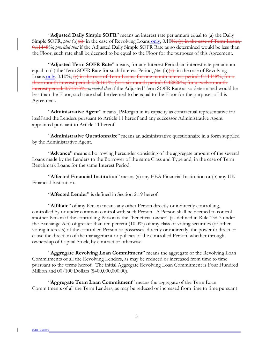 “Adjusted Daily Simple SOFR” means an interest rate per annum equal to (a) the Daily Simple SOFR, plus (b)(x) in the case of Revolving Loans only, 0.10%; (y) in the case of Term Loans, 0.11448%; provided that if the Adjusted Daily Simple SOFR Rate as so determined would be less than the Floor, such rate shall be deemed to be equal to the Floor for the purposes of this Agreement. “Adjusted Term SOFR Rate” means, for any Interest Period, an interest rate per annum equal to (a) the Term SOFR Rate for such Interest Period, plus (b)(x) in the case of Revolving Loans only, 0.10%; (y) in the case of Term Loans, for one month interest period: 0.11448%, for a three month interest period: 0.26161%, for a six month period: 0.42826%; for a twelve month interest period: 0.71513%, provided that if the Adjusted Term SOFR Rate as so determined would be less than the Floor, such rate shall be deemed to be equal to the Floor for the purposes of this Agreement. “Administrative Agent” means JPMorgan in its capacity as contractual representative for itself and the Lenders pursuant to Article 11 hereof and any successor Administrative Agent appointed pursuant to Article 11 hereof. “Administrative Questionnaire” means an administrative questionnaire in a form supplied by the Administrative Agent. “Advance” means a borrowing hereunder consisting of the aggregate amount of the several Loans made by the Lenders to the Borrower of the same Class and Type and, in the case of Term Benchmark Loans for the same Interest Period. “Affected Financial Institution” means (a) any EEA Financial Institution or (b) any UK Financial Institution. “Affected Lender” is defined in Section 2.19 hereof. “Affiliate” of any Person means any other Person directly or indirectly controlling, controlled by or under common control with such Person. A Person shall be deemed to control another Person if the controlling Person is the “beneficial owner” (as defined in Rule 13d-3 under the Exchange Act) of greater than ten percent (10.0%) of any class of voting securities (or other voting interests) of the controlled Person or possesses, directly or indirectly, the power to direct or cause the direction of the management or policies of the controlled Person, whether through ownership of Capital Stock, by contract or otherwise. “Aggregate Revolving Loan Commitment” means the aggregate of the Revolving Loan Commitments of all the Revolving Lenders, as may be reduced or increased from time to time pursuant to the terms hereof. The initial Aggregate Revolving Loan Commitment is Four Hundred Million and 00/100 Dollars ($400,000,000.00). “Aggregate Term Loan Commitment” means the aggregate of the Term Loan Commitments of all the Term Lenders, as may be reduced or increased from time to time pursuant 3 #98412540v7