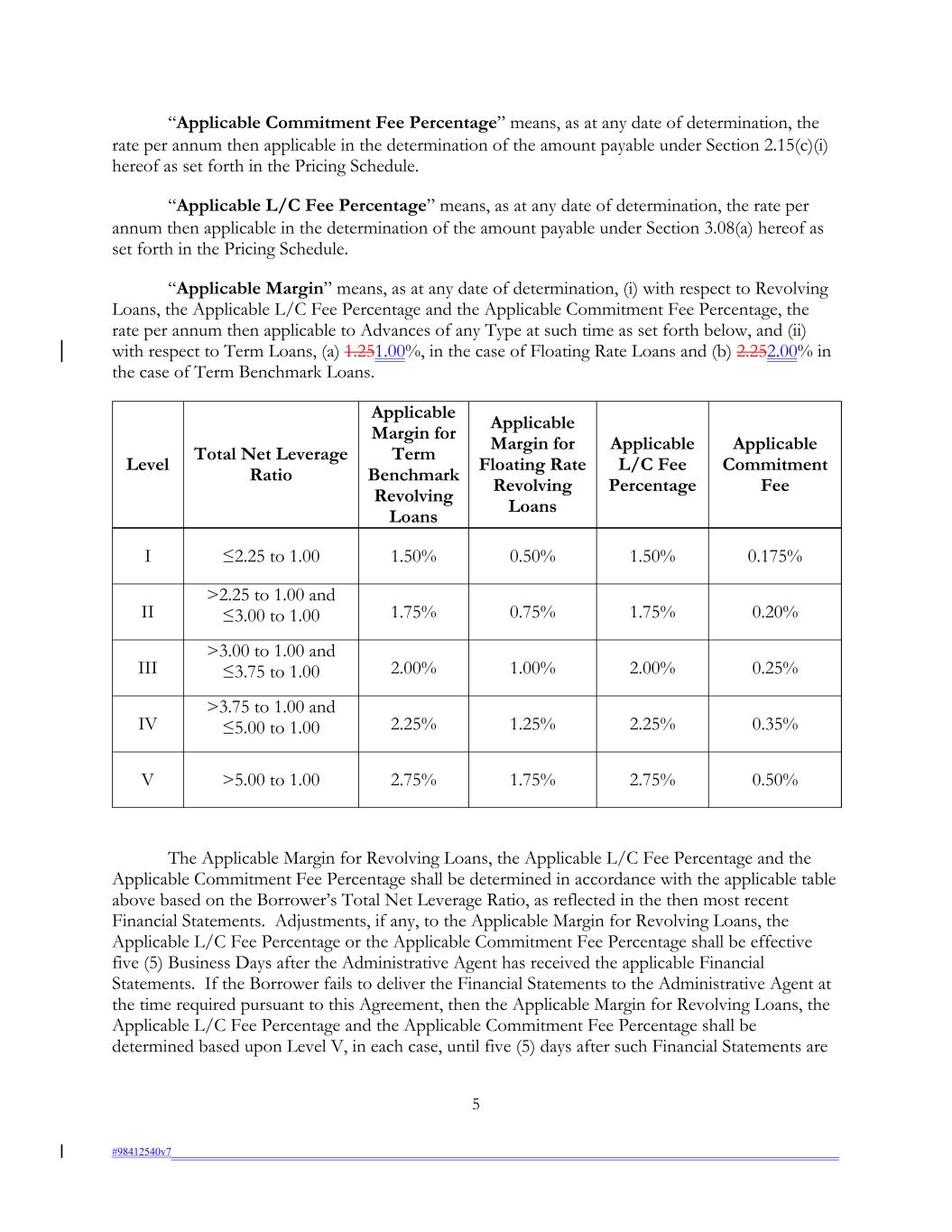 5 #98412540v7 0.20% “Applicable Commitment Fee Percentage” means, as at any date of determination, the rate per annum then applicable in the determination of the amount payable under Section 2.15(c)(i) hereof as set forth in the Pricing Schedule. “Applicable L/C Fee Percentage” means, as at any date of determination, the rate per annum then applicable in the determination of the amount payable under Section 3.08(a) hereof as set forth in the Pricing Schedule. “Applicable Margin” means, as at any date of determination, (i) with respect to Revolving Loans, the Applicable L/C Fee Percentage and the Applicable Commitment Fee Percentage, the rate per annum then applicable to Advances of any Type at such time as set forth below, and (ii) with respect to Term Loans, (a) 1.251.00%, in the case of Floating Rate Loans and (b) 2.252.00% in the case of Term Benchmark Loans. ≤2.25 to 1.00 III Applicable Margin for Term Benchmark Revolving Loans >3.00 to 1.00 and ≤3.75 to 1.00 1.50% 2.00% 1.00% 0.50% 2.00% Applicable Margin for Floating Rate Revolving Loans 0.25% 1.50% IV 0.175% >3.75 to 1.00 and ≤5.00 to 1.00 Applicable L/C Fee Percentage 2.25% 1.25% Level 2.25% II 0.35% Applicable Commitment Fee >2.25 to 1.00 and ≤3.00 to 1.00 V >5.00 to 1.00 1.75% 2.75% 1.75% 0.75% 2.75% Total Net Leverage Ratio 0.50% 1.75% The Applicable Margin for Revolving Loans, the Applicable L/C Fee Percentage and the Applicable Commitment Fee Percentage shall be determined in accordance with the applicable table above based on the Borrower’s Total Net Leverage Ratio, as reflected in the then most recent Financial Statements. Adjustments, if any, to the Applicable Margin for Revolving Loans, the Applicable L/C Fee Percentage or the Applicable Commitment Fee Percentage shall be effective five (5) Business Days after the Administrative Agent has received the applicable Financial Statements. If the Borrower fails to deliver the Financial Statements to the Administrative Agent at the time required pursuant to this Agreement, then the Applicable Margin for Revolving Loans, the Applicable L/C Fee Percentage and the Applicable Commitment Fee Percentage shall be determined based upon Level V, in each case, until five (5) days after such Financial Statements are I