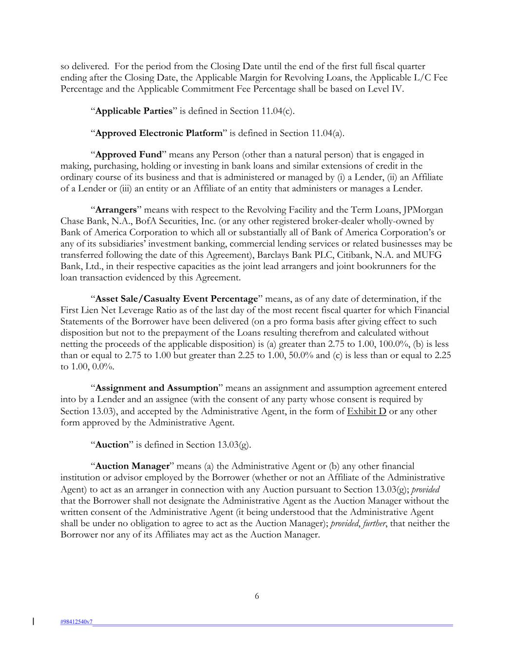so delivered. For the period from the Closing Date until the end of the first full fiscal quarter ending after the Closing Date, the Applicable Margin for Revolving Loans, the Applicable L/C Fee Percentage and the Applicable Commitment Fee Percentage shall be based on Level IV. “Applicable Parties” is defined in Section 11.04(c). “Approved Electronic Platform” is defined in Section 11.04(a). “Approved Fund” means any Person (other than a natural person) that is engaged in making, purchasing, holding or investing in bank loans and similar extensions of credit in the ordinary course of its business and that is administered or managed by (i) a Lender, (ii) an Affiliate of a Lender or (iii) an entity or an Affiliate of an entity that administers or manages a Lender. “Arrangers” means with respect to the Revolving Facility and the Term Loans, JPMorgan Chase Bank, N.A., BofA Securities, Inc. (or any other registered broker-dealer wholly-owned by Bank of America Corporation to which all or substantially all of Bank of America Corporation’s or any of its subsidiaries’ investment banking, commercial lending services or related businesses may be transferred following the date of this Agreement), Barclays Bank PLC, Citibank, N.A. and MUFG Bank, Ltd., in their respective capacities as the joint lead arrangers and joint bookrunners for the loan transaction evidenced by this Agreement. “Asset Sale/Casualty Event Percentage” means, as of any date of determination, if the First Lien Net Leverage Ratio as of the last day of the most recent fiscal quarter for which Financial Statements of the Borrower have been delivered (on a pro forma basis after giving effect to such disposition but not to the prepayment of the Loans resulting therefrom and calculated without netting the proceeds of the applicable disposition) is (a) greater than 2.75 to 1.00, 100.0%, (b) is less than or equal to 2.75 to 1.00 but greater than 2.25 to 1.00, 50.0% and (c) is less than or equal to 2.25 to 1.00, 0.0%. “Assignment and Assumption” means an assignment and assumption agreement entered into by a Lender and an assignee (with the consent of any party whose consent is required by Section 13.03), and accepted by the Administrative Agent, in the form of Exhibit D or any other form approved by the Administrative Agent. “Auction” is defined in Section 13.03(g). “Auction Manager” means (a) the Administrative Agent or (b) any other financial institution or advisor employed by the Borrower (whether or not an Affiliate of the Administrative Agent) to act as an arranger in connection with any Auction pursuant to Section 13.03(g); provided that the Borrower shall not designate the Administrative Agent as the Auction Manager without the written consent of the Administrative Agent (it being understood that the Administrative Agent shall be under no obligation to agree to act as the Auction Manager); provided, further, that neither the Borrower nor any of its Affiliates may act as the Auction Manager. 6 #98412540v7