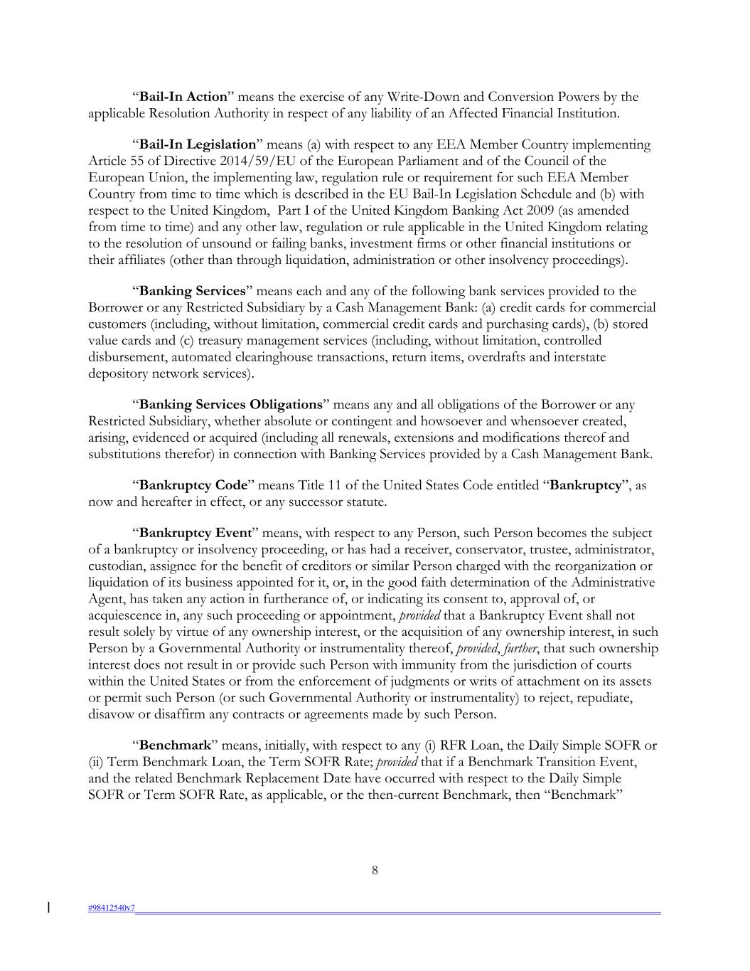 “Bail-In Action” means the exercise of any Write-Down and Conversion Powers by the applicable Resolution Authority in respect of any liability of an Affected Financial Institution. “Bail-In Legislation” means (a) with respect to any EEA Member Country implementing Article 55 of Directive 2014/59/EU of the European Parliament and of the Council of the European Union, the implementing law, regulation rule or requirement for such EEA Member Country from time to time which is described in the EU Bail-In Legislation Schedule and (b) with respect to the United Kingdom, Part I of the United Kingdom Banking Act 2009 (as amended from time to time) and any other law, regulation or rule applicable in the United Kingdom relating to the resolution of unsound or failing banks, investment firms or other financial institutions or their affiliates (other than through liquidation, administration or other insolvency proceedings). “Banking Services” means each and any of the following bank services provided to the Borrower or any Restricted Subsidiary by a Cash Management Bank: (a) credit cards for commercial customers (including, without limitation, commercial credit cards and purchasing cards), (b) stored value cards and (c) treasury management services (including, without limitation, controlled disbursement, automated clearinghouse transactions, return items, overdrafts and interstate depository network services). “Banking Services Obligations” means any and all obligations of the Borrower or any Restricted Subsidiary, whether absolute or contingent and howsoever and whensoever created, arising, evidenced or acquired (including all renewals, extensions and modifications thereof and substitutions therefor) in connection with Banking Services provided by a Cash Management Bank. “Bankruptcy Code” means Title 11 of the United States Code entitled “Bankruptcy”, as now and hereafter in effect, or any successor statute. “Bankruptcy Event” means, with respect to any Person, such Person becomes the subject of a bankruptcy or insolvency proceeding, or has had a receiver, conservator, trustee, administrator, custodian, assignee for the benefit of creditors or similar Person charged with the reorganization or liquidation of its business appointed for it, or, in the good faith determination of the Administrative Agent, has taken any action in furtherance of, or indicating its consent to, approval of, or acquiescence in, any such proceeding or appointment, provided that a Bankruptcy Event shall not result solely by virtue of any ownership interest, or the acquisition of any ownership interest, in such Person by a Governmental Authority or instrumentality thereof, provided, further, that such ownership interest does not result in or provide such Person with immunity from the jurisdiction of courts within the United States or from the enforcement of judgments or writs of attachment on its assets or permit such Person (or such Governmental Authority or instrumentality) to reject, repudiate, disavow or disaffirm any contracts or agreements made by such Person. “Benchmark” means, initially, with respect to any (i) RFR Loan, the Daily Simple SOFR or (ii) Term Benchmark Loan, the Term SOFR Rate; provided that if a Benchmark Transition Event, and the related Benchmark Replacement Date have occurred with respect to the Daily Simple SOFR or Term SOFR Rate, as applicable, or the then-current Benchmark, then “Benchmark” 8 #98412540v7