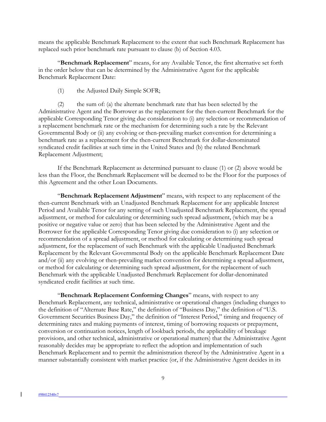 means the applicable Benchmark Replacement to the extent that such Benchmark Replacement has replaced such prior benchmark rate pursuant to clause (b) of Section 4.03. “Benchmark Replacement” means, for any Available Tenor, the first alternative set forth in the order below that can be determined by the Administrative Agent for the applicable Benchmark Replacement Date: (1) the Adjusted Daily Simple SOFR; (2) the sum of: (a) the alternate benchmark rate that has been selected by the Administrative Agent and the Borrower as the replacement for the then-current Benchmark for the applicable Corresponding Tenor giving due consideration to (i) any selection or recommendation of a replacement benchmark rate or the mechanism for determining such a rate by the Relevant Governmental Body or (ii) any evolving or then-prevailing market convention for determining a benchmark rate as a replacement for the then-current Benchmark for dollar-denominated syndicated credit facilities at such time in the United States and (b) the related Benchmark Replacement Adjustment; If the Benchmark Replacement as determined pursuant to clause (1) or (2) above would be less than the Floor, the Benchmark Replacement will be deemed to be the Floor for the purposes of this Agreement and the other Loan Documents. “Benchmark Replacement Adjustment” means, with respect to any replacement of the then-current Benchmark with an Unadjusted Benchmark Replacement for any applicable Interest Period and Available Tenor for any setting of such Unadjusted Benchmark Replacement, the spread adjustment, or method for calculating or determining such spread adjustment, (which may be a positive or negative value or zero) that has been selected by the Administrative Agent and the Borrower for the applicable Corresponding Tenor giving due consideration to (i) any selection or recommendation of a spread adjustment, or method for calculating or determining such spread adjustment, for the replacement of such Benchmark with the applicable Unadjusted Benchmark Replacement by the Relevant Governmental Body on the applicable Benchmark Replacement Date and/or (ii) any evolving or then-prevailing market convention for determining a spread adjustment, or method for calculating or determining such spread adjustment, for the replacement of such Benchmark with the applicable Unadjusted Benchmark Replacement for dollar-denominated syndicated credit facilities at such time. “Benchmark Replacement Conforming Changes” means, with respect to any Benchmark Replacement, any technical, administrative or operational changes (including changes to the definition of “Alternate Base Rate,” the definition of “Business Day,” the definition of “U.S. Government Securities Business Day,” the definition of “Interest Period,” timing and frequency of determining rates and making payments of interest, timing of borrowing requests or prepayment, conversion or continuation notices, length of lookback periods, the applicability of breakage provisions, and other technical, administrative or operational matters) that the Administrative Agent reasonably decides may be appropriate to reflect the adoption and implementation of such Benchmark Replacement and to permit the administration thereof by the Administrative Agent in a manner substantially consistent with market practice (or, if the Administrative Agent decides in its 9 #98412540v7